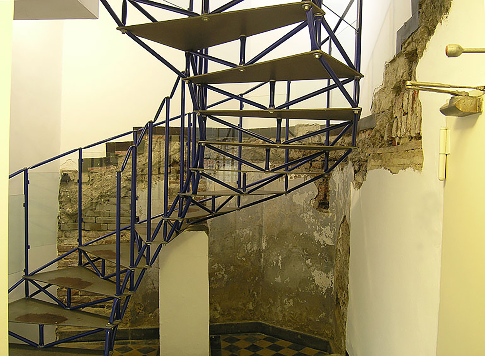 Das erste und zweite Foto zeigen das Obergeschoss im Kugel-Kino, die Fotos 3 bis 7 zeigen den Shop im Erdgeschoss. Auf dem Farbfoto beobachtet die Geschäftsführerin der Museumstechnik GmbH, Sybille Fanelsa, die Bauarbeiten.