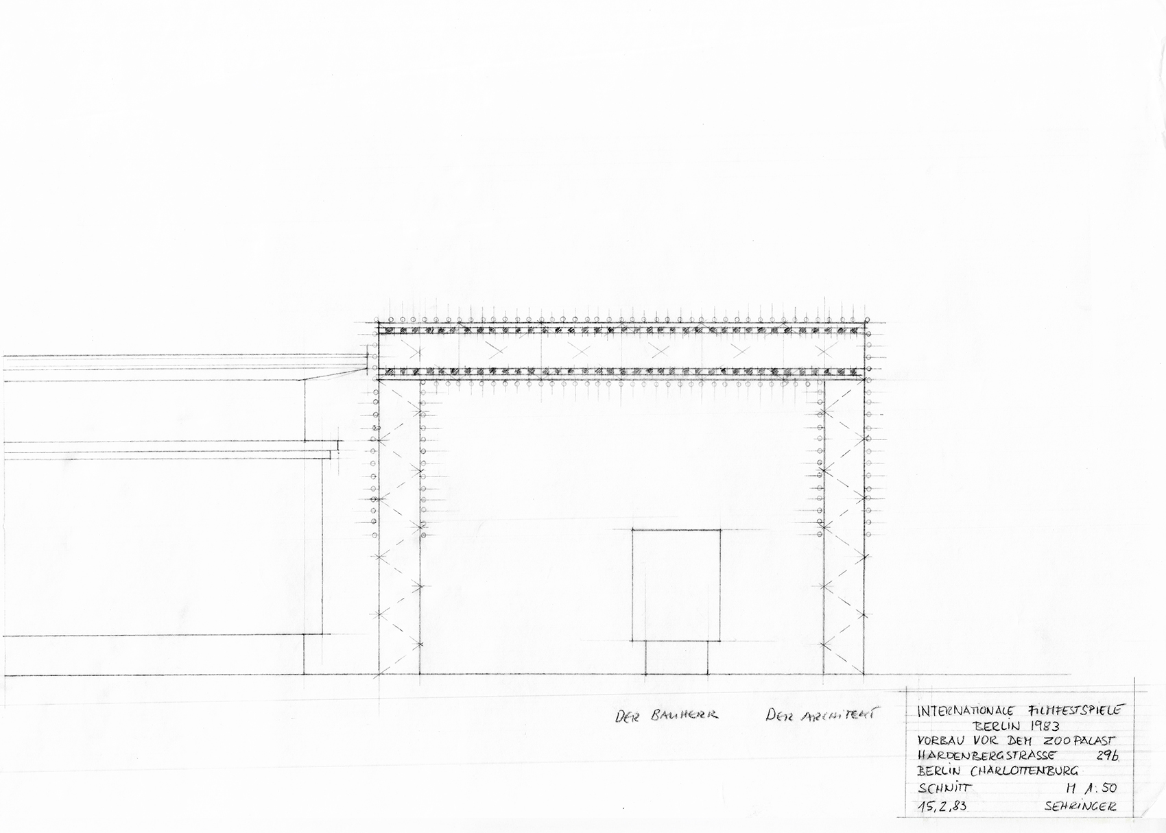 Zwischen der Orangerie und der Eosander-Kapelle befindet sich ein 8 mal 8 m großer quadratischer Raum. Jürg Steiner legte bei Ausstellungen in der Orangerie aus dramaturgischen Gründen Wert darauf, den Rundgang hier zu starten, sodass das Publikum in einem Zug den 110 m langen Bau begehen kann. Der Eingangsbereich fungiert als Kassenraum. Im Falle der »Orangerie« waren hier noch Bücherstände unterzubringen, sodass für die Garderobe eine Lösung ausserhalb des Hauses zu finden war: eine freitragende Tonne, 8 m breit, 6 m tief und 4 m hoch, aussen mit wasserdichter Folie bespannt und innen mit nichtbrennbarem Textil ausgekleidet.