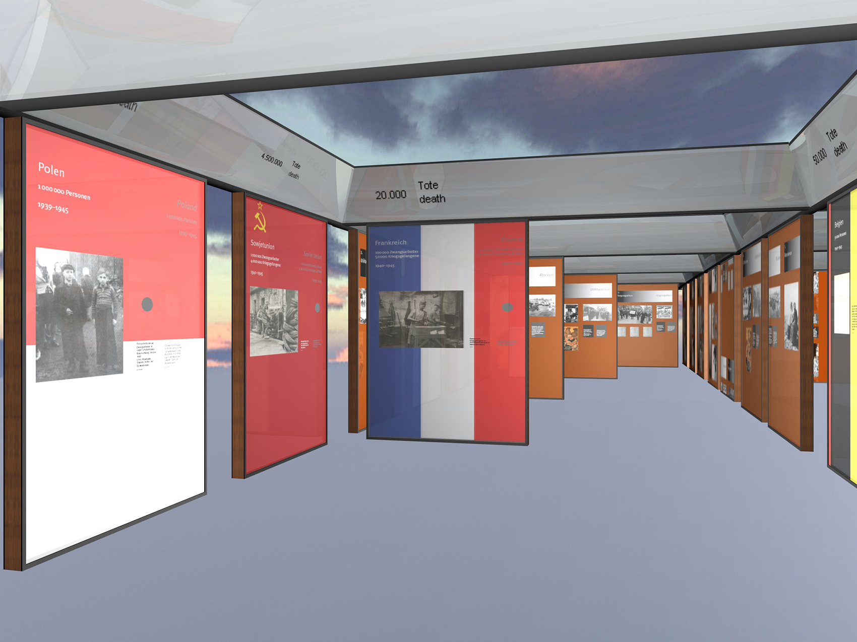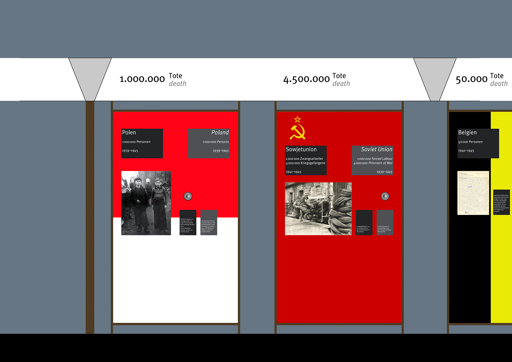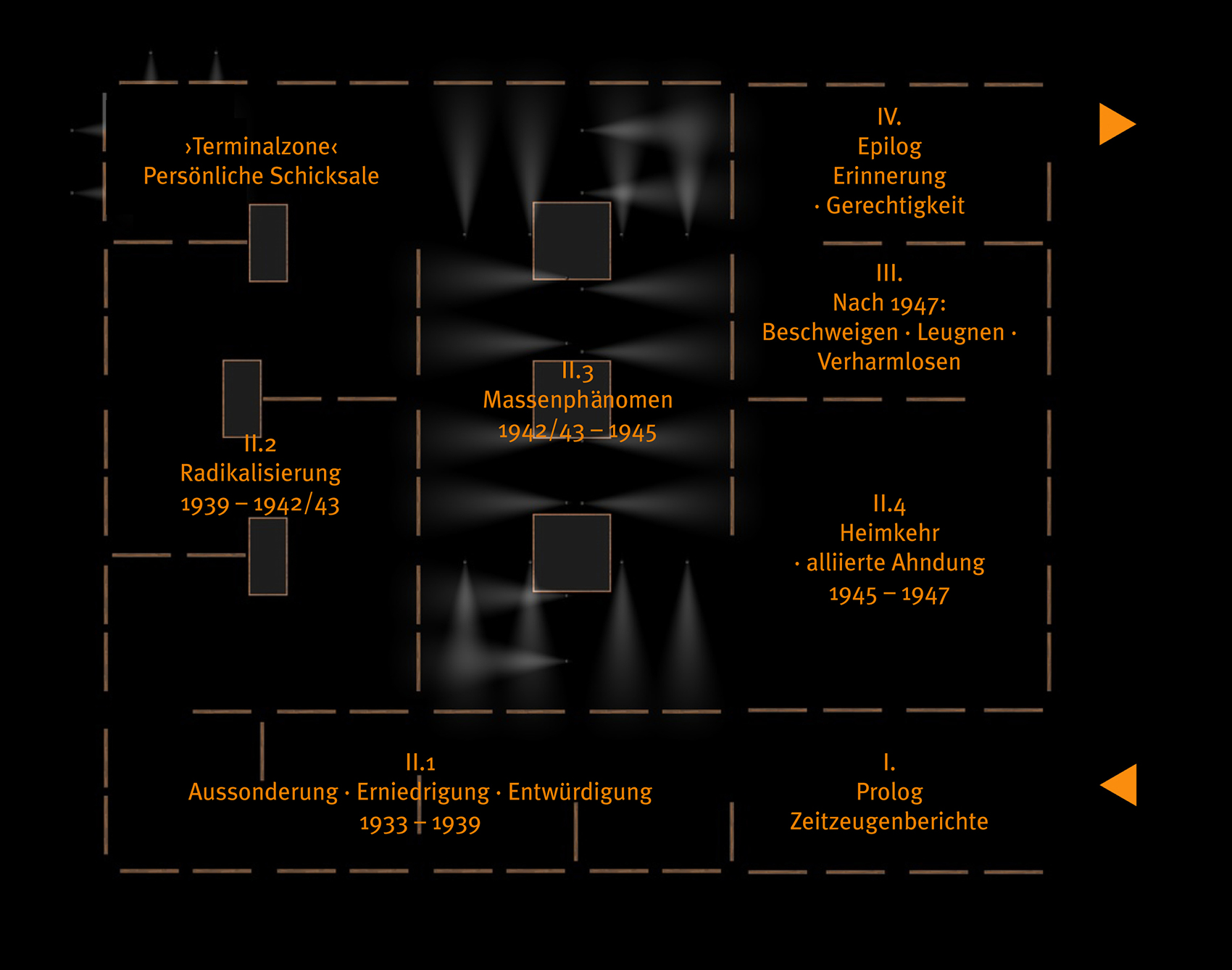 Sowohl die Prismen als auch die Präsentationstafeln lassen sich in den einzelnen Ausstellungsbereichen unterschiedlich nutzen, nämlich als Bild-, Text und Dokumententräger sowohl für Reproduktionen als auch für Originale, weiterhin als flache Vitrinen, als Projektionshintergründe, als interaktive Oberflächen und Träger für Flachbildschirme und Lautsprecher.