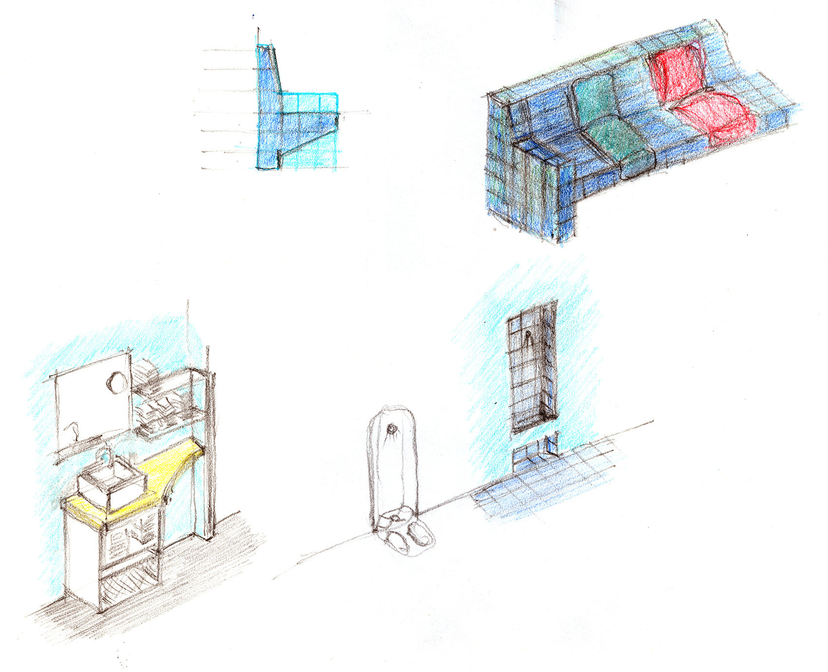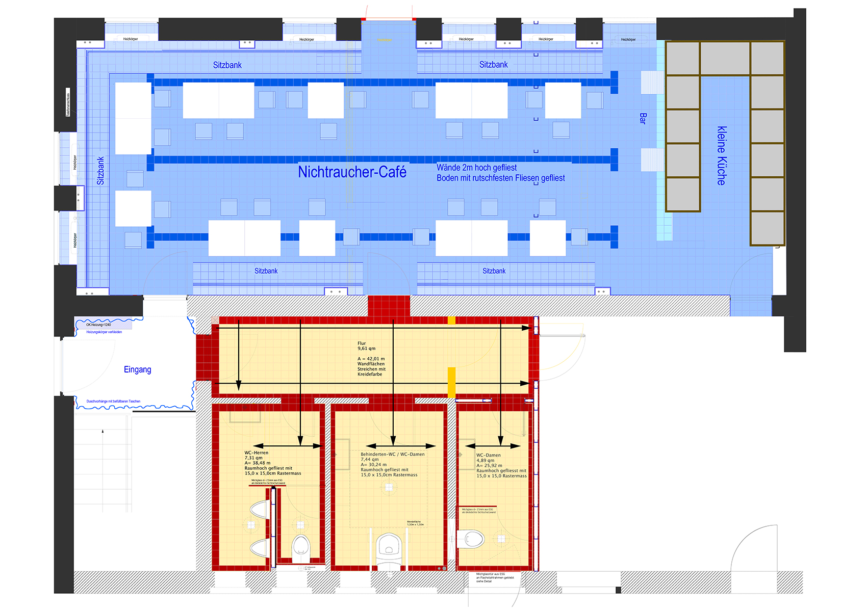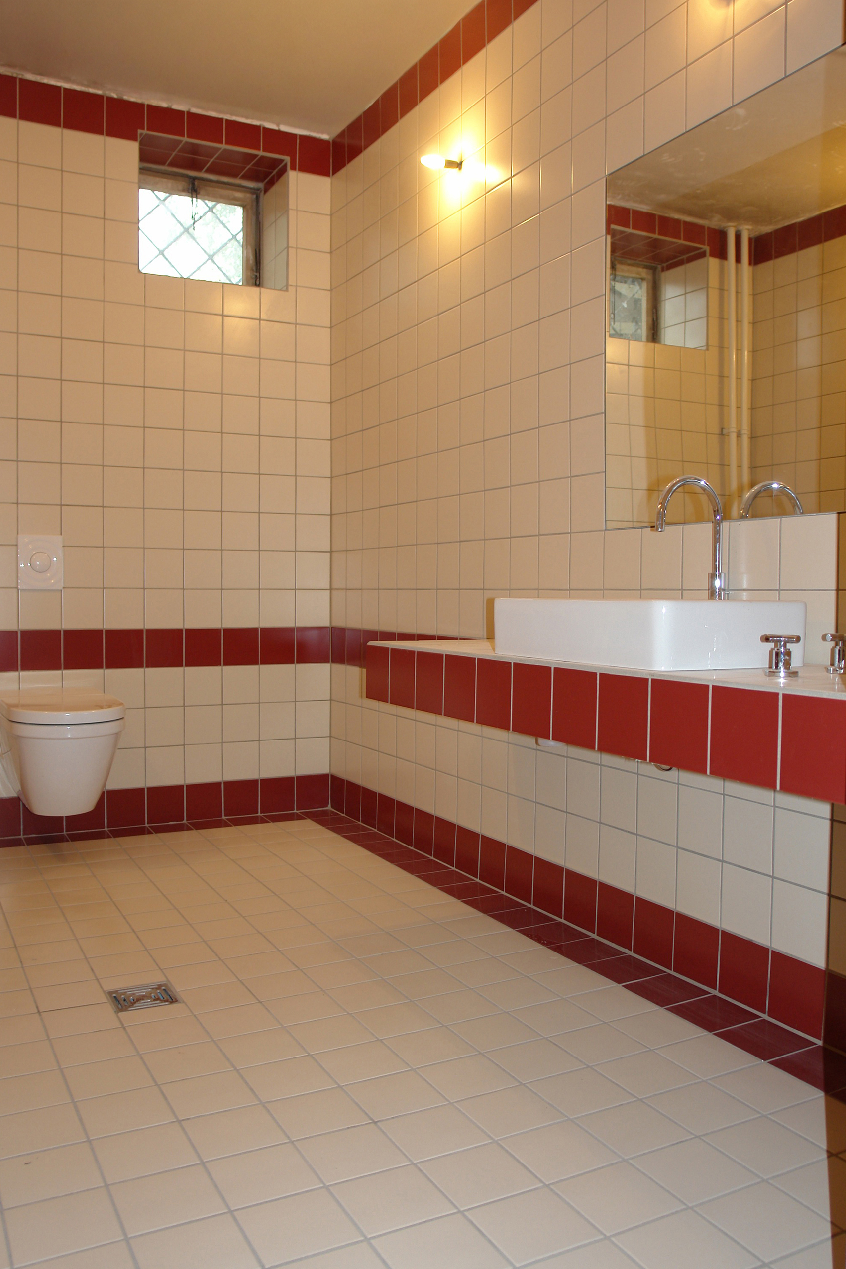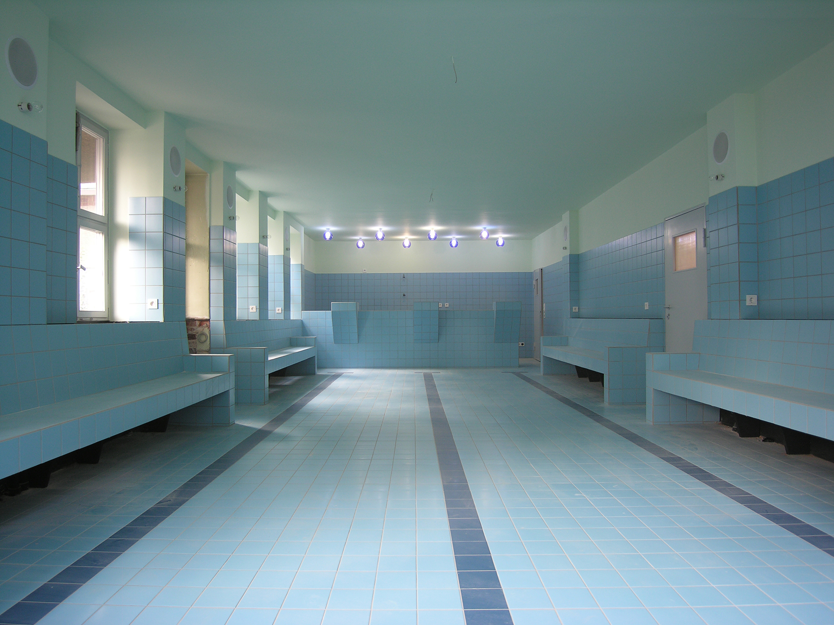 Der anthrazitfarbene Linoleumboden korrespondiert mit dem dunklen Schotter der Freiflächen. Die Innenwände bestehen aus Gipskartonplatten und sind vollflächig gespachtelt. Die Ausführung als Holzständerkonstruktion in einem Raster von 0,90 m mit zwischen den Ständern liegender Wärmedämmung macht eine geringe Wandstärke von 0,225 m bei bestem Vollwärmeschutz möglich und erlaubt eine zügige Errichtung des Bauwerks.