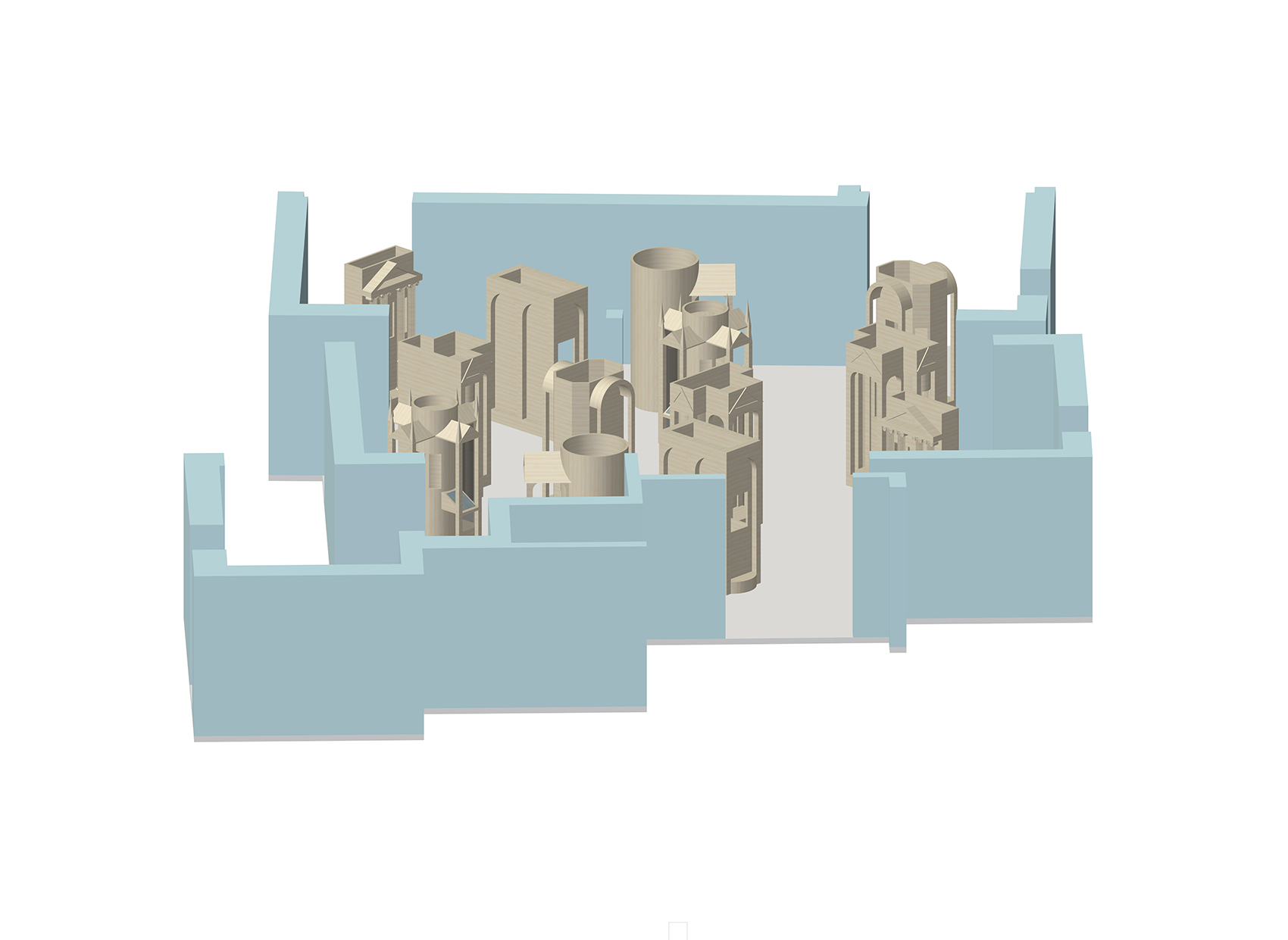 Das Publikum betritt das Gebäude durch den Einschnitt in der Freitreppe und gelangt in ein kreisförmiges Foyer, an welchem sämtliche dienenden Funktionen direkt andocken. Die Bildungseinrichtungen liegen im hinteren Teil und können bei Bedarf durch einen aufgeständerten Anbau ergänzt werden; der zur Erschließung notwendige Flur ist im Obergeschoss bereits vorgesehen.