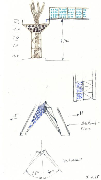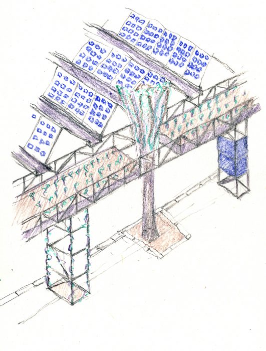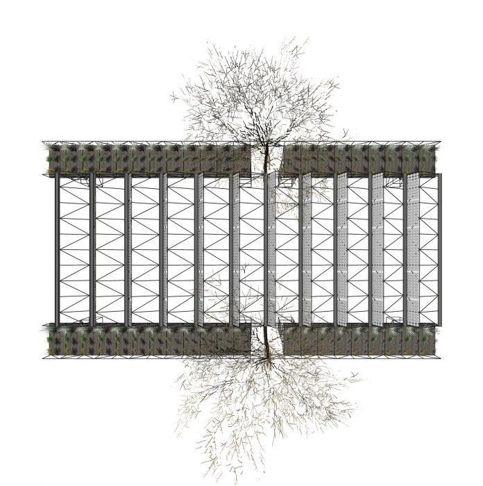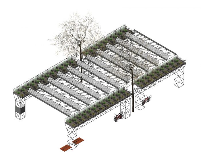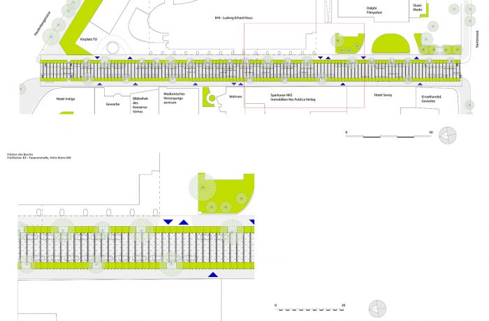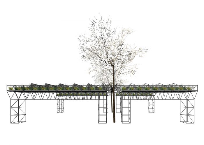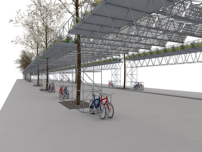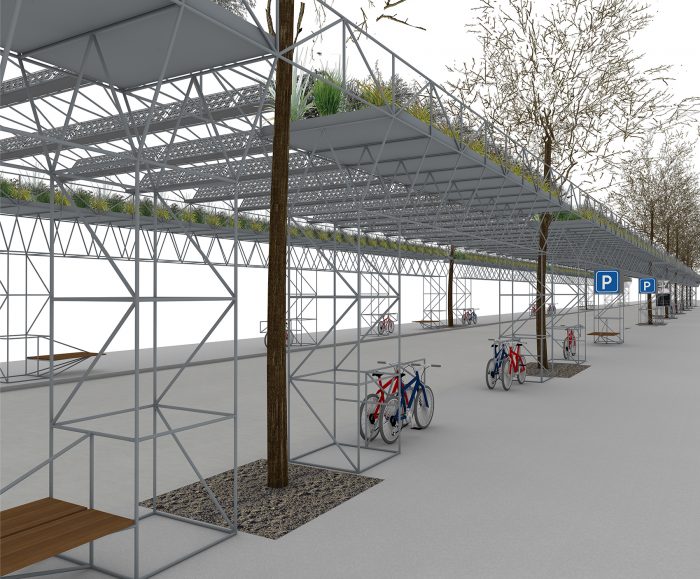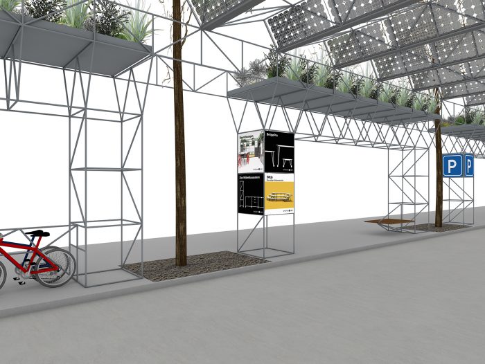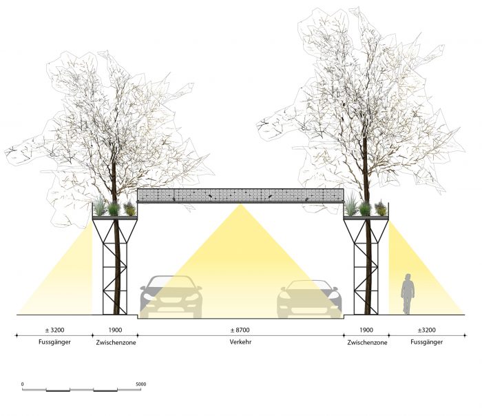 - Zwischenzone. Diese ist auf dem Niveau des Trottoirs meist mit einer Reihe Bäumen bepflanzt und mit unterschiedlichem Mobiliar bestückt: Papierkörbe, Schaltkästen, Ladestationen, Beschilderungen, Leuchtenmasten, Schwengelpumpen, Litfaßsäulen, Ruhebänken, Busstationssäulen etc. Die vorliegende Idee will diese Zone im Sinne der Challenge aufwerten und in die Vertikalität erweitern.