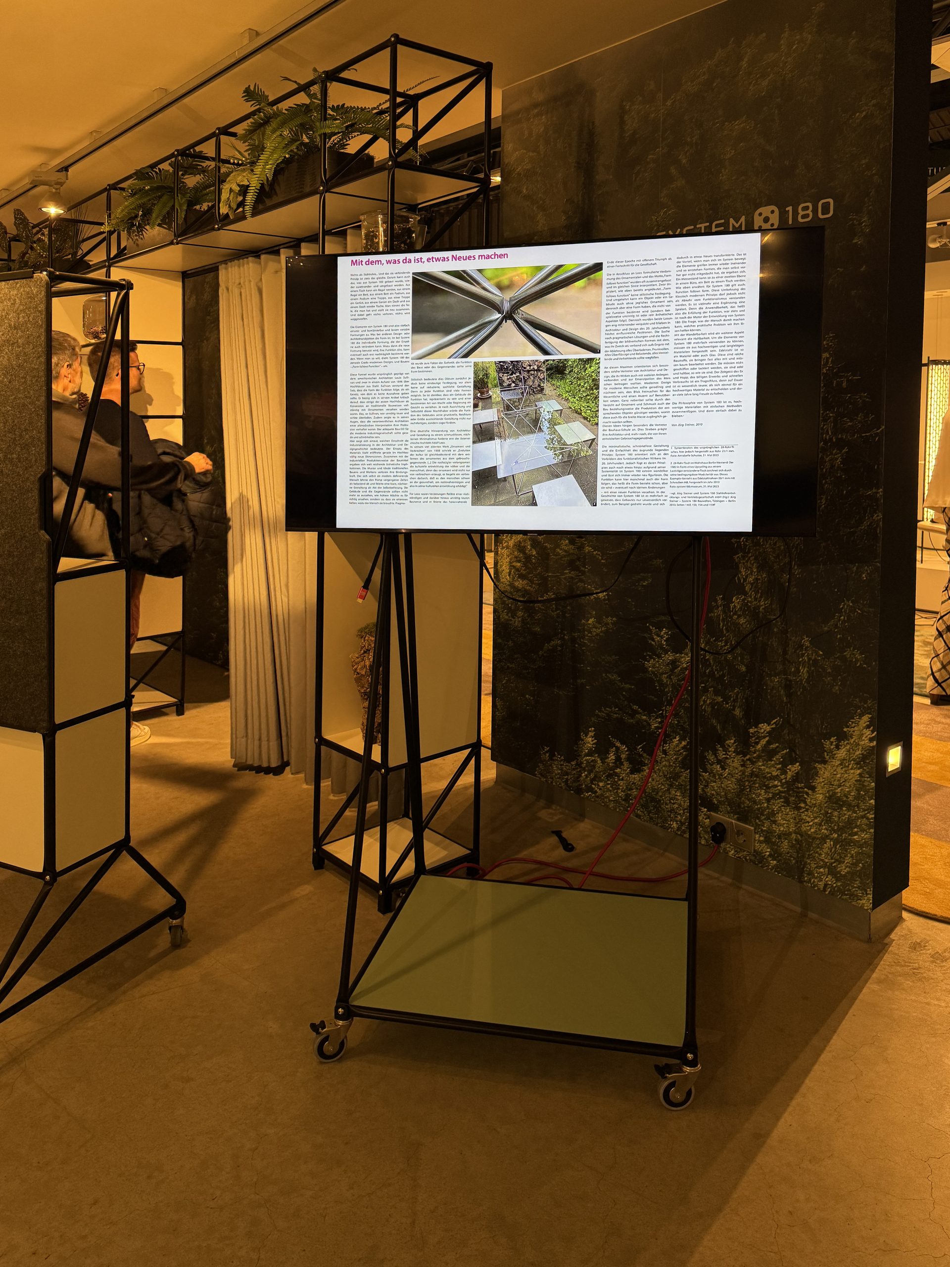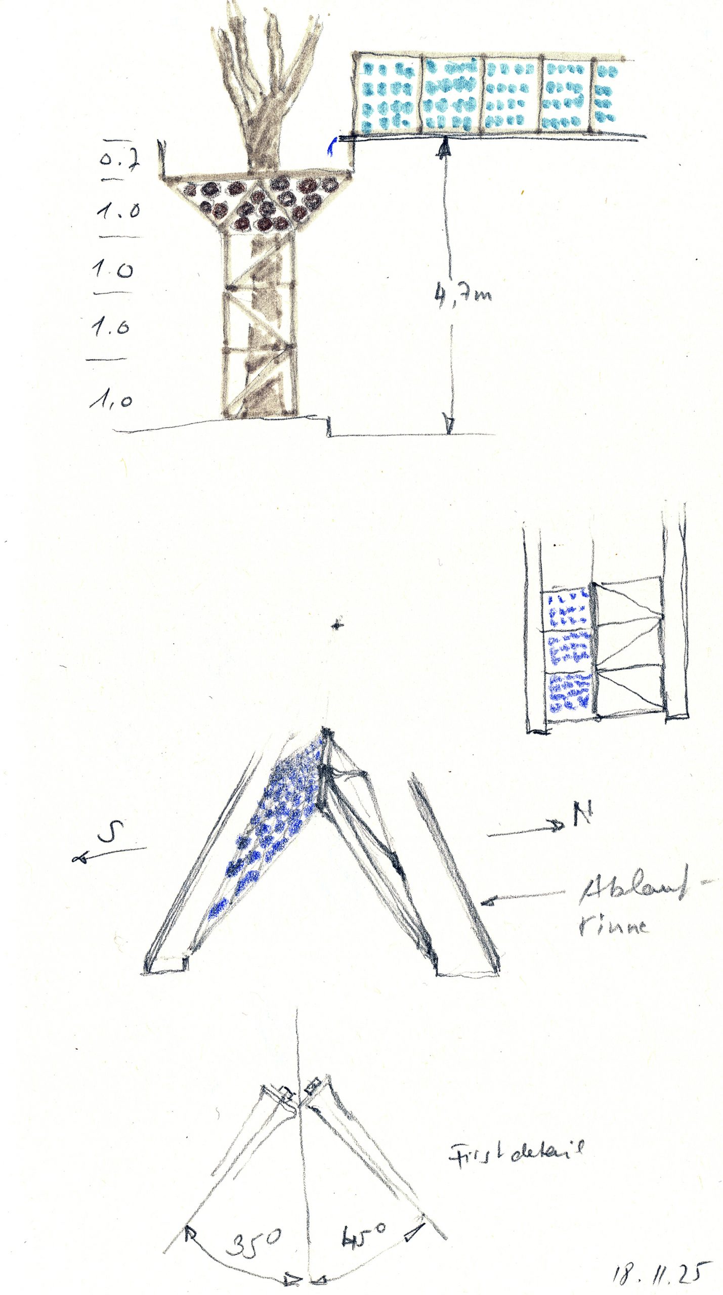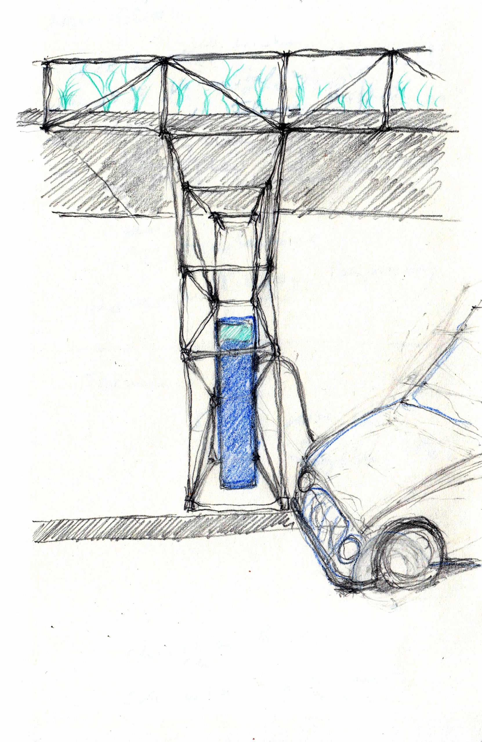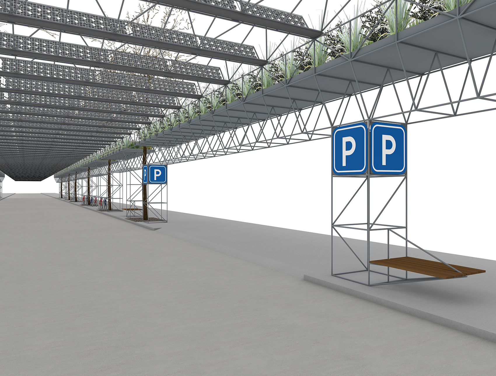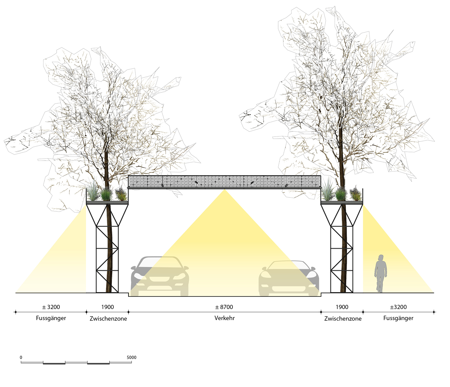 - Zwischenzone. Diese ist auf dem Niveau des Trottoirs meist mit einer Reihe Bäumen bepflanzt und mit unterschiedlichem Mobiliar bestückt: Papierkörbe, Schaltkästen, Ladestationen, Beschilderungen, Leuchtenmasten, Schwengelpumpen, Litfaßsäulen, Ruhebänken, Busstationssäulen etc. Die vorliegende Idee will diese Zone im Sinne der Challenge aufwerten und in die Vertikalität erweitern.