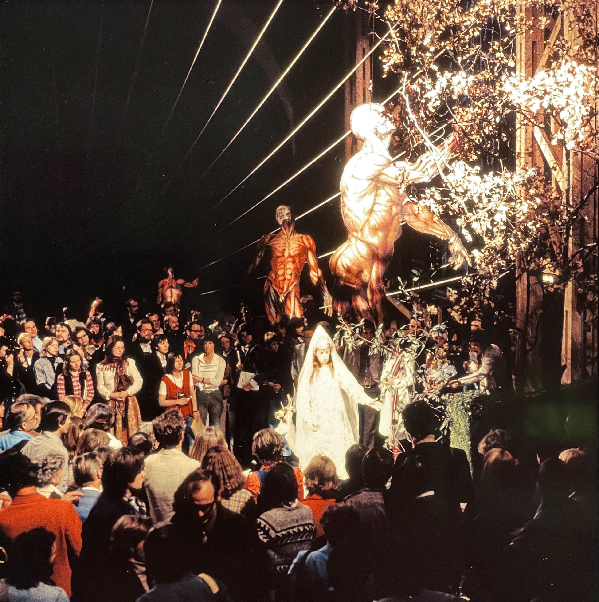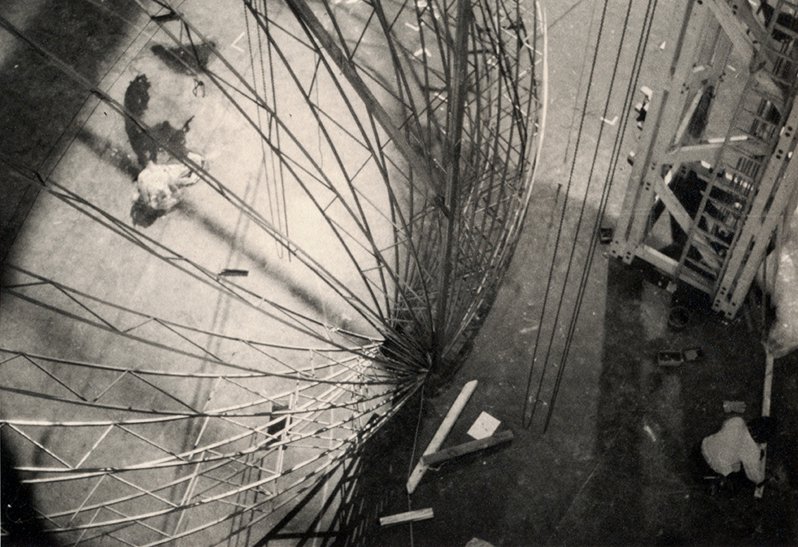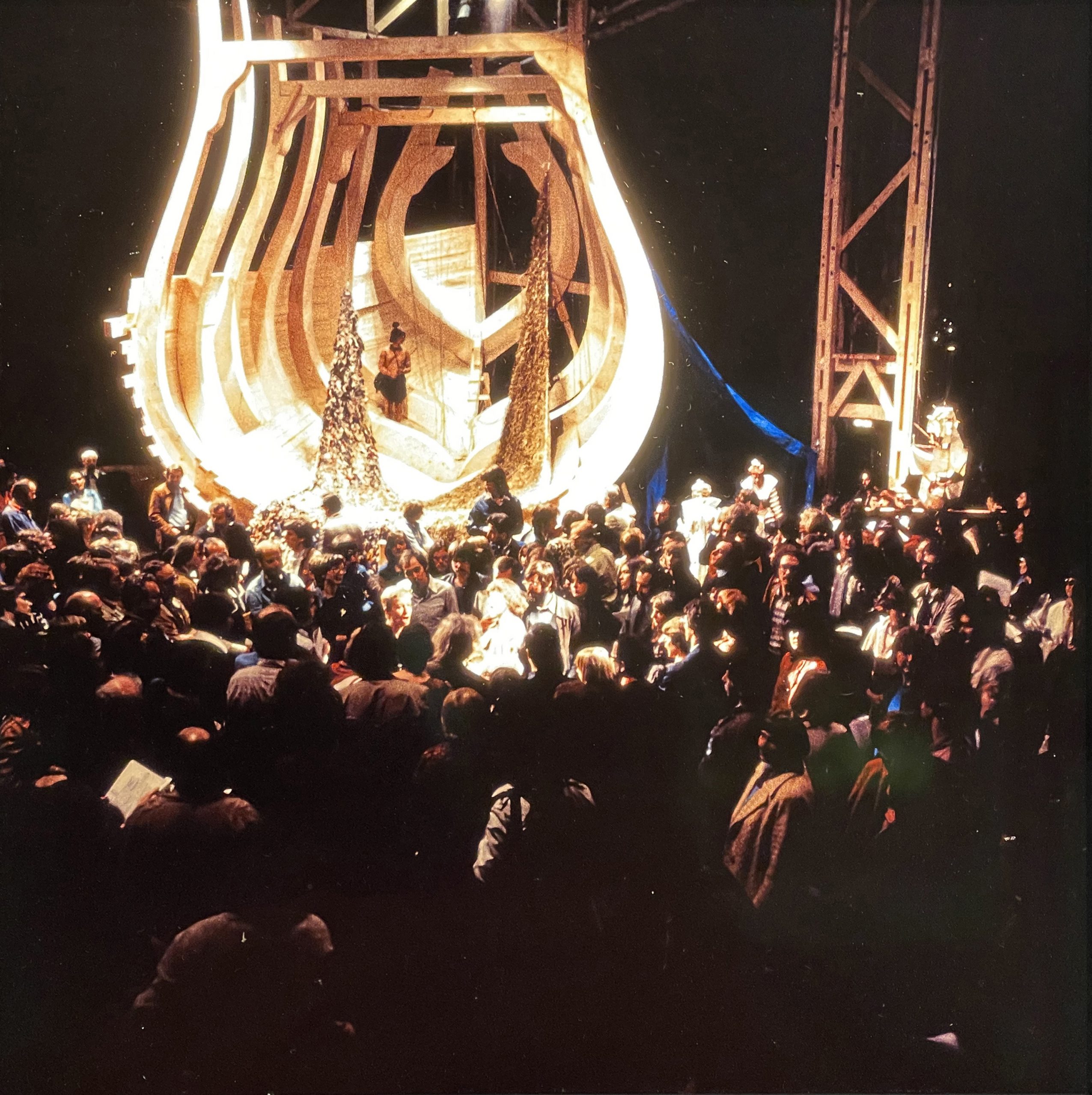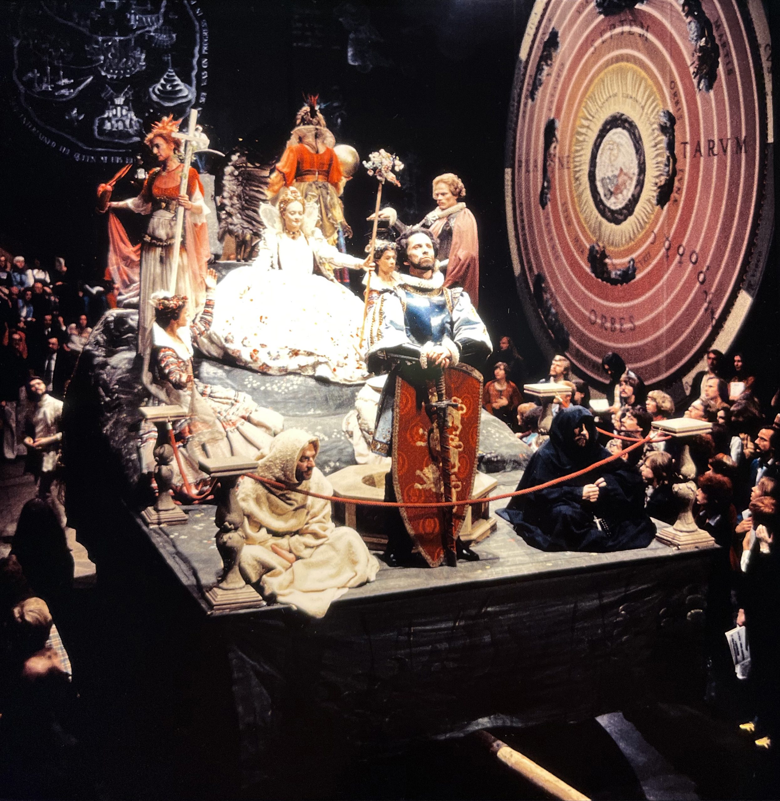 Das erste Foto zeigt eine Szene, die das zeitliche Zusammentreffen damaliger Entdeckungen in einem Bühnenbild von Karl-Ernst Herrmann vergegenwärtigte. Dafür wurde ein Schiffsrumpf auf Rollen in die richtige Position unter das Spielgerüst gebracht. Jürg Steiner konstruierte diesen nach Plänen historischer Schiffe. Die theatermäßig als »Rohre aus Sperrholz« hergestellten Spanten waren wegen ihrer wechselnden Querschnittsflächen eine besondere Herausforderung für die Tischlerei. Im zweiten Bild folgt das Publikum dem Spiel von Wolf Redl.