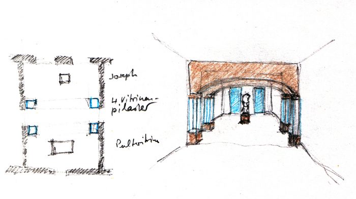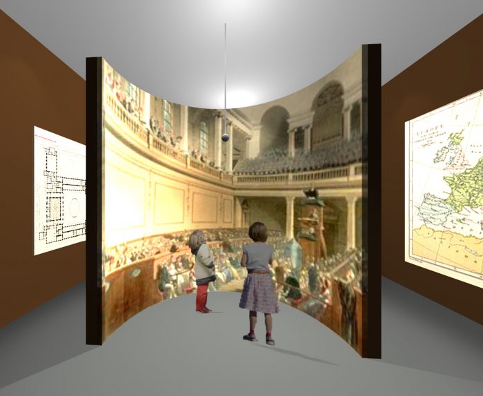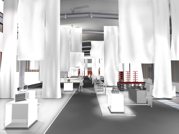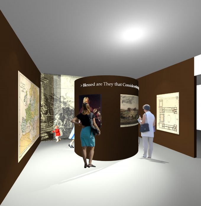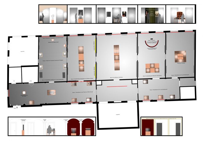 Bei dem eingeladenen Wettbewerb lag das Augenmerk darauf, ein zurückhaltend-thematisch gestaltetes Ausstellungsdesign zu entwickeln, das den Franckeschen Geist sowohl in der damaligen als auch in der heutigen Zeit kognitiv und sinnlich erfahrbar macht. Dem Publikum wird so unaufdringlich vermittelt, dass die Ausstellung im Mittelalter beginnt und durch einen chronologisch-thematischen Ablauf ins 20. Jahrhundert hinein führt. Die jeweilige Zeit und die Örtlichkeiten wirken durch die Wandgestaltung in den Raum hinein, wo ein zentrales Möbel Objekte aufnimmt, schriftliche und mediale Ereignisse vermittelt und auch zum Sitzen einlädt. Uns erschien es wichtig, die zeitgenössisch überformten Räume neu zu definieren.