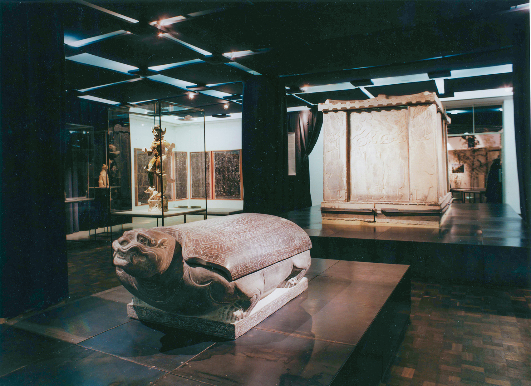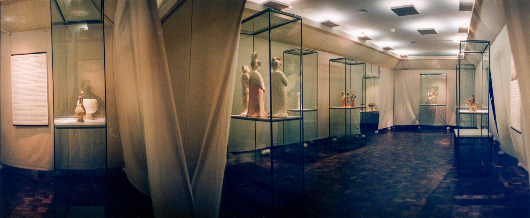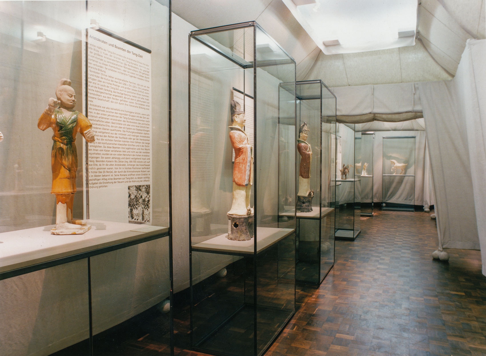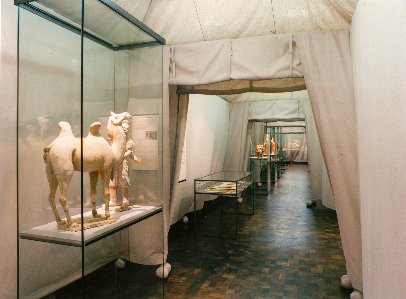 Inspiriert vom Motiv Seidenstraße, wurden die Einführungsbereiche als zeltartig unterteilte Räume gestaltet. Hier fanden Skulpturen der Tang-Zeit im eigens für das Museum konstruierten modularen Vitrinensystem Platz. Das Publikum suchte gleichsam im Labyrinth der Zeltlandschaft seinen eigenen Weg zu den Grabstätten.