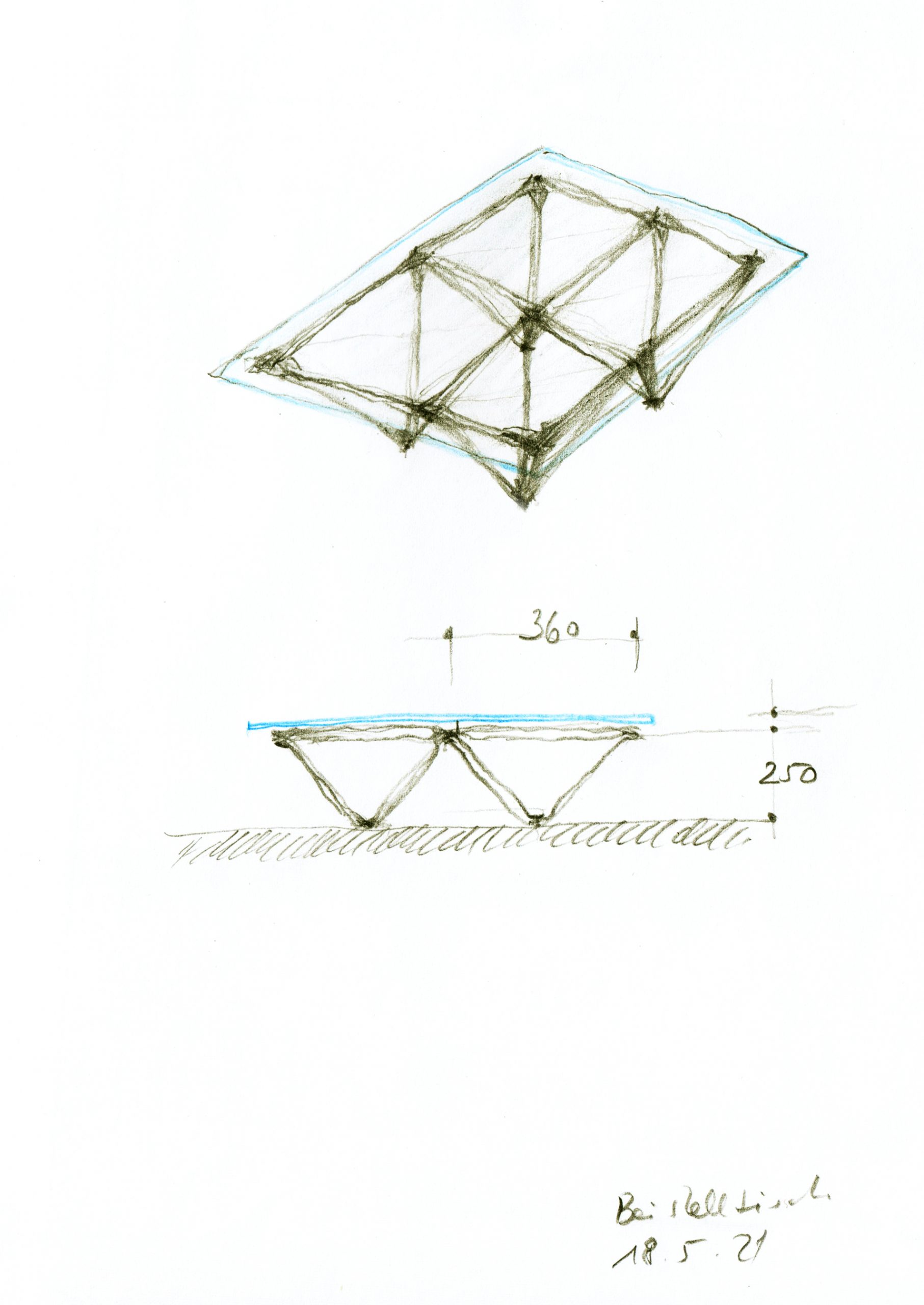 Gleichsam das Drehen um 90° des Pyramidentisches aus dem Jahr 1983 ließ etwas Neues aus System 180®, wiederum aus 28 Rohren, entstehen – diesmal aus zwei Konfigurationen (12 Geraden und 16 Diagonalen).