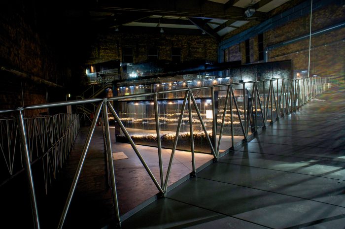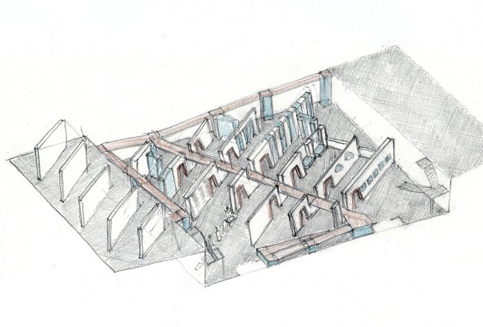 Barbaren haben bei der Sanierung des ehemaligen Bergwerks Reden in der zweigeschossigen Waschkaue die typischen, von der Decke abgehangen Körbe beseitigt und den Raum durch den Einbau einer überdimensionierten Lüftungsanlage sowie zweier eingeschossiger Räume an den Schmalseiten, „Emporen“ genannt, entstellt. Um die Emporen als behindertengerechte Ausstellungsfläche nutzen zu können, sollten Aufzüge installiert werden, die das Ausstellungsbudget deutlich strapaziert hätten. Daher wurde unser Vorschlag einer Rampenanlage, die als zentrales szenografisches Element die Ausstellung bereichert, dankbar aufgenommen. Das Begehen der Rampe stellt eine Zäsur zwischen den verschiedenen Teilen der Ausstellung dar und bietet dem Publikum ein zusätzliches räumliches Erleben der Ausstellung an.