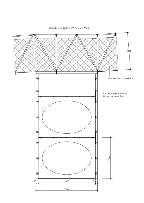 Die Rampenanlage besteht aus modularen vorfabrizierten Komponenten, die vorort nur noch zusammengeschraubt werden mussten, was einen zügigen und sauberen Aufbau ermöglichte. Das Geländer der Rampe aus System 180 Elementen wurde als ebenes Stabtragwerk ausgeführt. Eine statische Berechnung und dynamische Analyse dieser neuartigen Konstruktion erfolgte durch Prof. Yuri Petryna, Technische Universität Berlin. Die Gehfläche bilden Stahlkassetten, deren Oberfläche durch Sandstrahlen zusätzlich aufgeraut wurde. Die Lagerung der Rampenteile erfolgt auf unterschiedlich hohen Podesten aus abgekanteten Stahlblechkassetten, die einen flächigen Lastabtrag in den Bestandsboden ermöglichen. Dadurch konnten bauliche Eingriffe in den Bestand unterbleiben. Außerdem wurden die mit elliptischen Öffnungen versehenen Podeste auch mit Ausstellungsinhalten bespielt, wie beispielweise als Vitrine oder Hörstation.