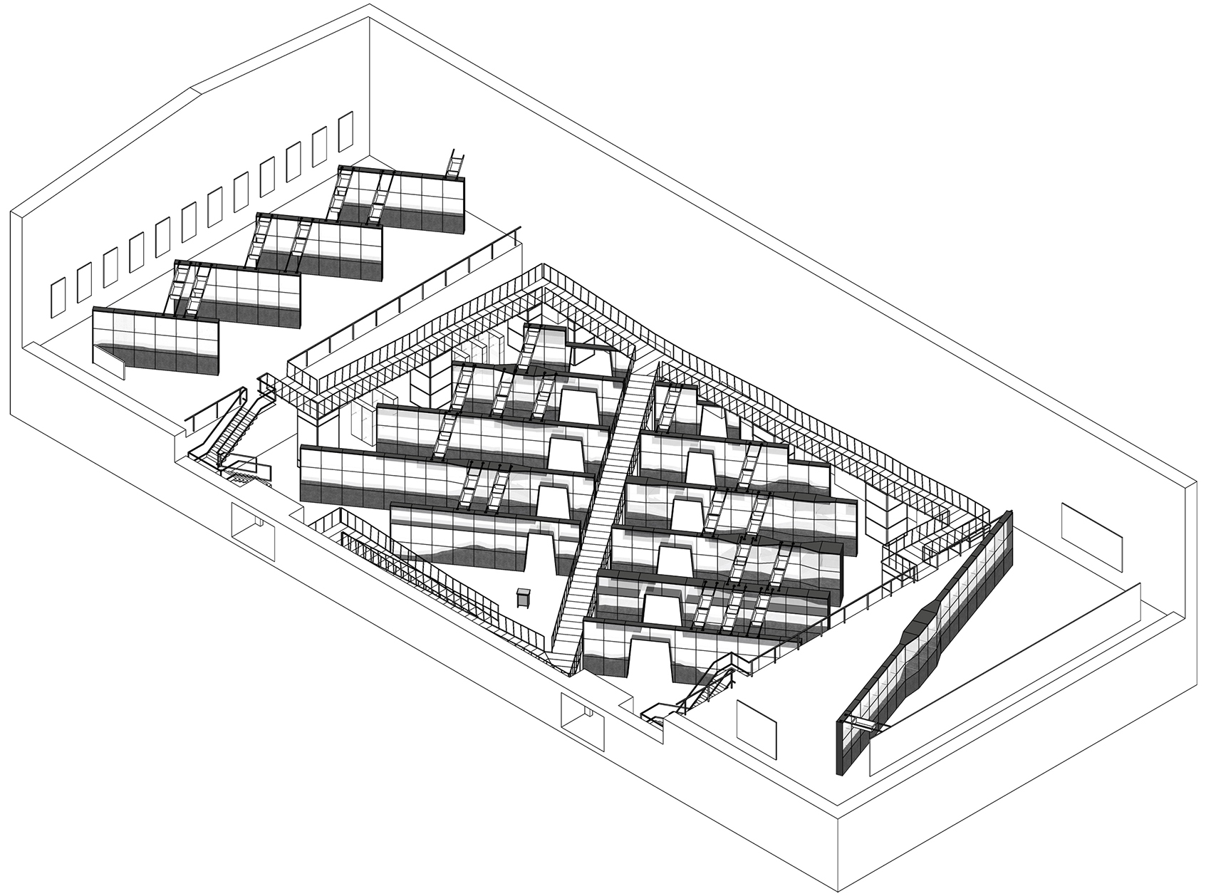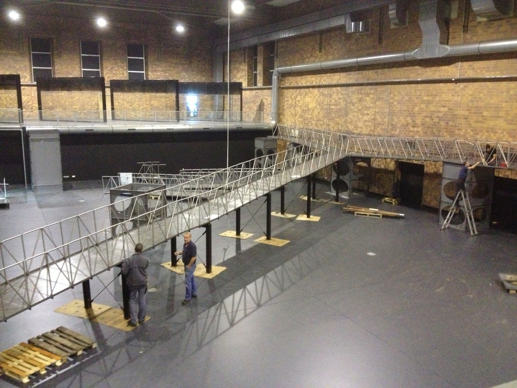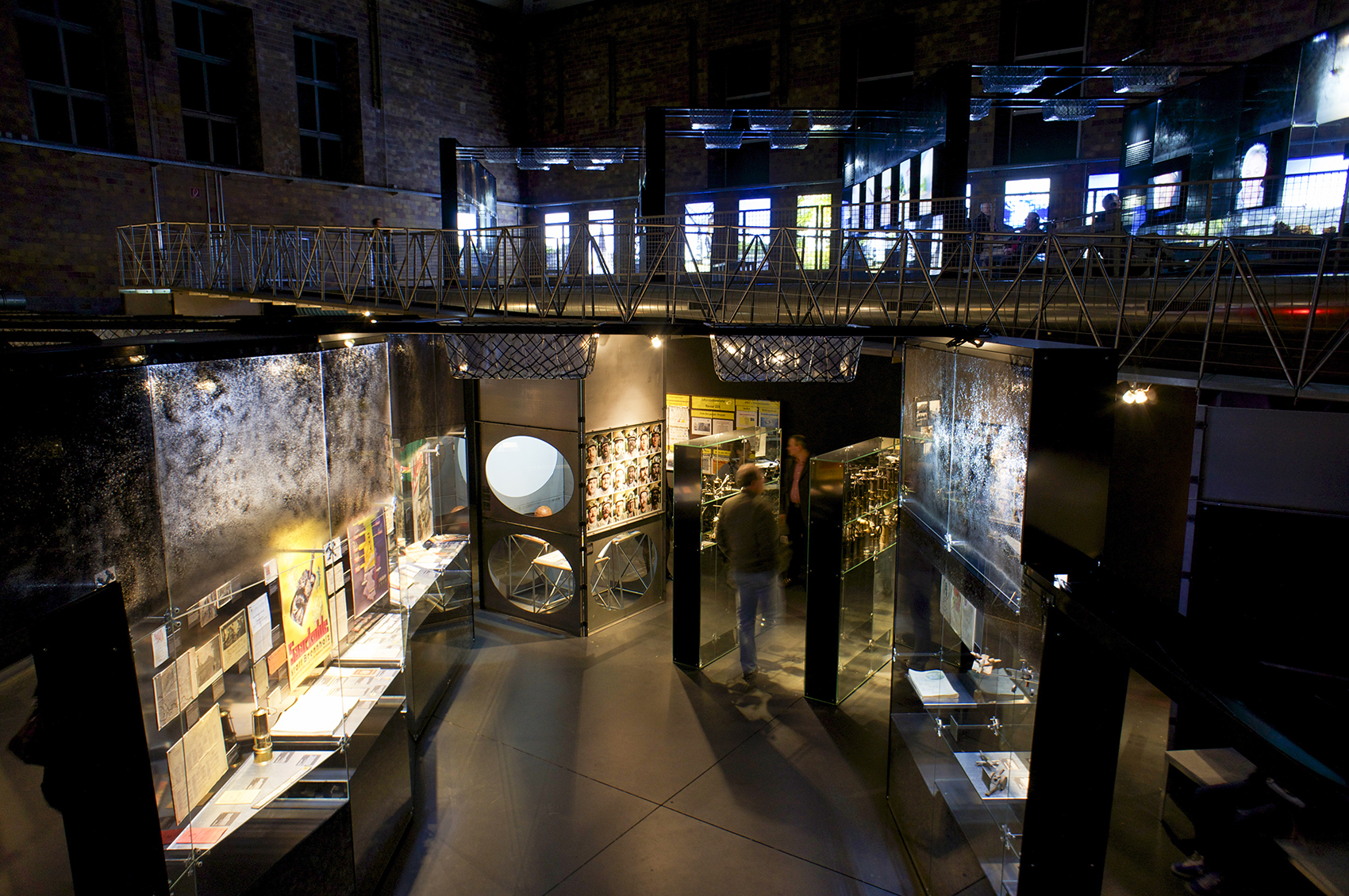 Barbaren haben bei der Sanierung des ehemaligen Bergwerks Reden in der zweigeschossigen Waschkaue die typischen, von der Decke abgehangen Körbe beseitigt und den Raum durch den Einbau einer überdimensionierten Lüftungsanlage sowie zweier eingeschossiger Räume an den Schmalseiten, „Emporen“ genannt, entstellt. Um die Emporen als behindertengerechte Ausstellungsfläche nutzen zu können, sollten Aufzüge installiert werden, die das Ausstellungsbudget deutlich strapaziert hätten. Daher wurde unser Vorschlag einer Rampenanlage, die als zentrales szenografisches Element die Ausstellung bereichert, dankbar aufgenommen. Das Begehen der Rampe stellt eine Zäsur zwischen den verschiedenen Teilen der Ausstellung dar und bietet dem Publikum ein zusätzliches räumliches Erleben der Ausstellung an.