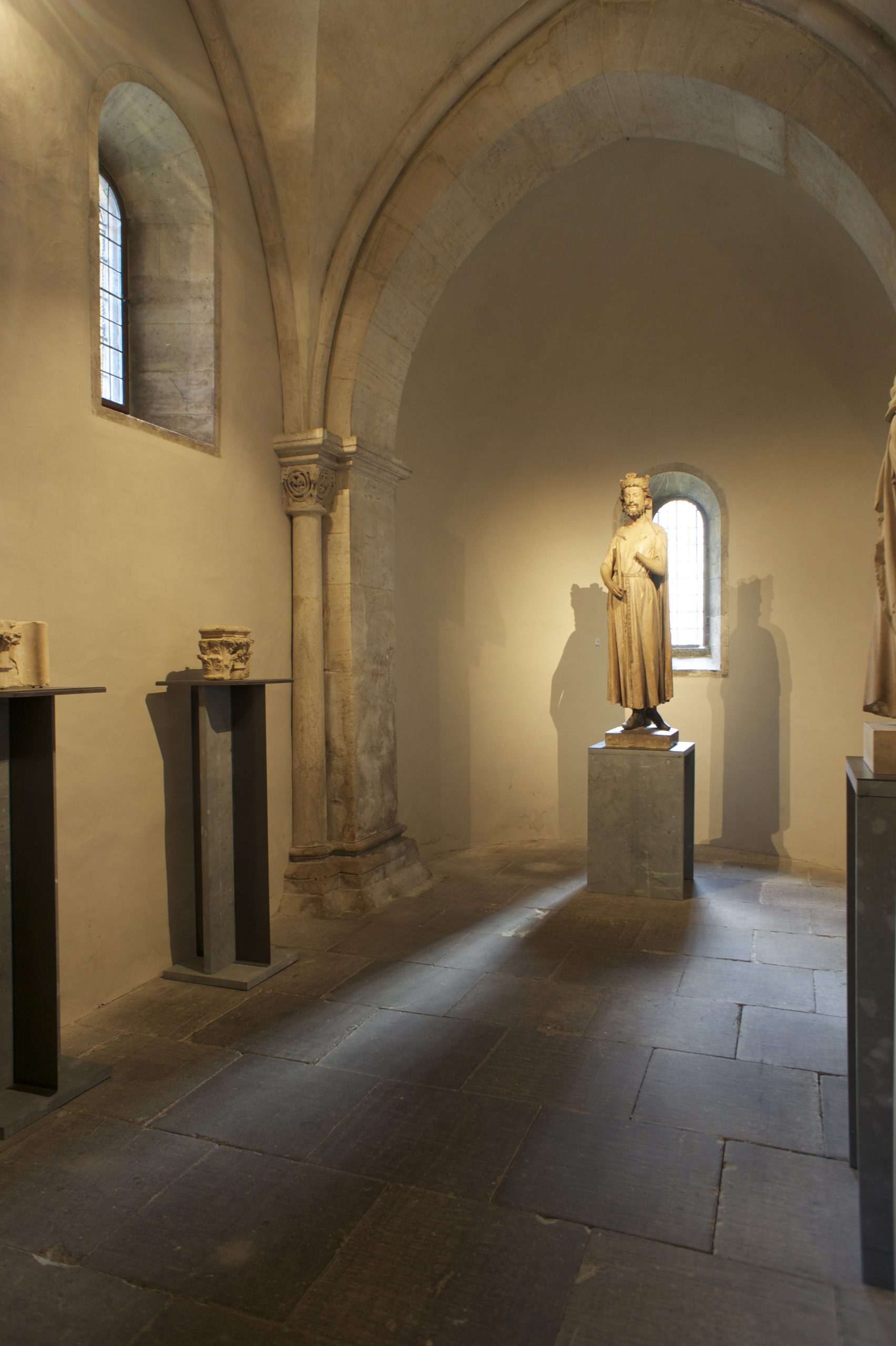 Die letzte Station im Dombezirk – der Dom – gleichsam als Höhepunkt der Ausstellung und Proszenium für den Westchor, ist ohne Bestuhlung in einen musealen Raum transformiert worden, ohne aber den geweihten Status zu konterkarieren. Vielmehr ist das Unglaubliche wahr geworden: Drei wunderbare Fragmente des nicht mehr bestehenden Westlettners aus dem Mainzer Dom, die unzweifelhaft von der Hand des Naumburger Meisters sind, stehen dem Naumburger Westlettner gegenüber und nehmen einen fast sprechenden Dialog auf. Ergänzt durch hochkarätige Leihgaben ist das beste der sakralen Bildhauerei aus der ersten Hälfte des 13. Jahrhunderts versammelt, auf Anröchter Dolomit, um nicht als hauseigen missverstanden zu werden. Der Anröchter Kalkstein, früher auch Anröchter Dolomit genannt, mit seiner typisch grünen Färbung ist äußerst homogen, obwohl vollgespickt mit Fossilien.
