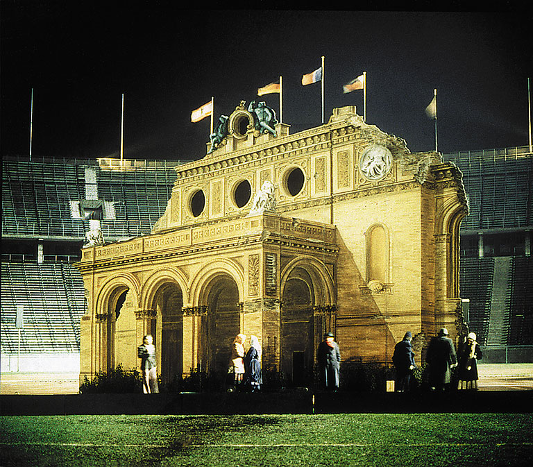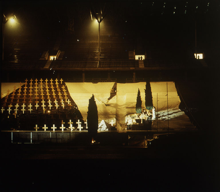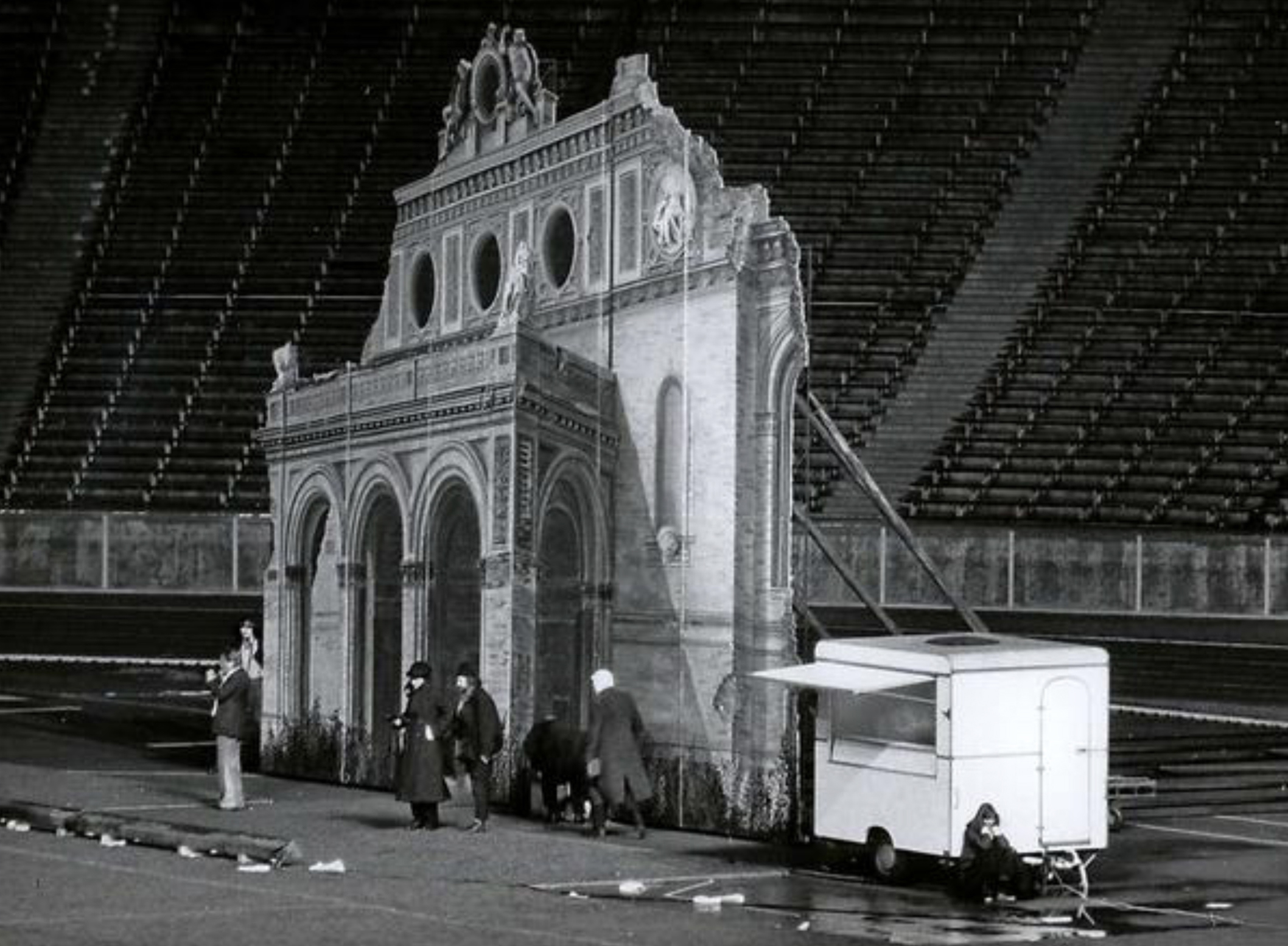 Der Regisseur Klaus Michael Grüber realisierte zusammen mit dem Szenografen Antonio Recalcati diesen Außenauftritt der Schaubühne. In der Ostkurve des Stadions wurde die Nachbildung des Portals vom Anhalter Bahnhof aufgestellt. Auf den Anzeigetafeln, die damals nur Texte zeigen konnten, waren abwechselnde Kurzzitate Hölderlins zu lesen. Als Werkstättenleiter konstruierte Jürg Steiner ein zweidimensionales Gebilde vom Portikus des Anhalter Bahnhofs aus Leinwand, aufgespannt auf sechs über die ganze Höhe laufenden Rahmen aus Stahlgitterträgern, die mit Rundholzstützen an einem steifen Bodenrost aufgerichtet und festgeklemmt wurden. Die Endform bestand aus überstehenden Sperrholzabschnitten, an denen das Textil festgemacht wurde. Befestigungen auf der Aschenbahn waren nicht möglich – Auf- und Abbau waren wegen Sportevents mehrfach gefordert. Die dreidimensionale Wirkung war ein Triumph der Bühnenmaler. Es entstand ein Trompe l’oeil, an dessen Räumlichkeit das Publikum kaum zweifelte, gerade auch durch die agierenden Schauspieler und die Versatzstücke im Umfeld, wie den Imbisswagen. Eine kaum wahrnehmbare Bodenrampe illuminierte die Fassade vor den leeren Rängen der Ostkurve.