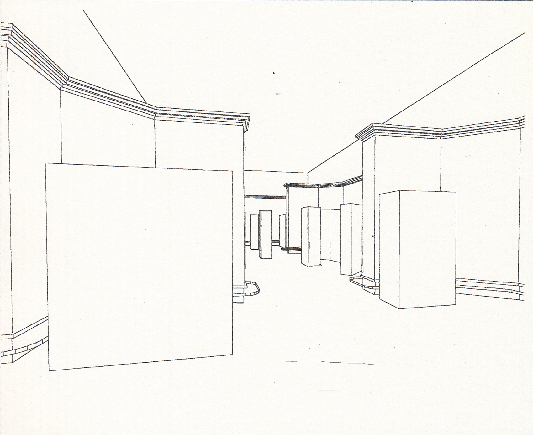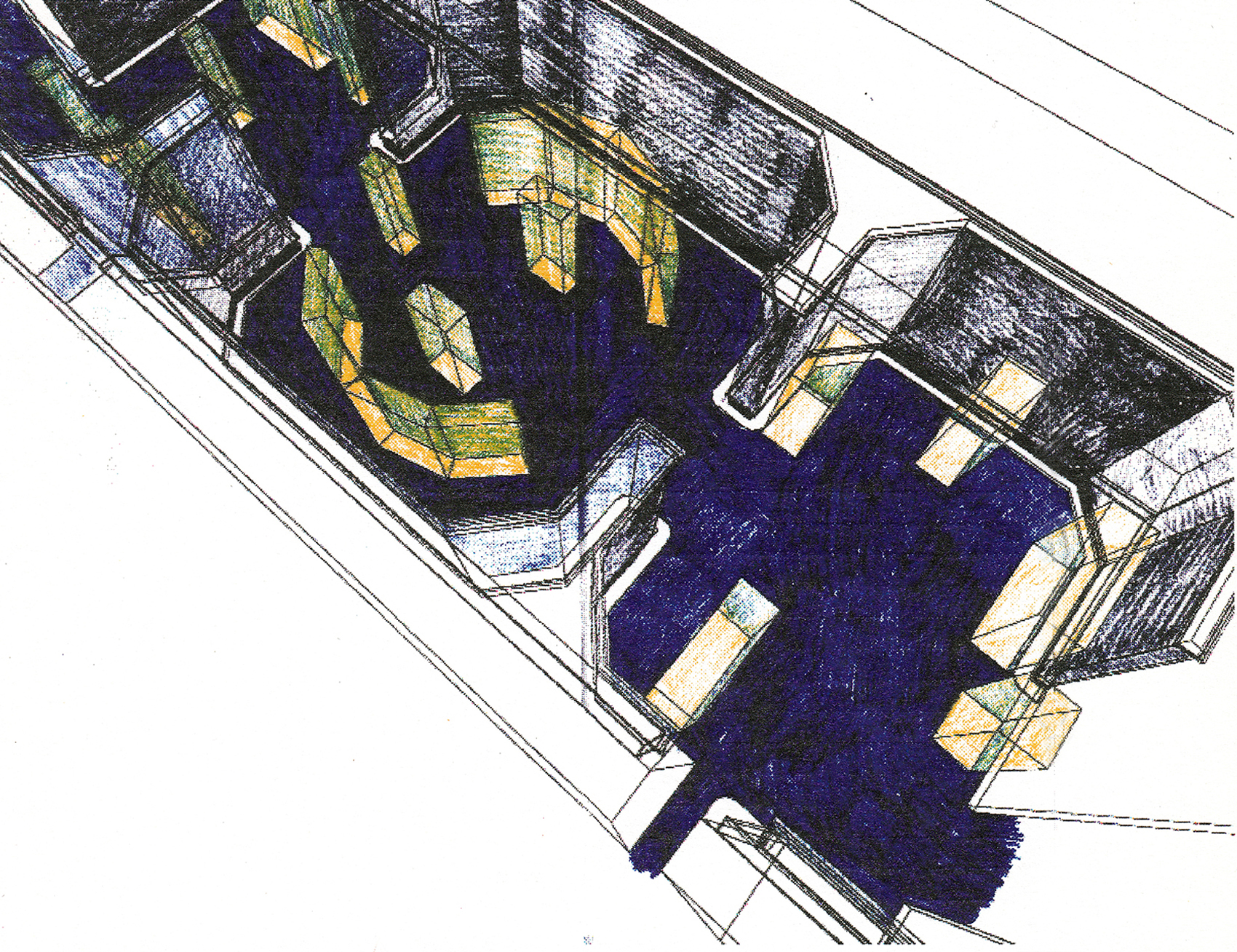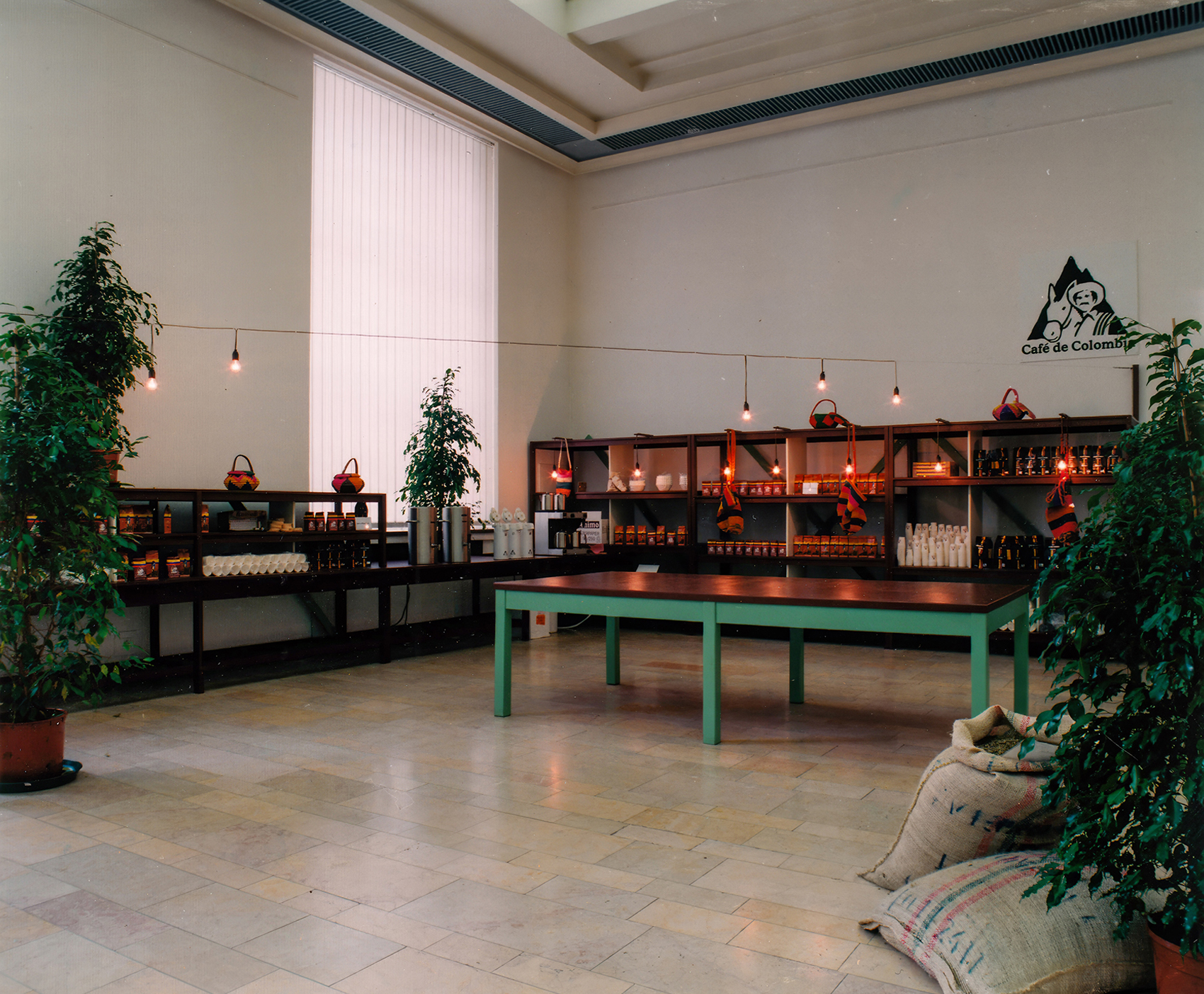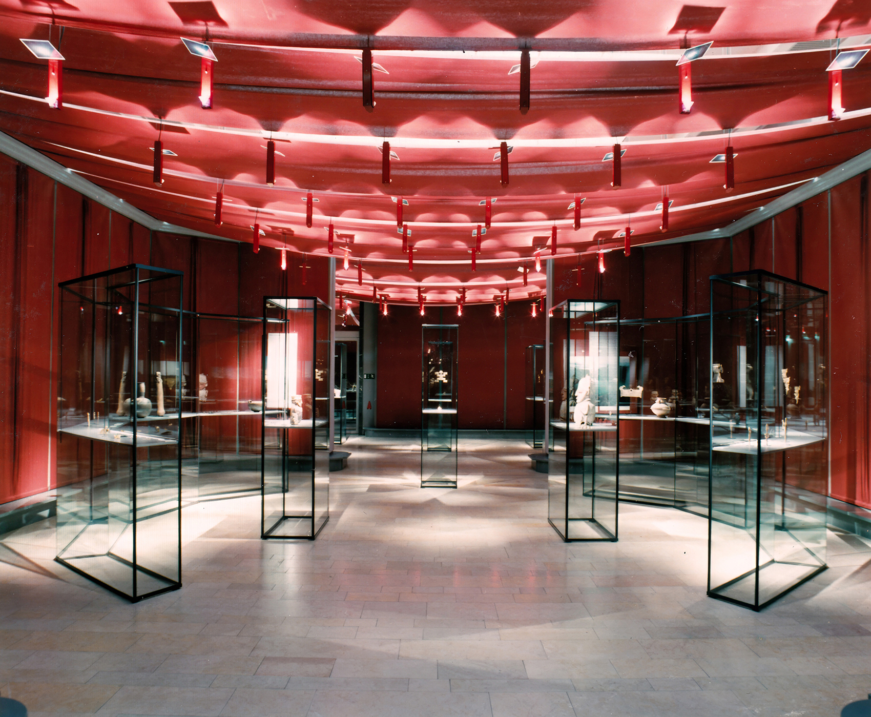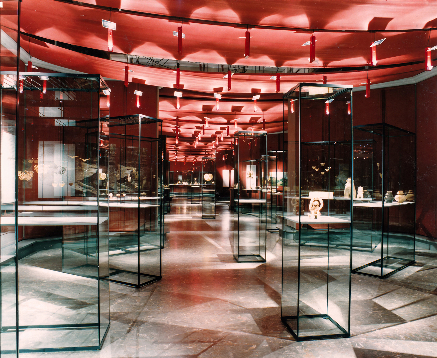 Manuela Fischer konzipierte die Schau für das Berliner Völkerkunde-Museum. Der schmucklose Innenraum des Alten Museums aus den 1950er Jahren rückten wir durch die Abhängung mit roten Stoffbahnen in den Hintergrund. Die darüberliegenden Stromschienen boten sich für die Installation eines eigens für die Ausstellung entwickelten Leuchtensystems an: Das Licht strahlt von einer senkrecht nach oben gerichteten Halogenreflektorlampe über einen Spiegel zurück in den Raum (4. Bild). Die Blendwirkung ist minimiert, das Licht, das den Spiegel nicht trifft, zeichnet sich an der Decke ab, die es rötlich gefärbt reflektiert. Die für die Ausstellung Amerika 1492–1992. Neue Welten – Neue Wirklichkeiten entworfen Vitrinen wurden hier wiederverwendet.