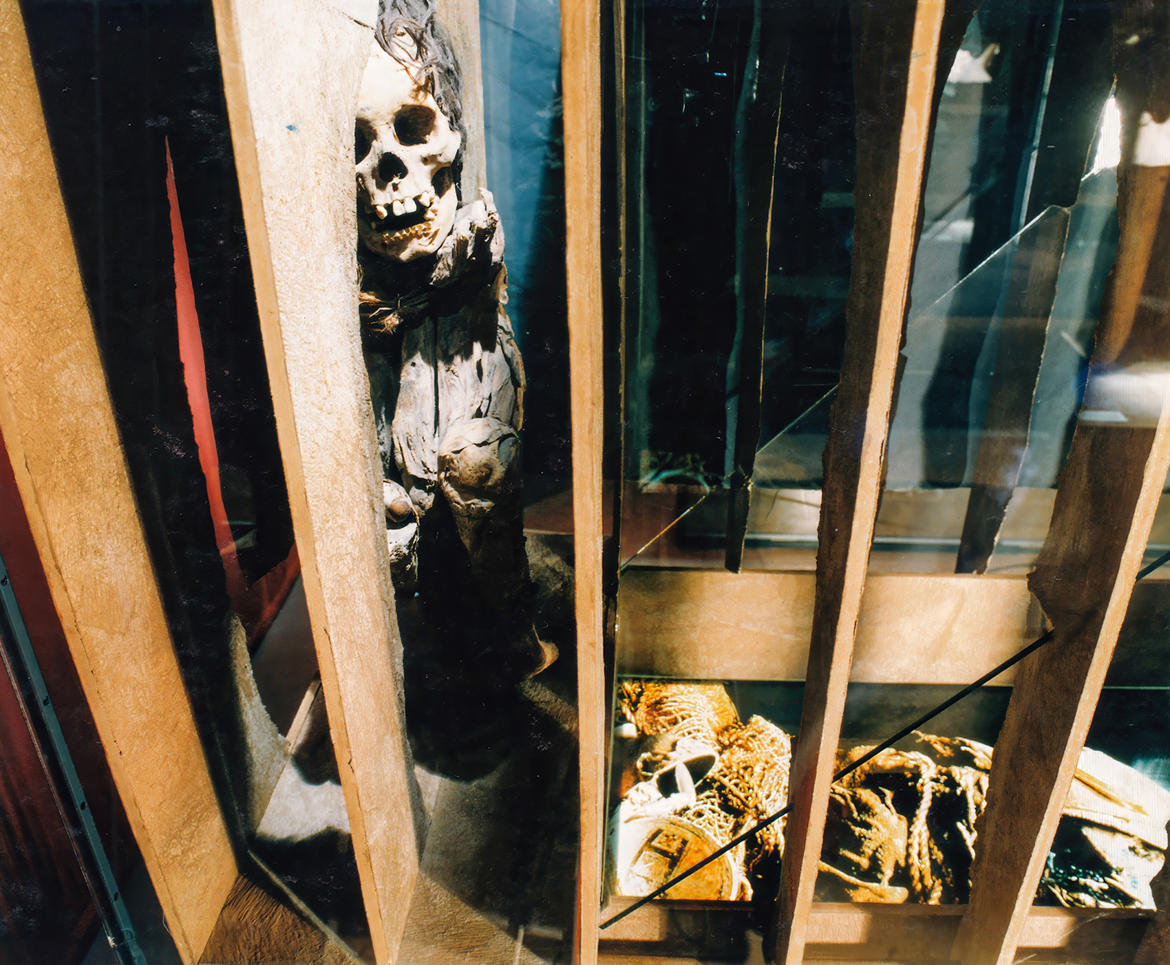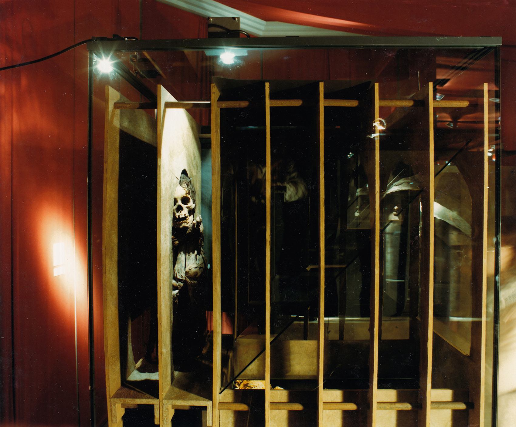 Die Mumie eines Kindes ›bekleideten‹ wir mit einem Leuchtbild einer vergleichbaren bekleideten Mumie über eine schräg gestellte Glasplatte. Wir wussten damals nicht, dass dieser Theatereffekt Pepper’s Ghost heisst, die Technologe des Head up Display ahnten wir voraus (5. bis 8. Bilder).