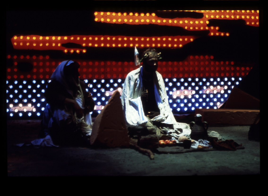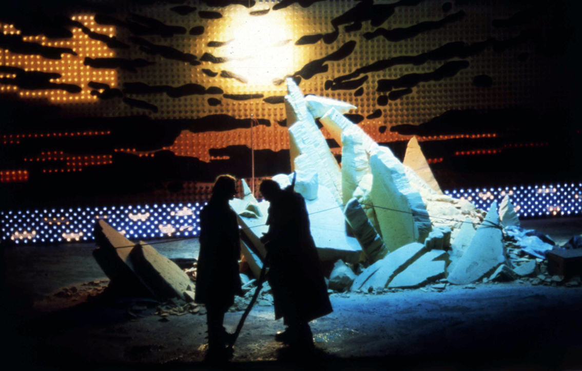 ›Vor einer […] Lichtwand, die der in Paris lebende italienische Bühnenbildner Antonio Recalcati bis zur Premiere mit Hunderten farbiger Glühlampen bestücken wird, erhebt sich ein rötliches, stellenweise weiß bestäubtes Styropor-Gebirge, bis in die abgebrochenen Felszacken nachgebaut den getürmten Schollen in Caspar David Friedrichs Gemälde „Das Wrack im Eis oder Die im Eismeer zerschellte Hoffnung‘.