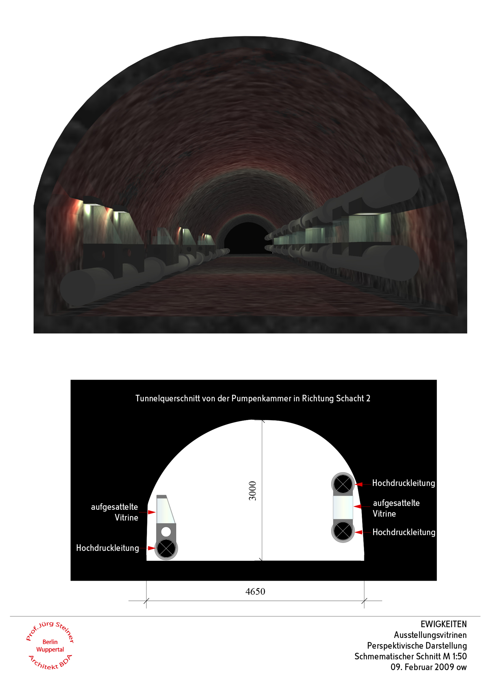 Die Grubenfahrt auf Zollverein soll eine Begegnung mit der stummen Authentizität eines (stillgelegten) Bergwerks sein, mit dem Lärm einer Maschine, die gegen die Schwerkraft kämpft und (vorübergehend) siegt, mit der Naturschönheit der Erdgeschichte, demonstriert an Steinen, Fossilien und Mineralien des Ruhr Museums und mit Kunst, die sich auf höchstem Niveau, allerdings in 950 Metern Tiefe, mit einer Dimension von Natur, Zeit und den Menschen als homo faber mundi auseinandersetzt. Bewusst geht das Projekt ›Ewigkeiten‹ auf die in den meisten Schaubergwerken gezeigte Technik und Arbeitswelt des Bergbaus auf Distanz und sucht im konkreten Besonderem das Allgemeine, das überzeitlich Gültige.