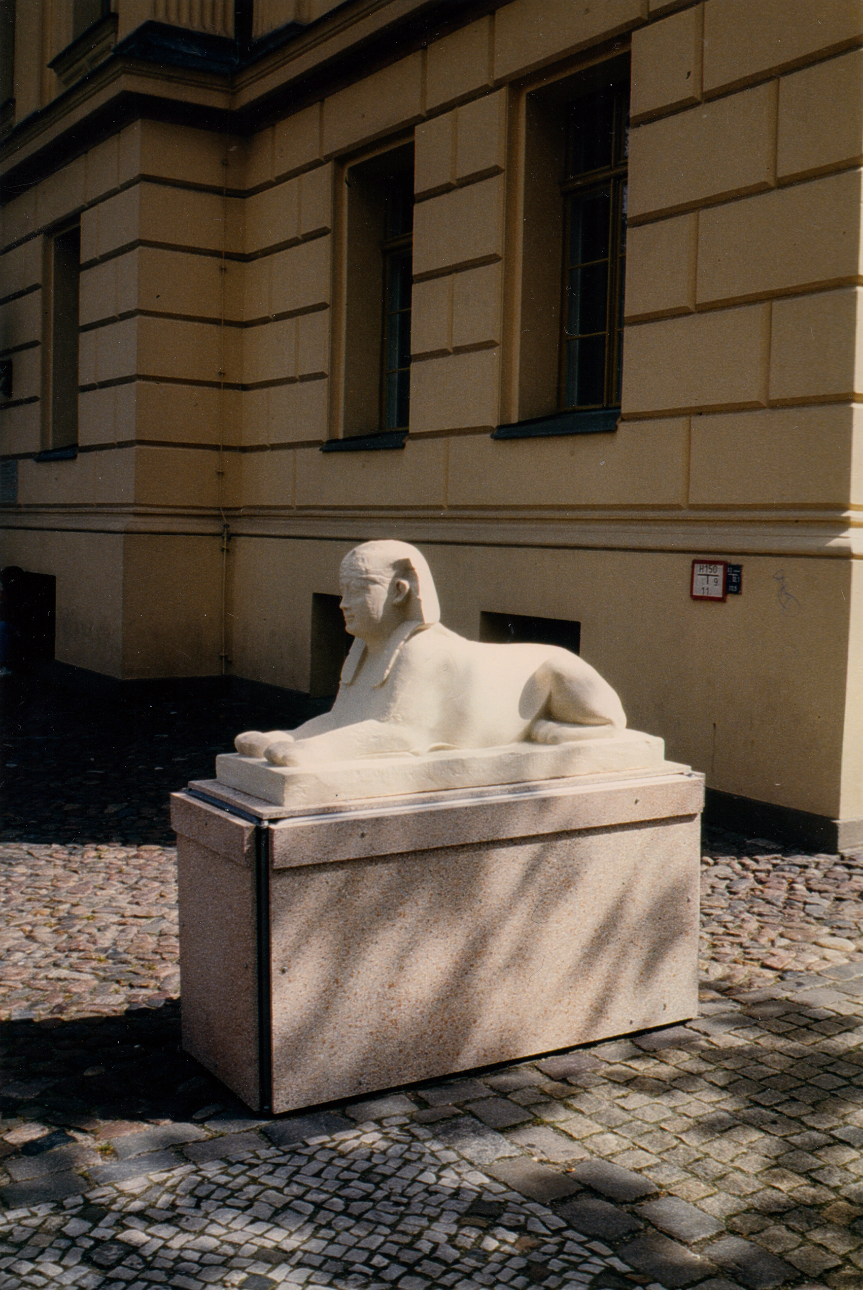 Mit Obelisken und Sphingen wurden die beiden Hauptachsen betont und darauf hingewiesen, dass die Ausstellung nicht im Haupthaus, sondern im Hof und im Gebäude des Sahu-Rê-Tempels stattfand. Aus ›System 180‹ wurden Gerüste gefertigt und mit Platten in marmorisierender Oberfläche belegt. Die überzeugende malerische Gestaltung stammt von Heinz Bert Dreckmann, von dem auch die drei letzten Fotos sind. Einige der Obelisken kaschierten so genannte Schinkelleuchten, die dem Ensemble ein allzu berlinisches Ambiente gegeben hätten.