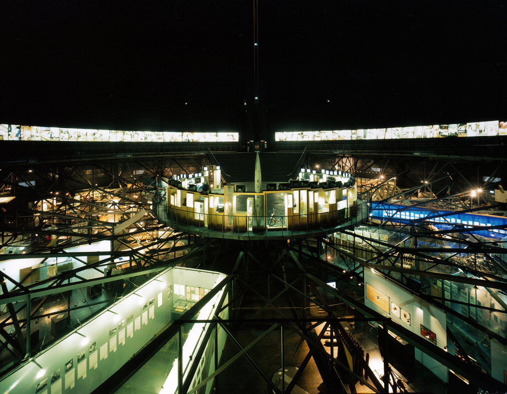 Gut zu erkennen sind auf dem ersten Bild der Ring (außen), die Tribüne (oben), die Manege (Mitte) und der Oberscheibenraum. Jedes Thema bespielte eines bis drei der 24 Segmente der Gasdruckscheibe. Wir entwickelten ein neuartiges, modulares Vitrinen- und ein lastverteilendes Podestsystem, das reduziert auf das Nötigste Objekte und Raum vereinigte. An den verschiedenen Farben der Aufnahmen ist zu erkennen, dass fast alle Lampentypen für eine auf jedes Kapitel angepasste Lichtinszenierung genutzt wurden.