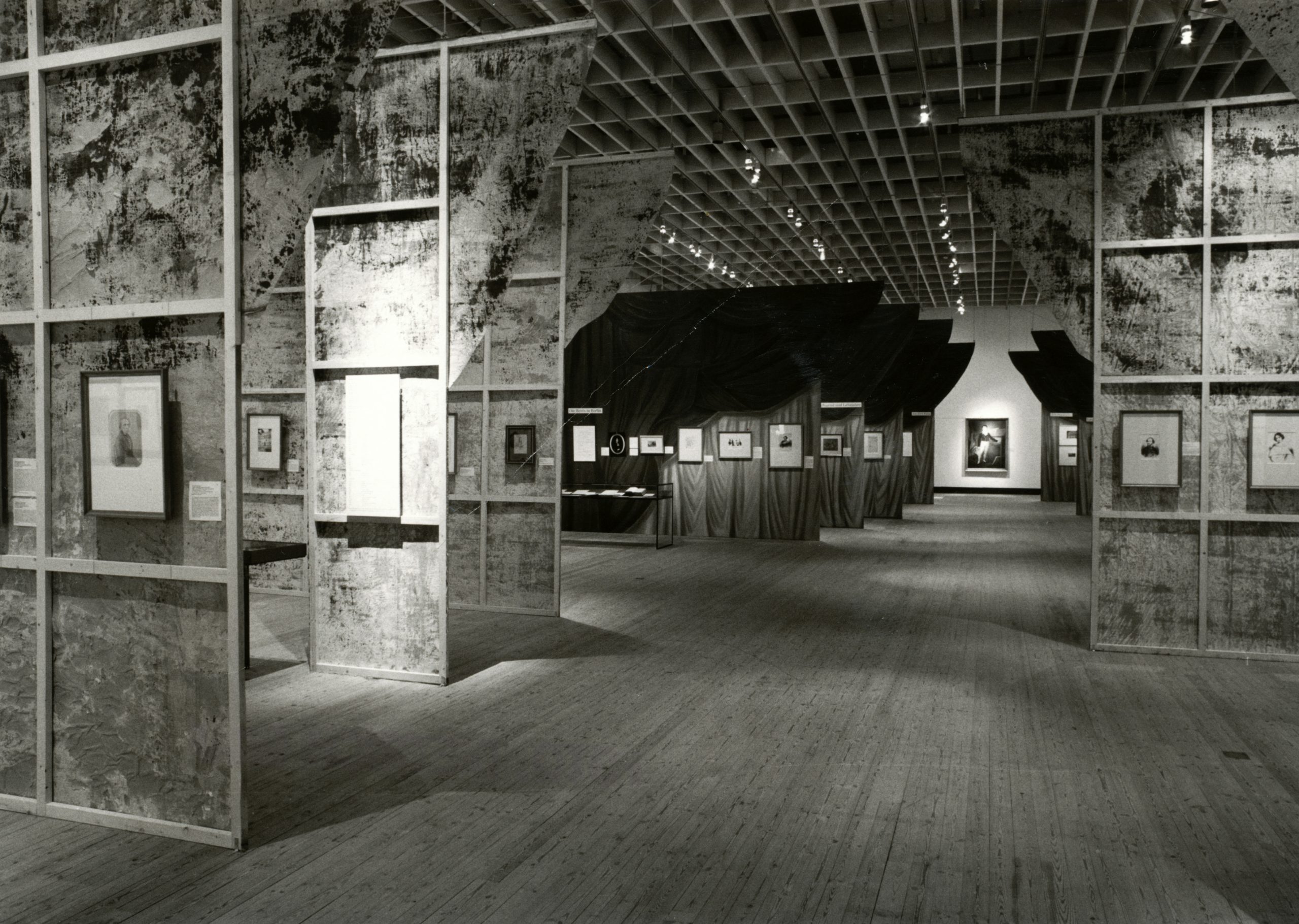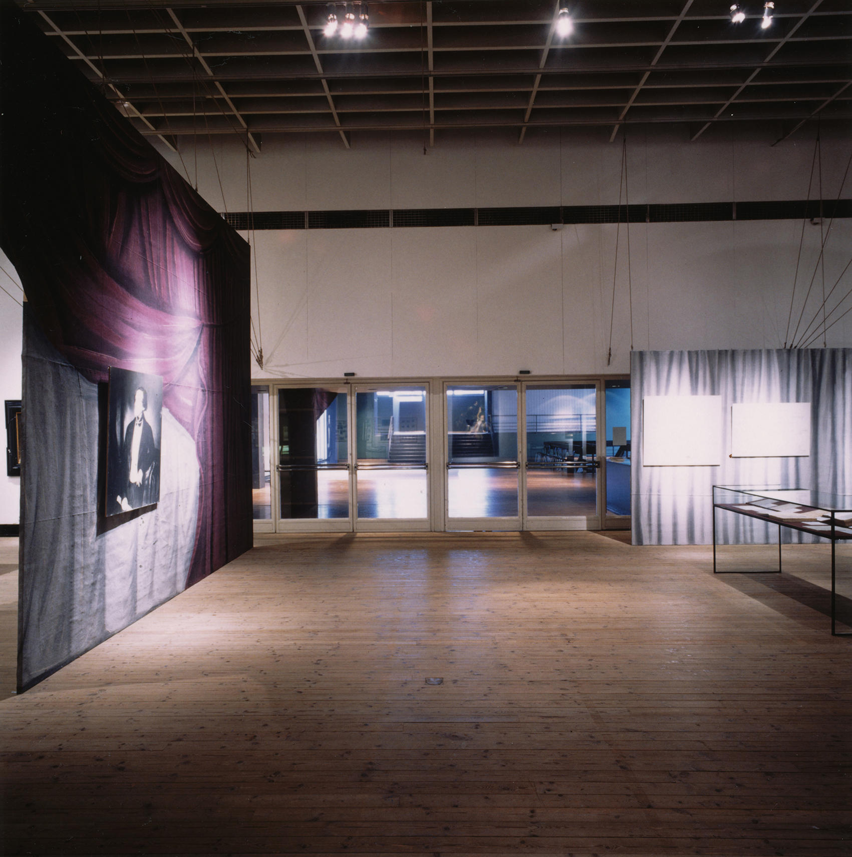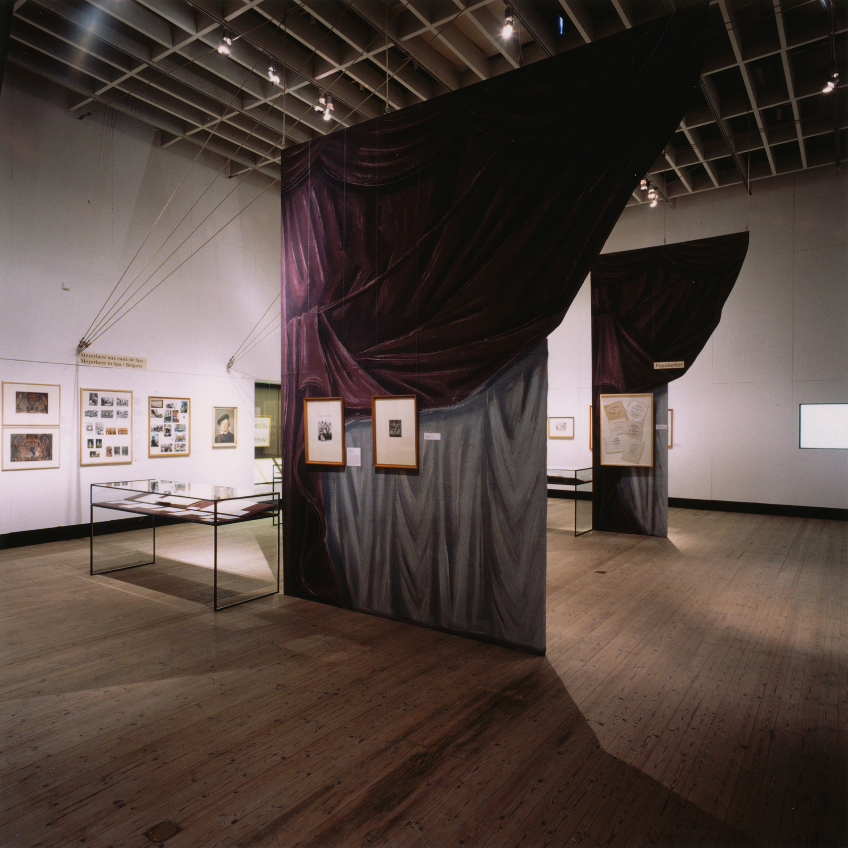 Heinz-Bert Dreckmann und Gabriele Sehringer bemalten Theaterleinen in Umrissen von Vorhängen, diese wurden dann auf Holzrahmen gespannt. Die Vorder- und Rückseiten der Wände waren ideale Ausstellungsträger. Tischvitrinen für Partituren und Bücher standen auf einem »Bühnenboden«. So fand mit dieser Schau das Theater einen Weg ins Museum.