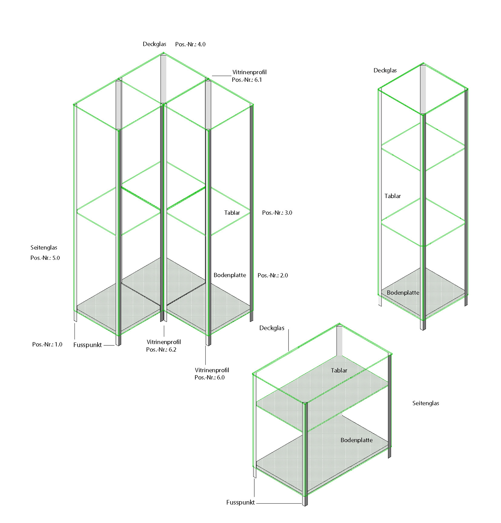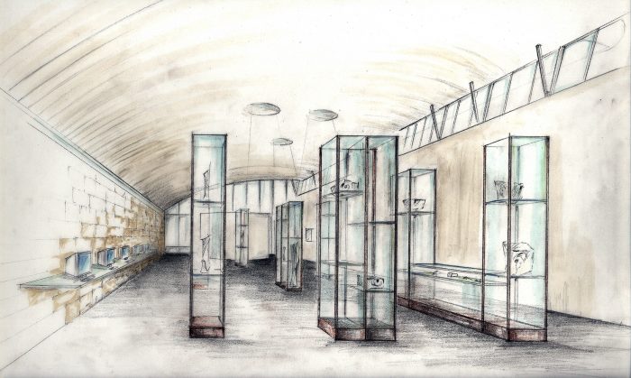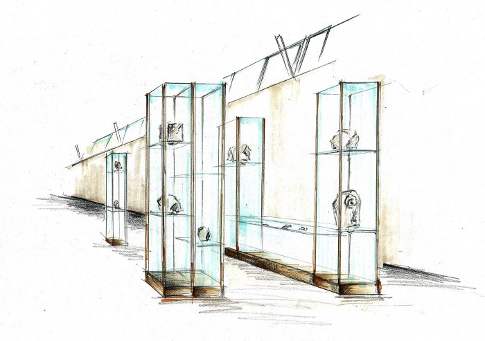 Die Halle gliedert sich in drei klar definierte Bereiche: den verglasten Eingangs- und Foyerbereich, die großflächige Ausstellungshalle mit hochwertigen, klimastabilen Vitrinen sowie einen abgetrennten Videobereich. Besonders markant sind die gebogenen Innenwände, die architektonisch sowie funktional für eine klare Raumstruktur sorgen. Materialien wie Sichtbeton, Kalksteinmauerwerk und ein gewölbtes Oberlichtdach aus Brettschichtholz prägen das Erscheinungsbild.