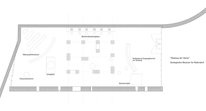 Das „Glashaus der Steine“ in der Heinitzstraße bildet den architektonischen Auftakt des Museumsparks Rüdersdorf. Als zentrale Ausstellungshalle bietet es interessierten Laien und Fachleuten einen geologischen Zugang zum Gelände.