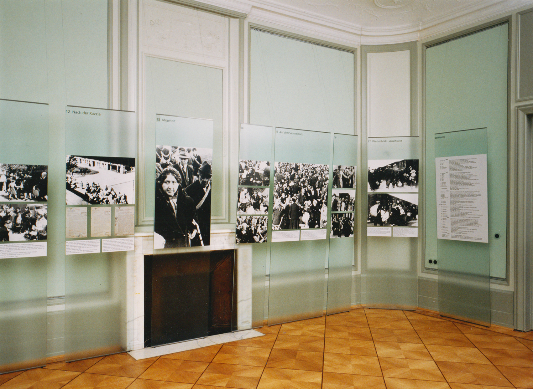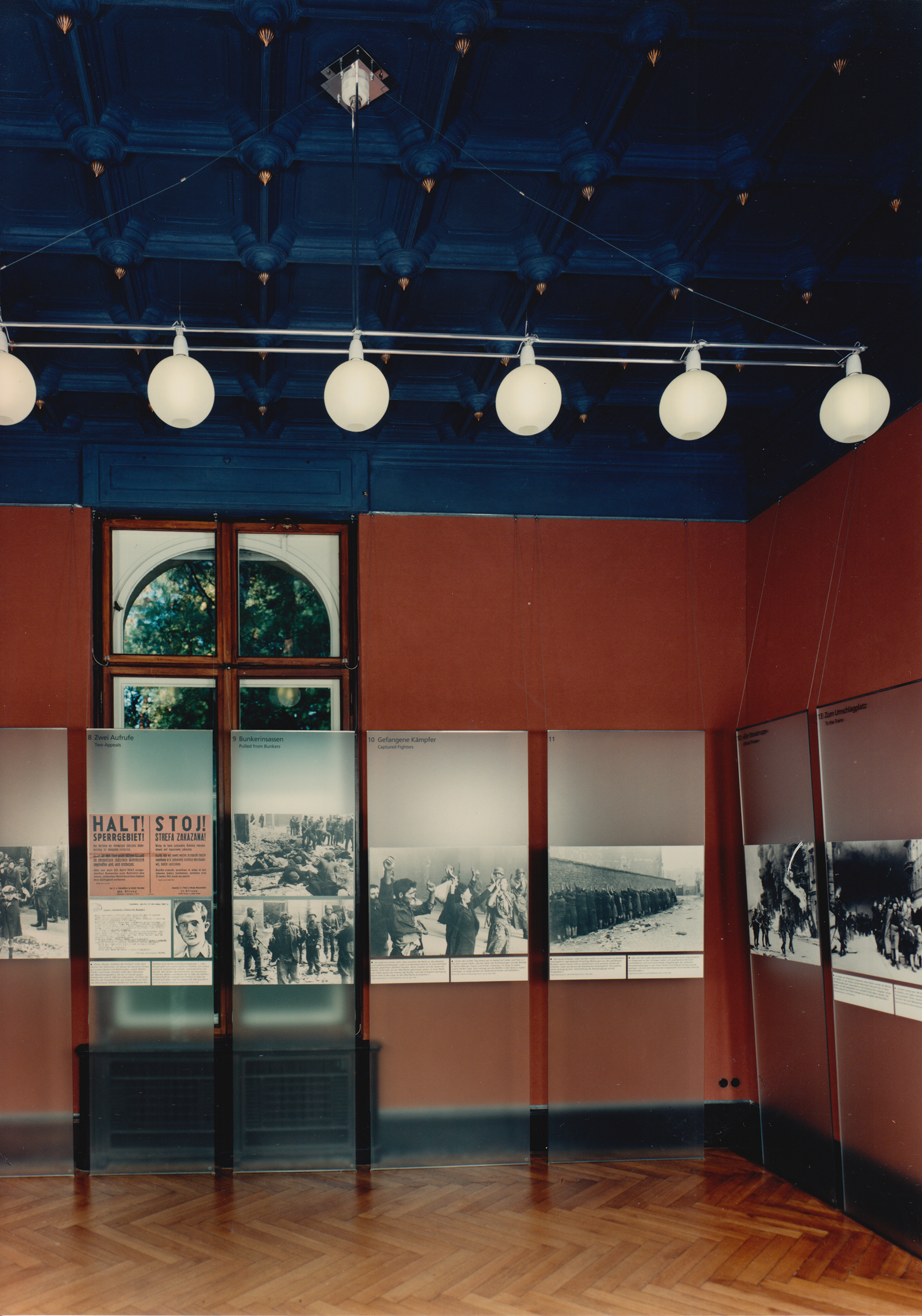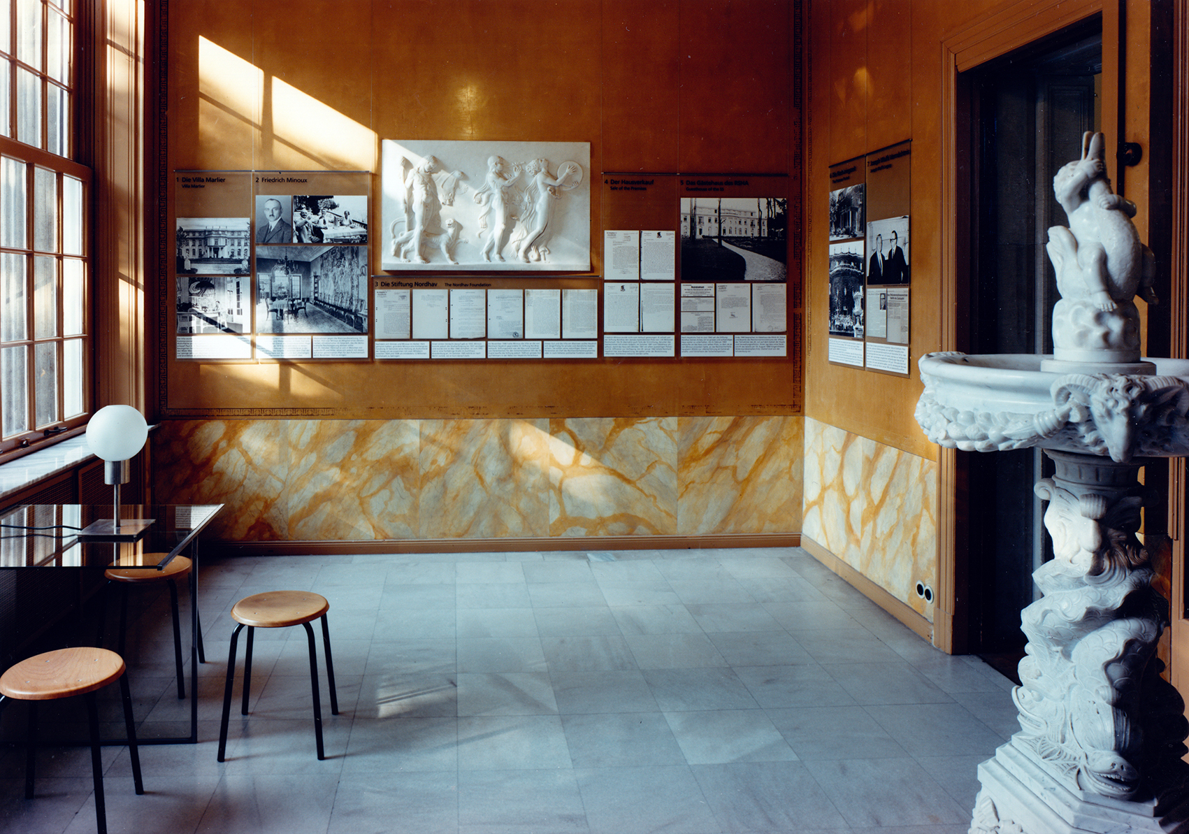 Alle vorgefundenen Architektur- und Schmuck-Elemente konnten sorgfältig in die Raumdramaturgie eingebaut werden und der großbürgerliche Impetus nach der nüchternen Nutzung als Landschulheim stilisiert neu interpretiert werden. Die meisten Räume erhielten neue Wandbespannungen auf einem sorgfältig basierten Farbkonzept, das sich auf wenige vorgefundene Fragmente stützte. Eine unaufgeregte, gleichmäßige Beleuchtung bezieht sich im Allgemeinen auf den Mittelauslass und kann dennoch weit in alle Ecken spannen. Wand- und Standleuchten harmonieren mit den Deckenleuchten. Dank zwischen Stuckatur und Wandbespannung dezent montierte Ankerschienen kann die Ausstellung durch feine Abspannung überall in den Räumen positioniert werden, auch vor Fenstern und Kaminen.