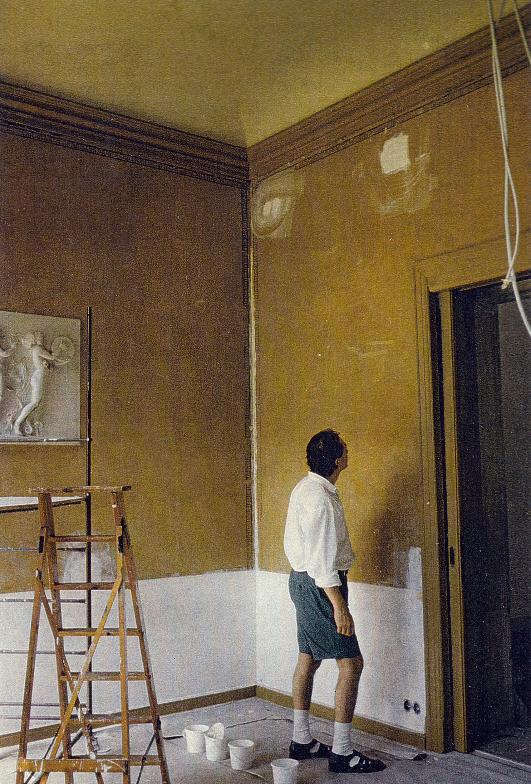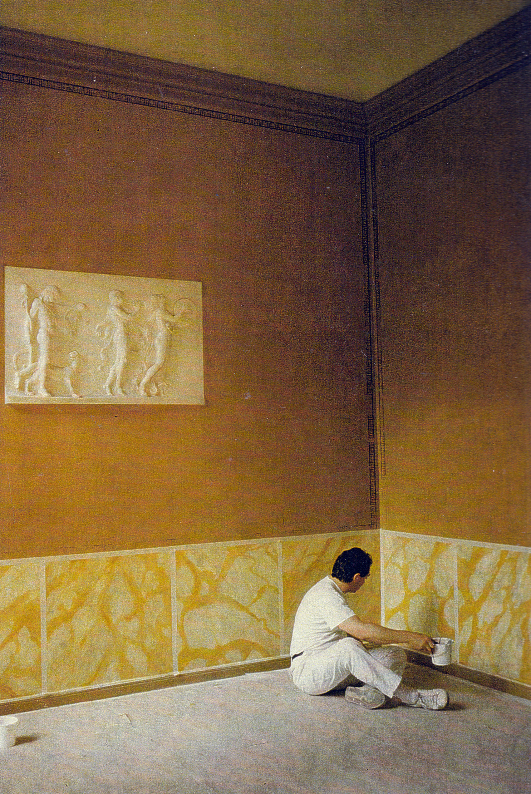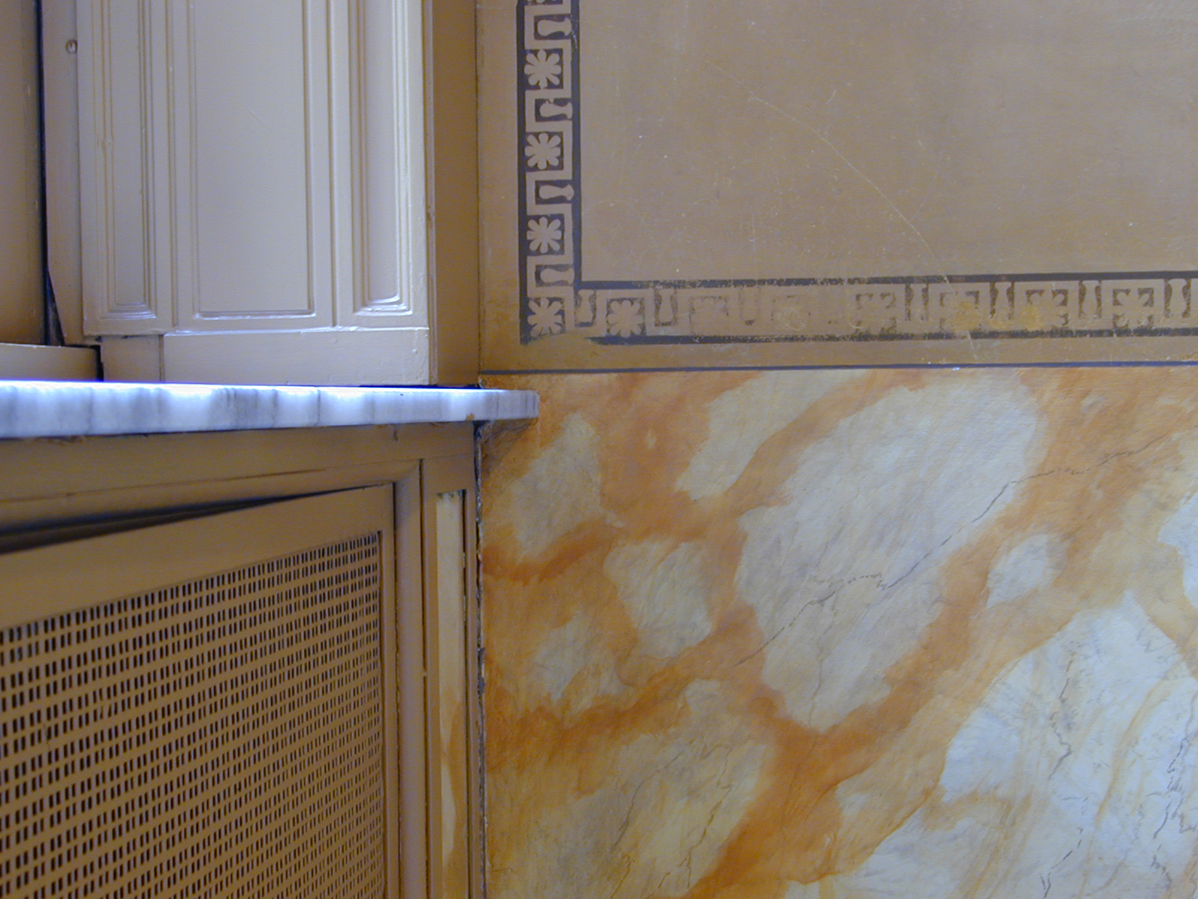 Im Wintergarten spürten Heinz-Bert Dreckmann und Gaby Sehringer unter vielen Schichten Tapeten den beschädigten Stucco Lustro auf, arbeiteten diesen auf und ersetzten fehlende Marmorplatten durch Malerei kongenial. Die beiden letzten Bilder hat Gaby Sehringer gemacht. Sie zeigen den Restaurierungszustand nach Entfernen der Raufaser und nach Abschluss der Restaurierung.