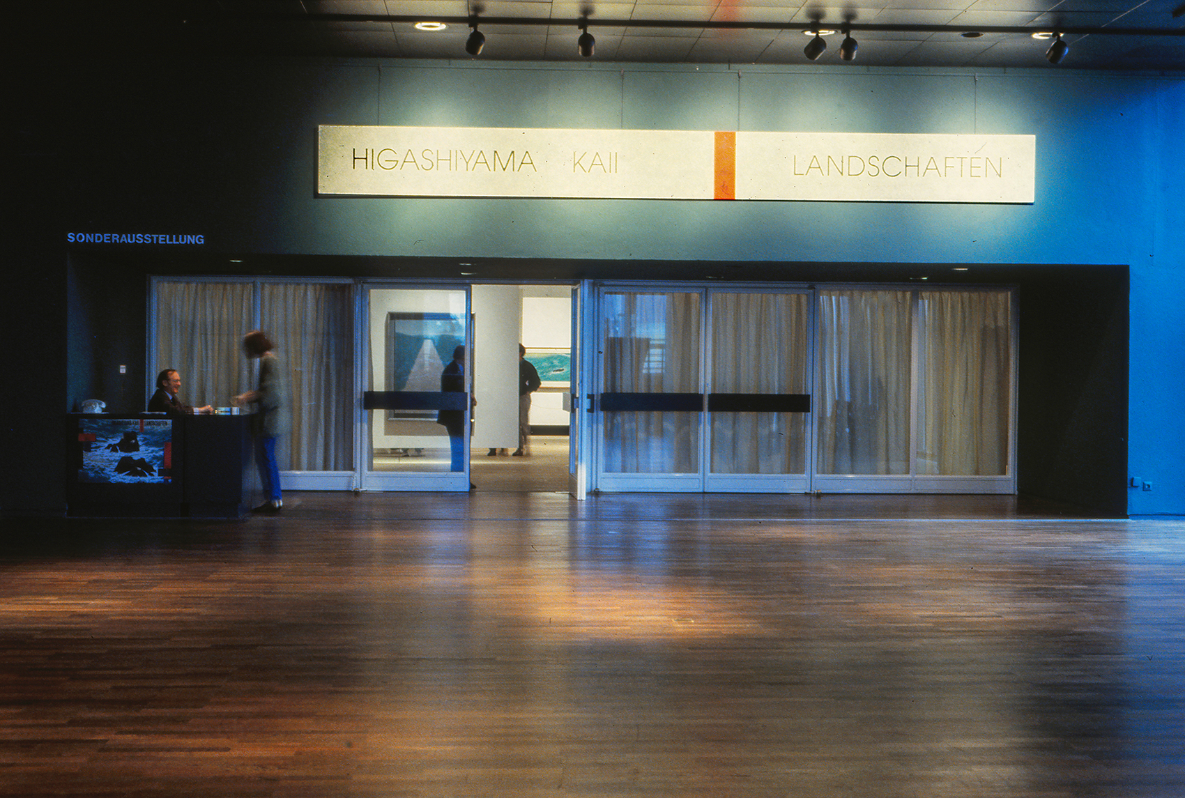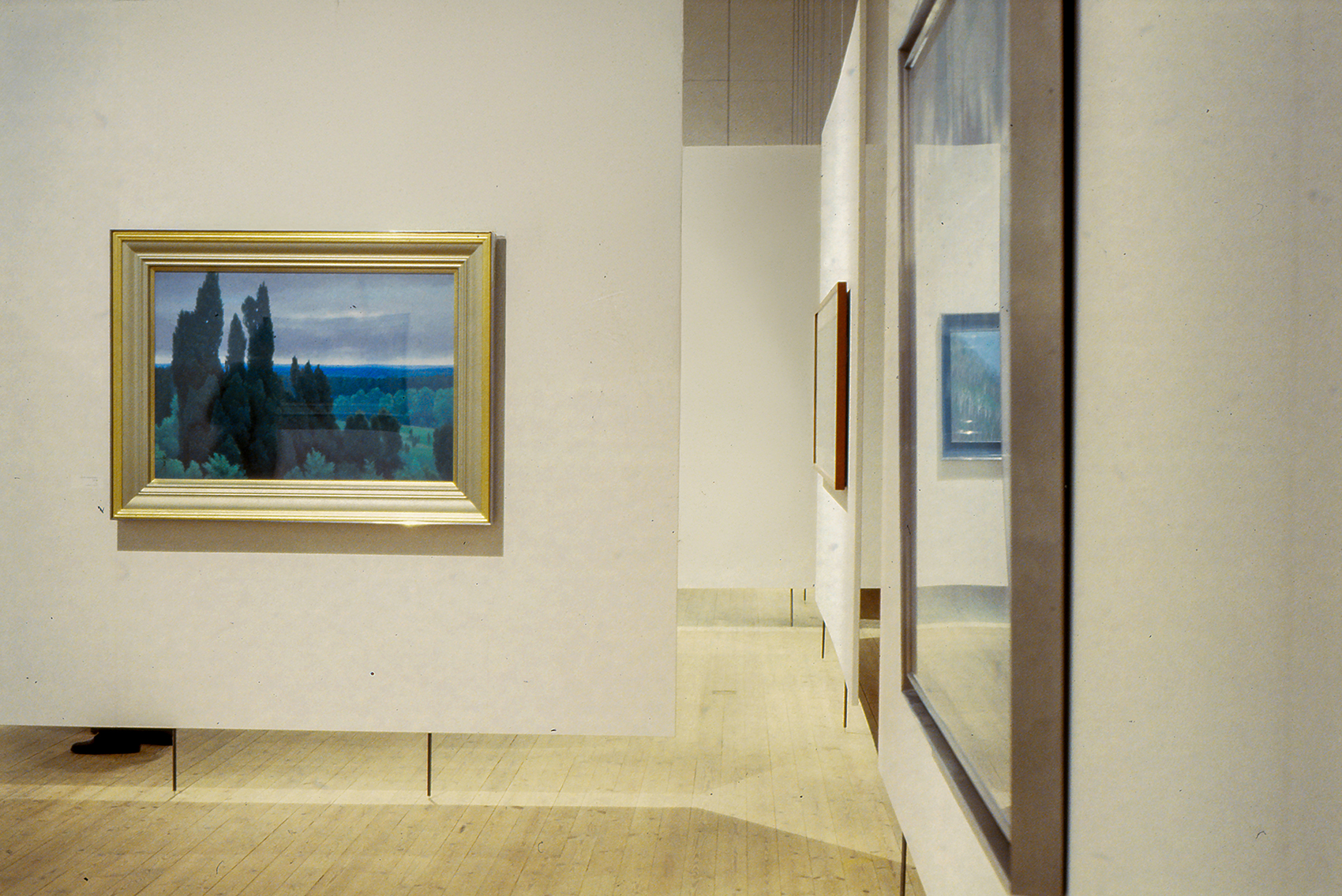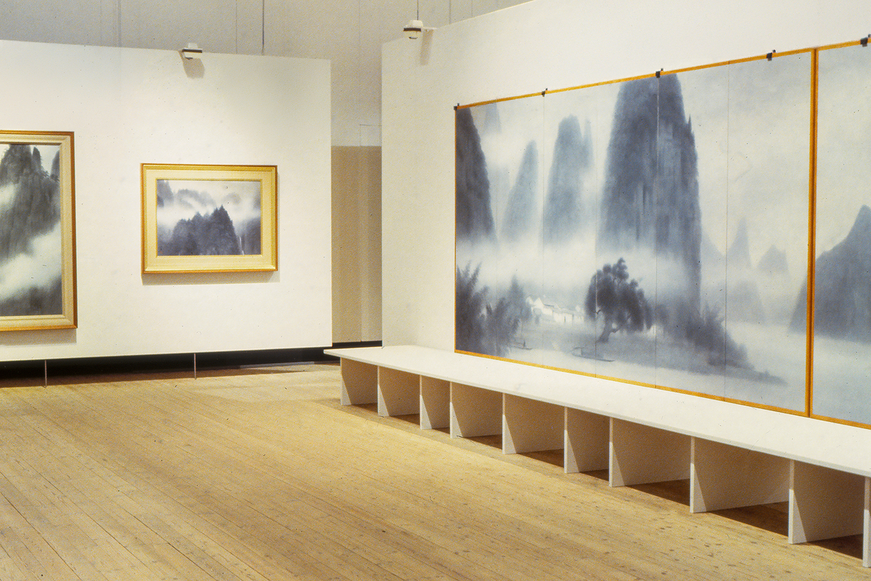 Die Sonderausstellungshalle der Dahlemer Museum ist mit einer stabilen technischen Decke ausgestattet. So konnten für die Gemäldeausstellung flache, 4 cm starke Wandflächen in einem rechtwinkligen Raster schwebend abgehängt werden; das Publikum wurde unmerklich geführt. Als nichtgeplante Hinzufügung verhinderten am Boden angebrachte feine Röhrchen mögliche Schaukelbewegungen. Wir suchten nach der Leichtigkeit, die die japanische Architektur auszeichnet. Die mit leuchtenden Farben gemalten Landschaftsbilder können auf den mit naturweisser Leimfarbe gestrichenen Paneelen in einen Dialog untereinander und mit dem Publikum treten.