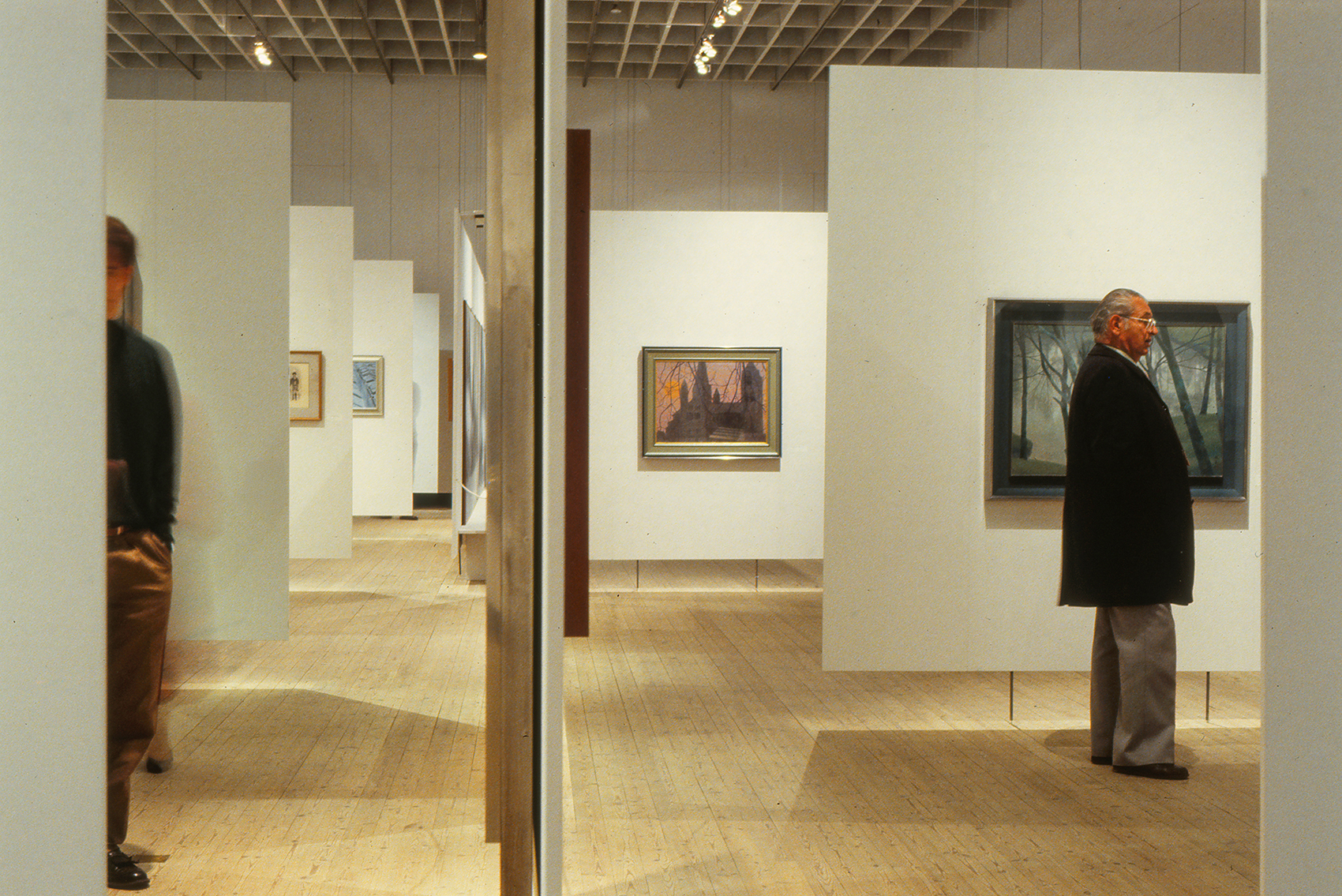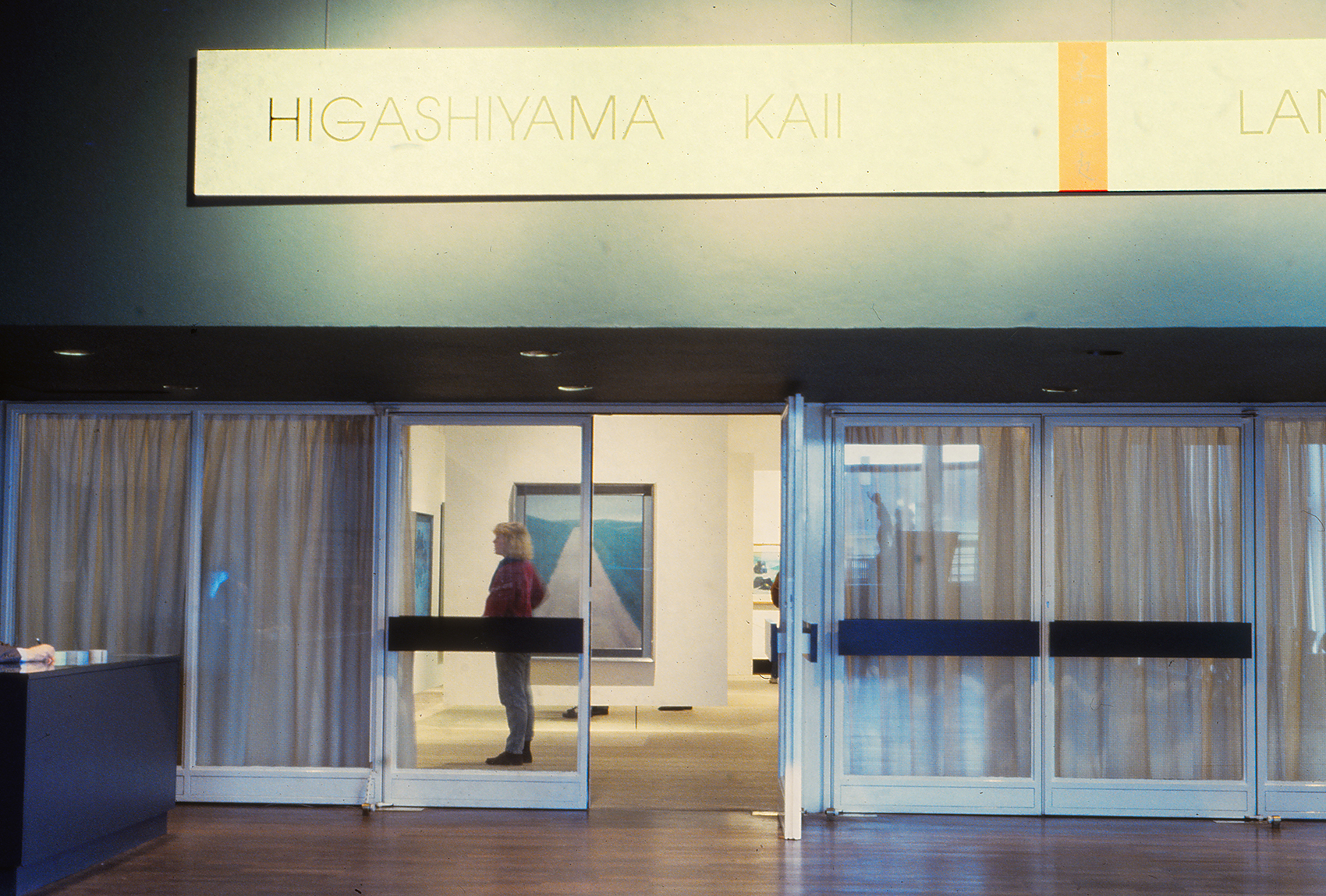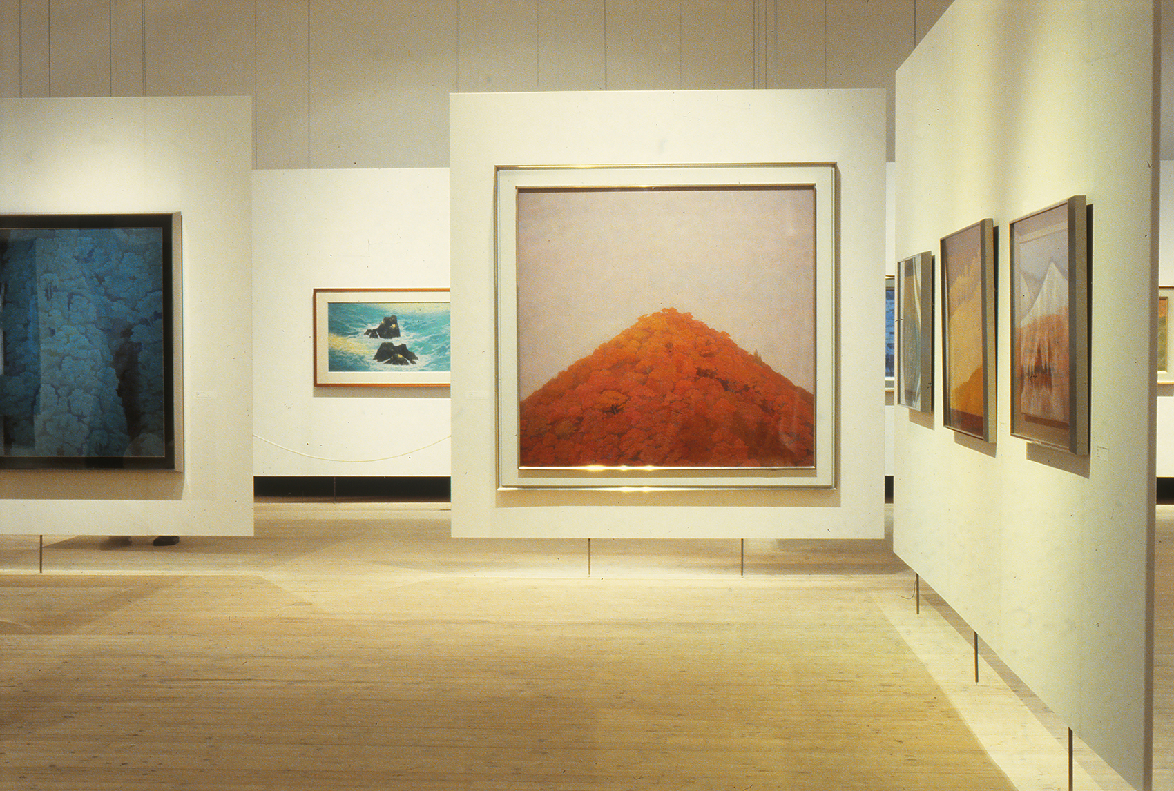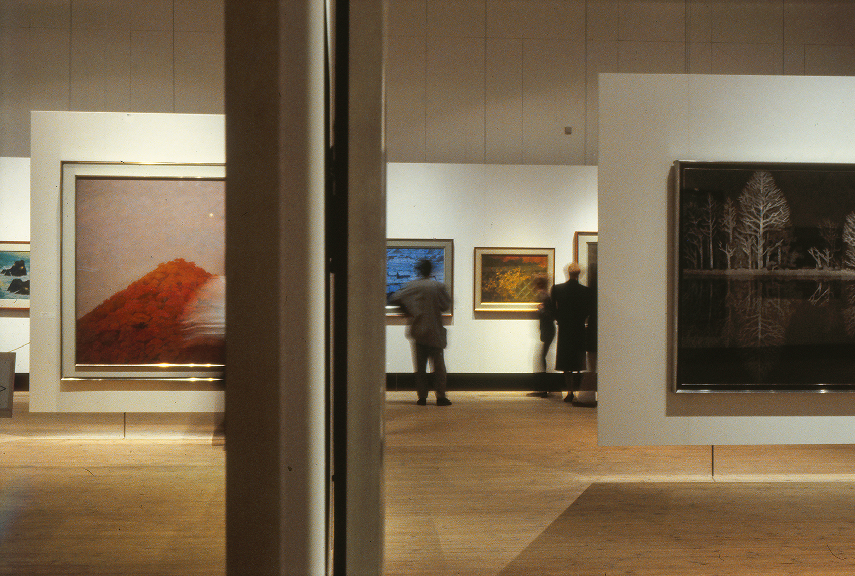 Die Sonderausstellungshalle der Dahlemer Museum ist mit einer stabilen technischen Decke ausgestattet. So konnten für die Gemäldeausstellung flache, 4 cm starke Wandflächen in einem rechtwinkligen Raster schwebend abgehängt werden; das Publikum wurde unmerklich geführt. Als nichtgeplante Hinzufügung verhinderten am Boden angebrachte feine Röhrchen mögliche Schaukelbewegungen. Wir suchten nach der Leichtigkeit, die die japanische Architektur auszeichnet. Die mit leuchtenden Farben gemalten Landschaftsbilder können auf den mit naturweisser Leimfarbe gestrichenen Paneelen in einen Dialog untereinander und mit dem Publikum treten.