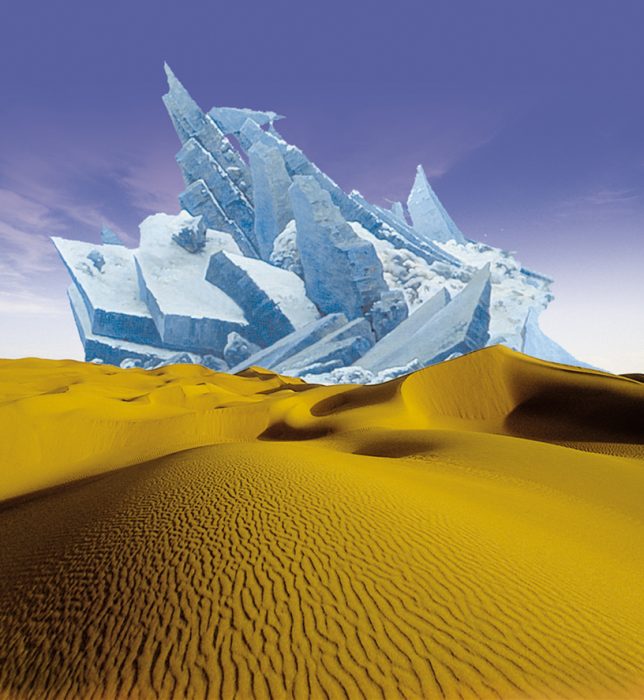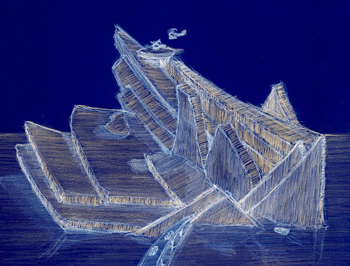 In connection to a project-study for building an unique Indoor Ski Complex for the kingdom of Bahrain, Prof. Steiner developed the “Iceberg”. In refer to an idea of the entertainment-guru Jörg von Hau the picture “Das Eismeer” by Caspar David Freidrich was chosen to be the example for this building. This draft represents a good example for the memo-activity of “Sculptural Architecture”. An “Iceberg” of 180 meters height, seams to swim in front of the island Bahrain, in front of the desert. Every leisure activity connected to ice, like skiing, ice skiing, toboggan are combined with hotels, shopping malls, a convention centre and an arctic zoo as well as with many other possible activities.