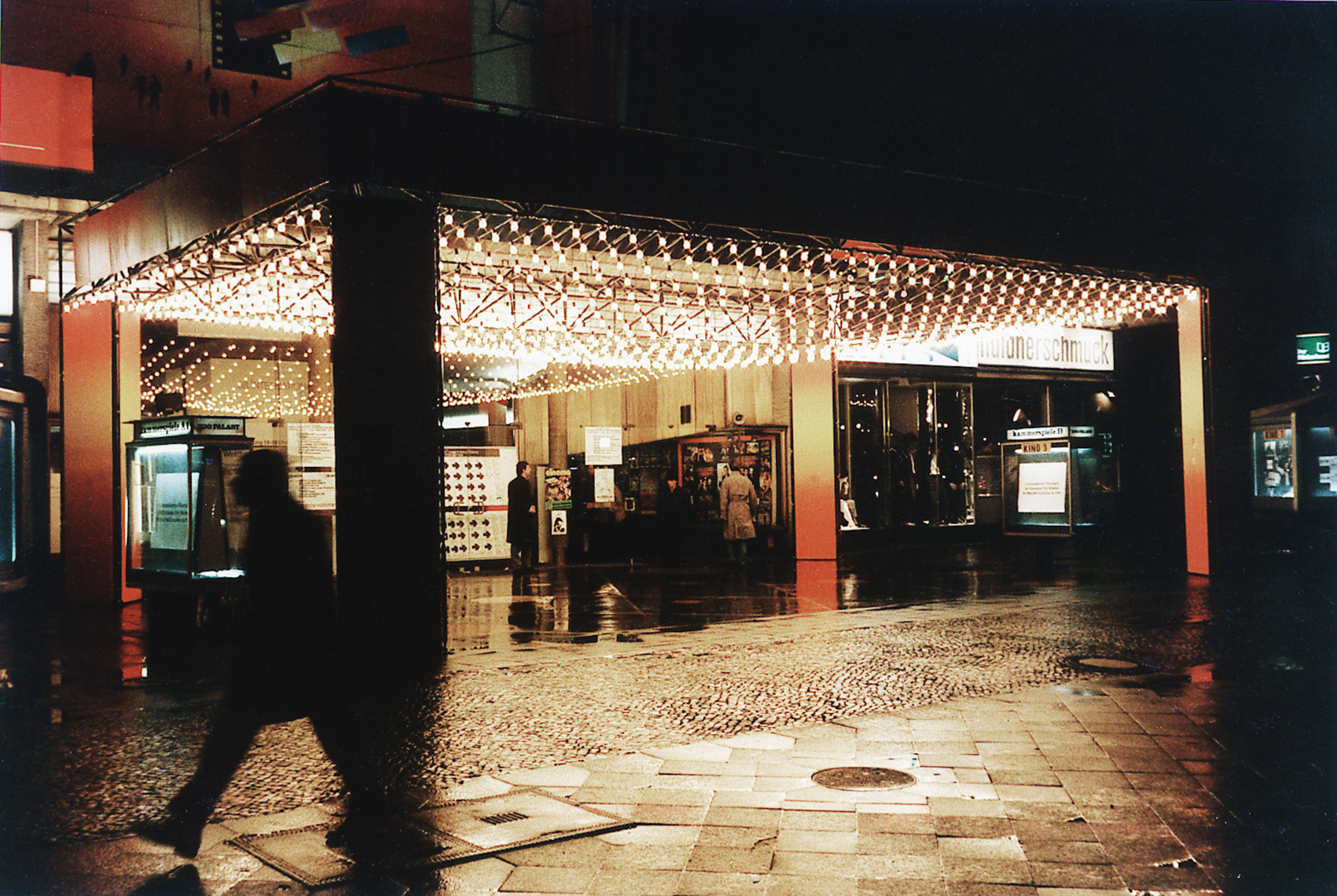 Auch das Licht wurde perfektioniert, indem Glühlampenreihen zur Mitte hin stärker durchhängend angebracht wurden, was ein weithin sichtbares »Glühlampenkissen« erzeugte, das sich in der gläsernen Türanlage spiegelte. Dem rötlichen Grundton des grafischen Auftritts 1988 folgten wir gern.