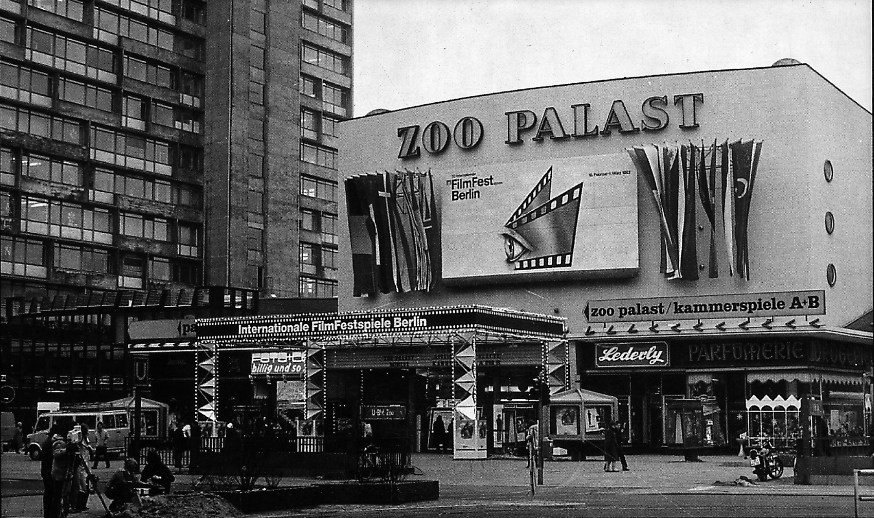 Nachdem im Vorjahr der groß angelegte Vorbau zwar sinnvoll, aber zu teuer war, beauftragten die Internationalen Filmfestspiele das Büro Steiner mit einer einfacheren Version. Man montierte vier umlaufende quaderförmige Balken aus Mero-System an vier prismatische Stützen, die mit Stoffbahnen etwas Masse bekamen.Als Erkennungszeichen zog sich ein Filmband um den oberen Balken. Scheinwerfer, zum Teil bunt eingefärbt, tauchten die Eingangszone des Kinos in ein szenisches Licht – ein Signal, das atmosphärisch der abendlichen Hauptspielzeit des Festivals entsprach. Der temporäre Bau hatte keinen direkten oder praktischen Nutzen; er präsentierte sich als reine Festarchitektur.
