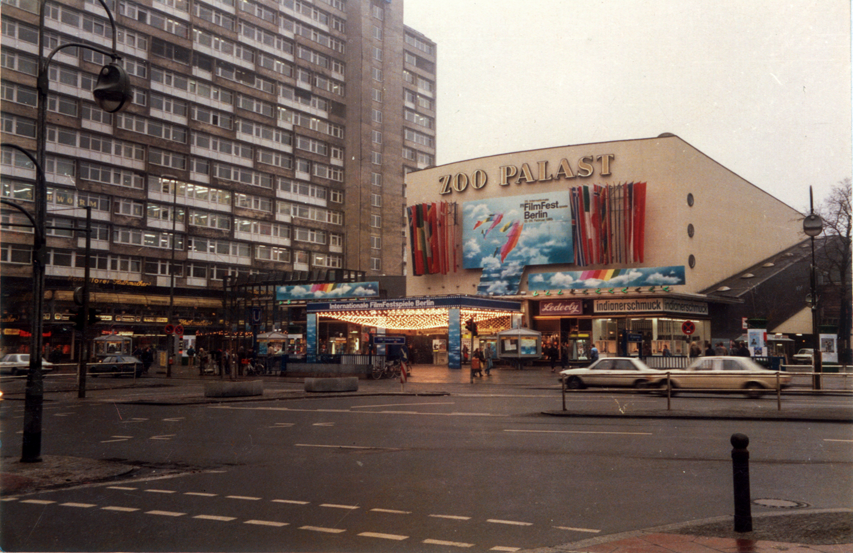 In jedem neuen Jahr wurde eine Verbesserung der Ausstattung des Kinovorbaus in Angriff genommen. An dem Foto fällt auf, dass die künstliche Festbeleuchtung trotz des Tageslichts einen eindeutigen Anziehungspunkt markiert. Beim trüben Licht eines Februartages konnte sich das künstliche Licht um so strahlender abheben. Die warme Lichtfarbe der klaren Glühlampen mit einer Leistung von je 40 Watt verwandelte den Ort vor dem Kino – normalerweise nicht besonders ansprechend und ungünstig ›möbliert‹ – in einen Treffpunkt.Die Strahlkraft der Lampen erwärmte jene Festivalgäste, die bei kaltem Wetter mehrere Stunden für Karten anstanden. Die Adaption des grafischen Auftritts, der jährlich wechselte, gelang uns immer besser.