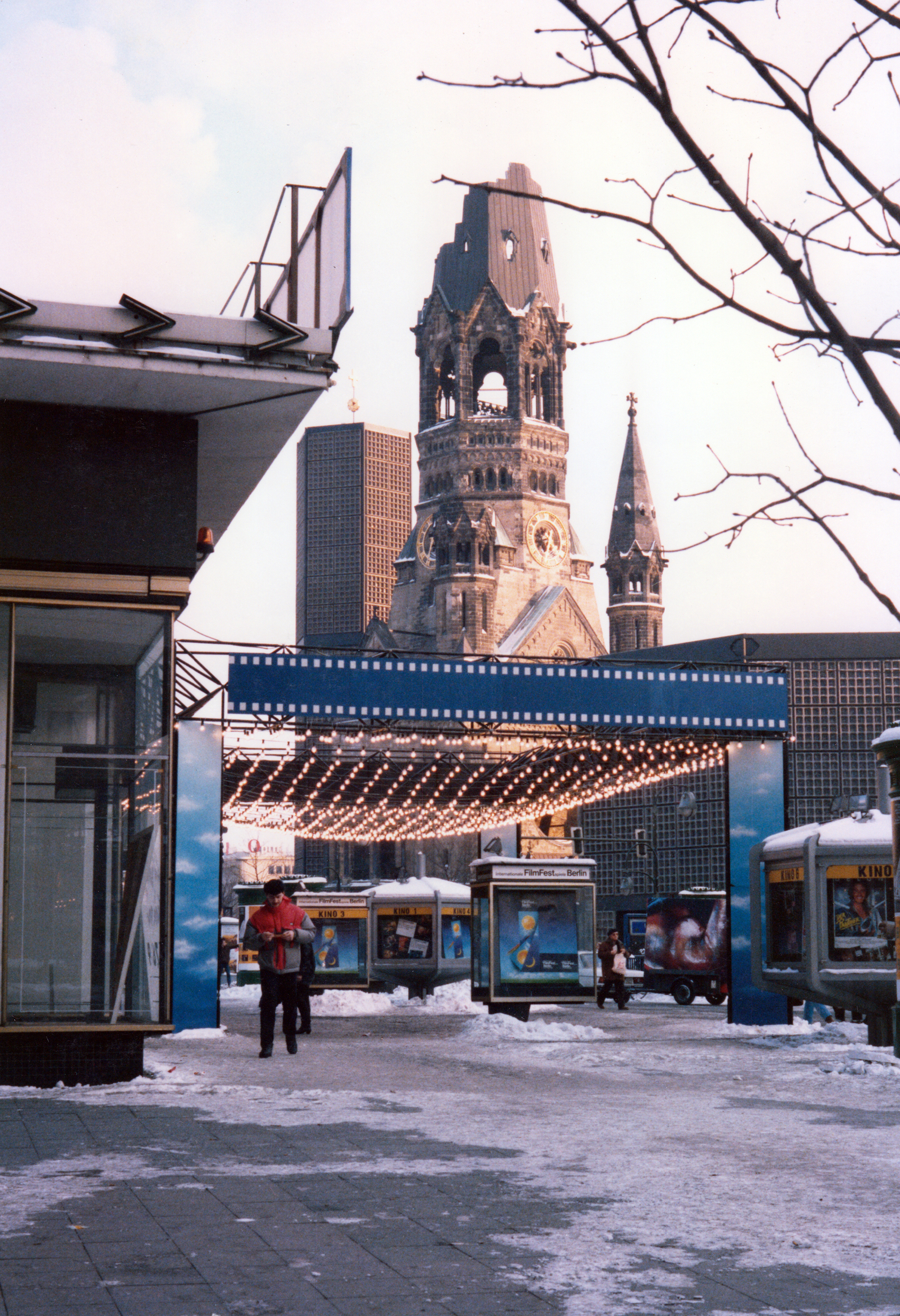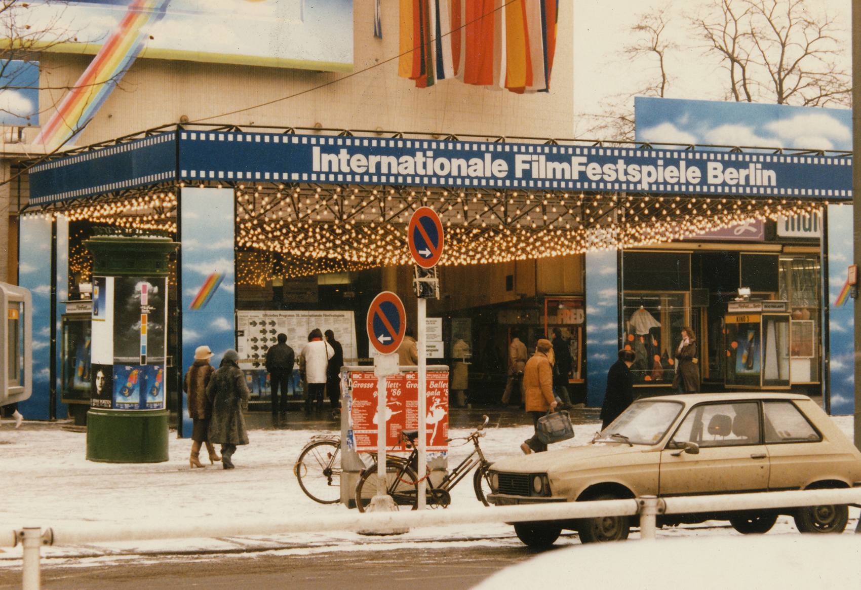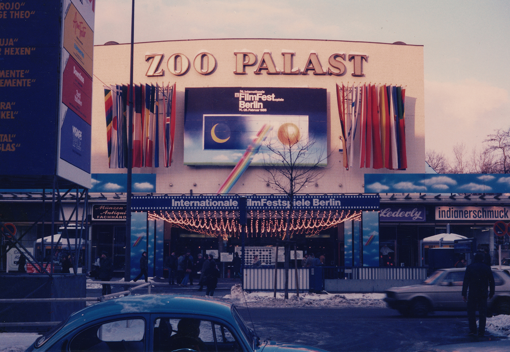 In jedem neuen Jahr wurde eine Verbesserung der Ausstattung des Kinovorbaus in Angriff genommen. Auf dem Foto fällt auf, dass die künstliche Festbeleuchtung selbst bei Tageslicht einen deutlichen Anziehungspunkt darstellt. Besonders im trüben Licht eines Februartages konnte das künstliche Licht seine Strahlkraft noch stärker entfalten. Die warme Lichtfarbe der klaren Glühlampen mit jeweils 40 Watt Leistung verwandelte den ansonsten wenig einladenden und ungünstig „möblierten“ Bereich vor dem Kino in einen echten Treffpunkt. Die Leuchtkraft der Lampen spendete Wärme – vor allem jenen Festivalgästen, die bei kaltem Wetter stundenlang für Eintrittskarten anstanden. Auch die jährliche Adaption des grafischen Erscheinungsbildes gelang uns von Jahr zu Jahr besser.