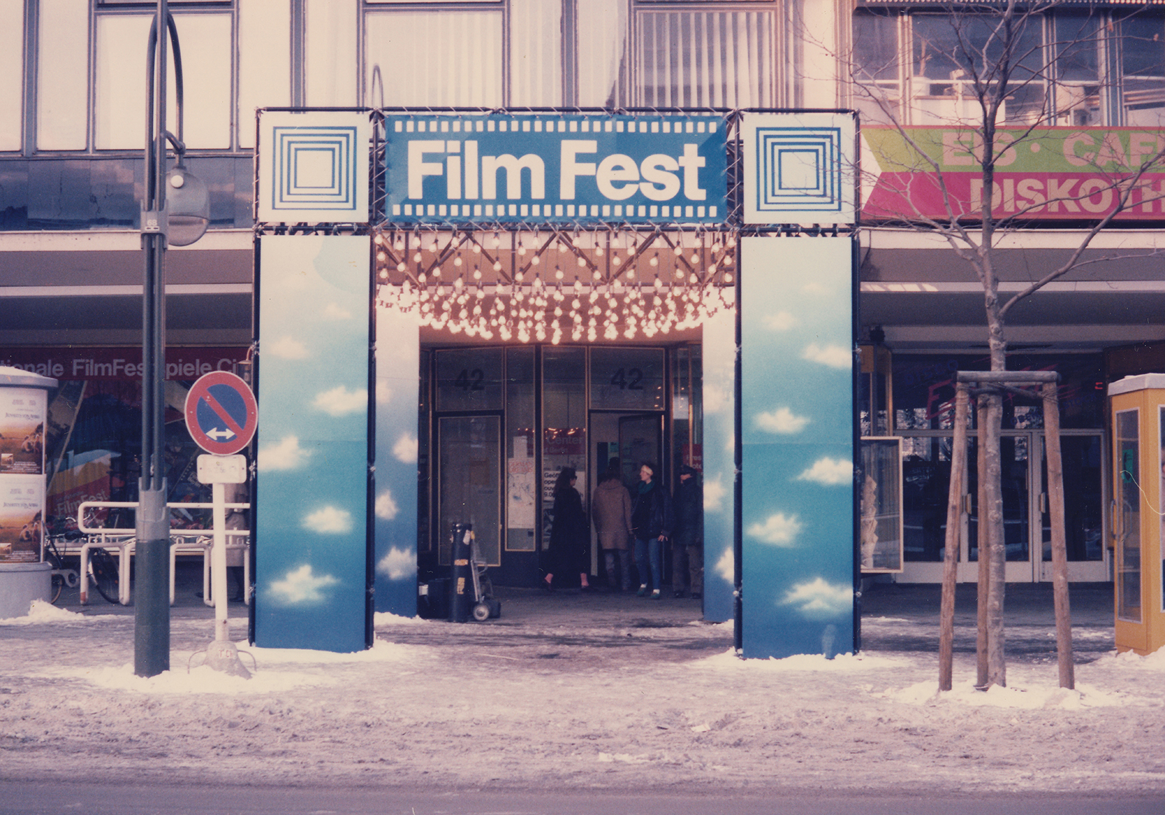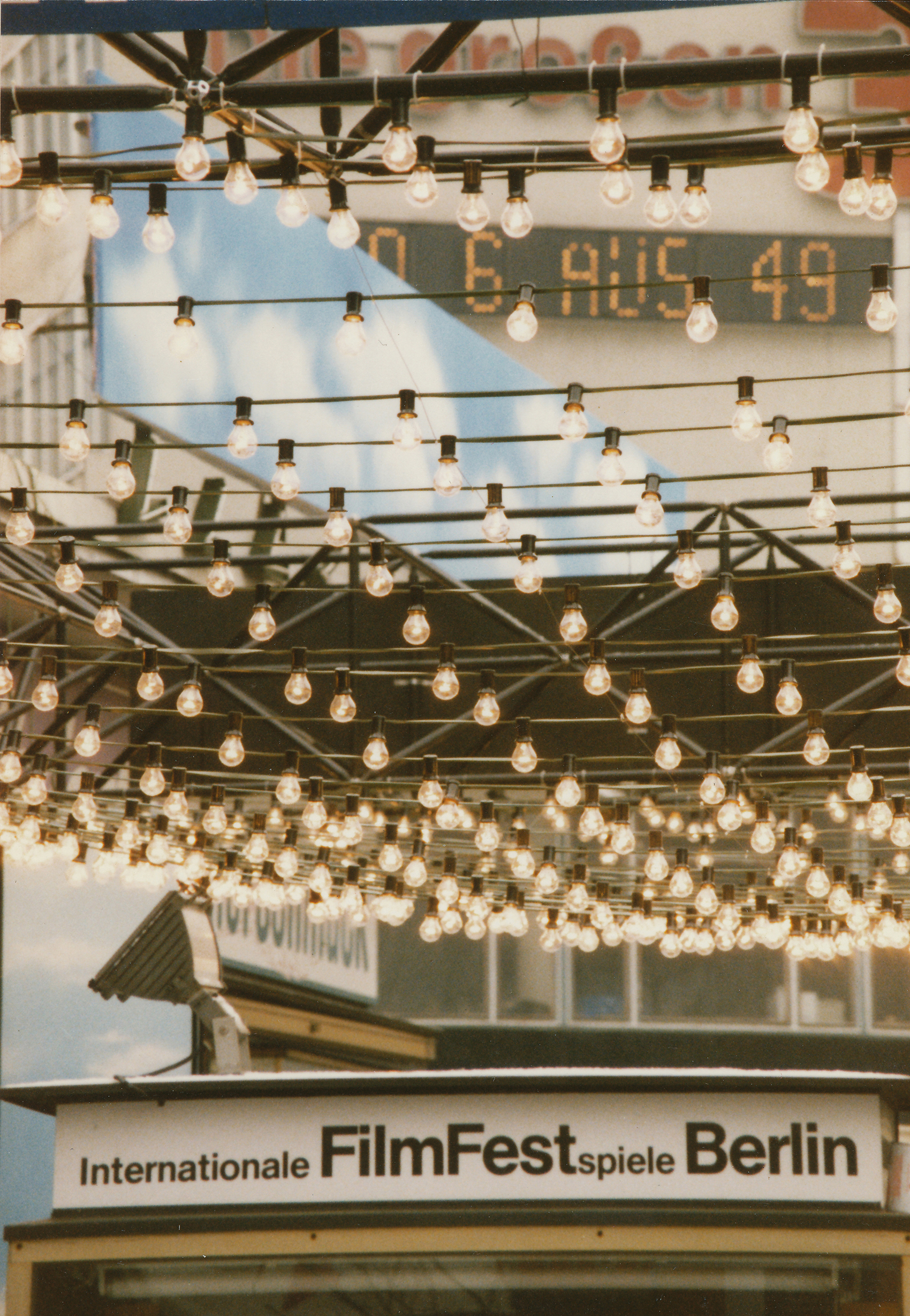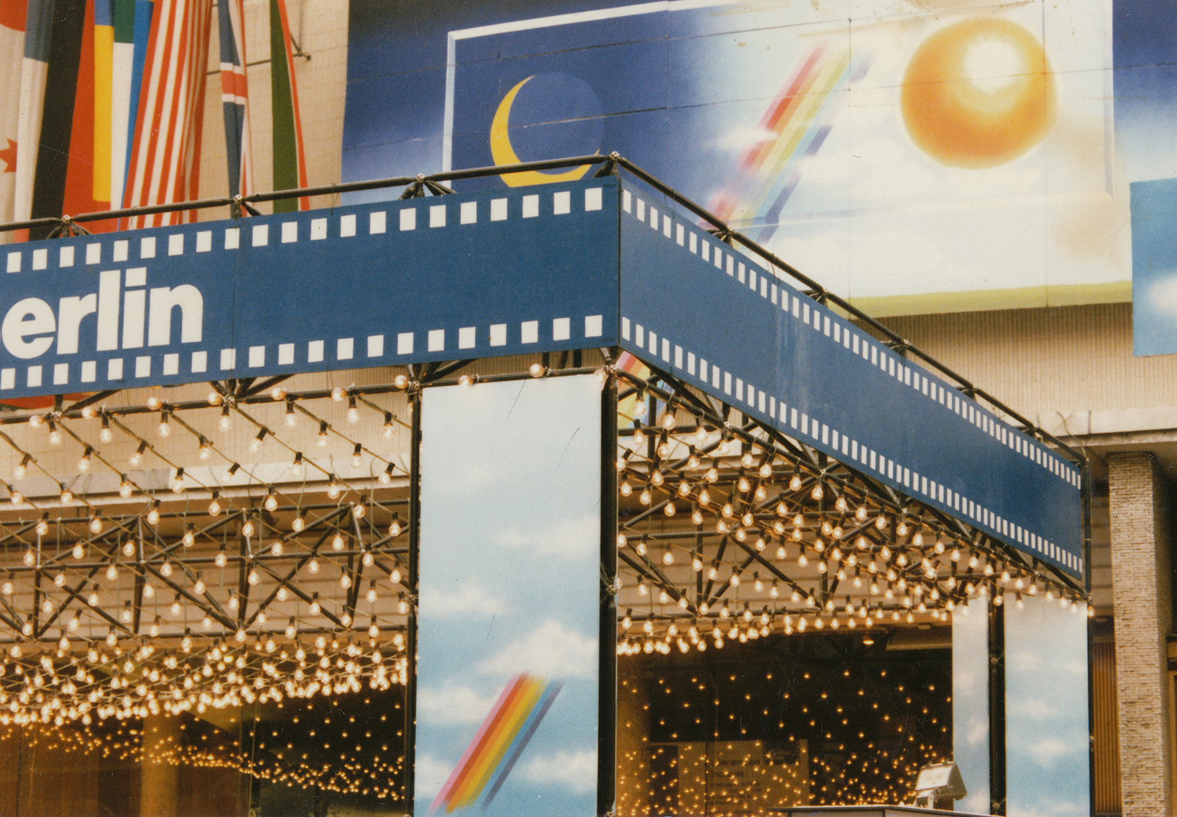 Bei dem diesjährigen Filmfest waren Vorbauten an verschiedenen Orten gefordert. Stellvertretend für vier weitere Objekte ist hier eine Festarchitektur auf einem breiten, wenig frequentierten Bürgersteig vor einer Ladenpassage und der Kunsthalle (in der ersten Etage) im so genannten Bikini-Haus abgebildet: ein aus vier waagrechten Balken und vier Pfeilern errichtetes Gerüst. Die Stützen wurden allseitig verkleidet. Hauptaugenmerk war die Beleuchtung: Verschieden lange Glühlampenketten bildeten einen veritablen Kronleuchter im oberen Bereich des Gerüstrostes. In der Kunsthalle war der Filmmarkt untergebracht, in günstiger Nähe zu den Hauptspielstätten trafen sich hier Produzenten und Verleiher.Heute ist beim Bikini-Haus zwar die Namensgebung nicht mehr nachzuvollziehen – das Luftgeschoss, das die Zweiteilung in der Vertikalen bewirkte, ist geschlossen – doch eine Attraktivierung wie damals ist nicht mehr notwendig.