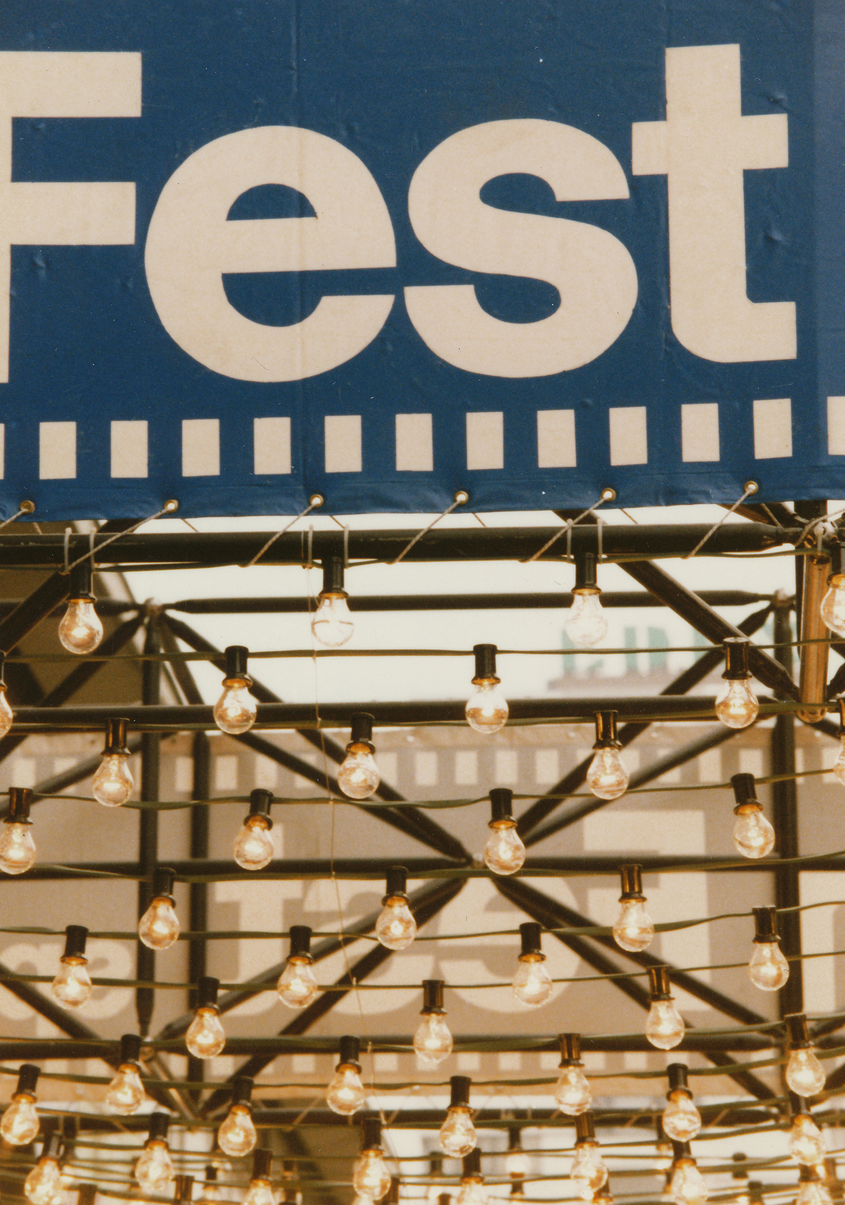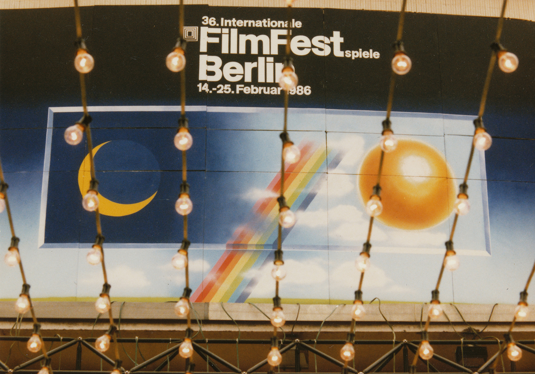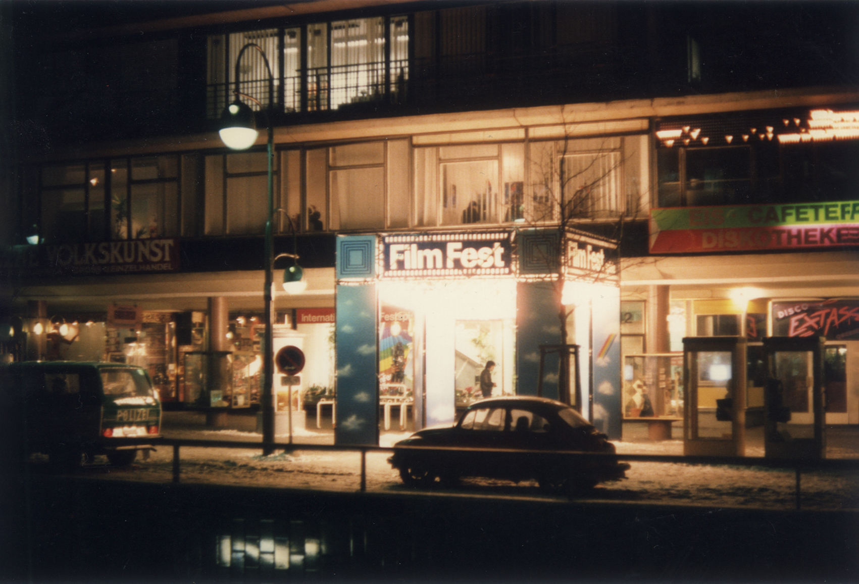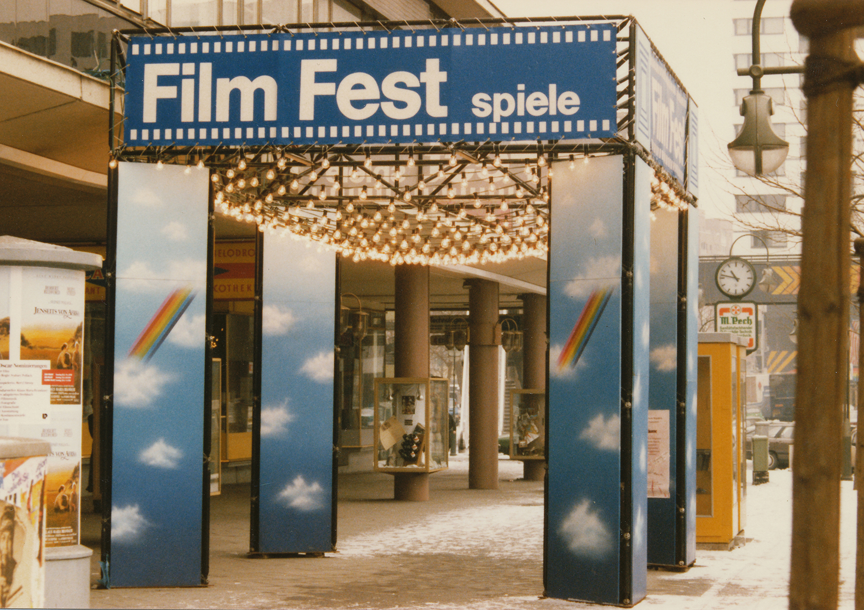 Bei dem diesjährigen Filmfest waren Vorbauten an verschiedenen Orten gefordert. Stellvertretend für vier weitere Objekte ist hier eine Festarchitektur auf einem breiten, wenig frequentierten Bürgersteig vor einer Ladenpassage und der Kunsthalle (in der ersten Etage) im so genannten Bikini-Haus abgebildet: ein aus vier waagrechten Balken und vier Pfeilern errichtetes Gerüst. Die Stützen wurden allseitig verkleidet. Hauptaugenmerk war die Beleuchtung: Verschieden lange Glühlampenketten bildeten einen veritablen Kronleuchter im oberen Bereich des Gerüstrostes. In der Kunsthalle war der Filmmarkt untergebracht, in günstiger Nähe zu den Hauptspielstätten trafen sich hier Produzenten und Verleiher.Heute ist beim Bikini-Haus zwar die Namensgebung nicht mehr nachzuvollziehen – das Luftgeschoss, das die Zweiteilung in der Vertikalen bewirkte, ist geschlossen – doch eine Attraktivierung wie damals ist nicht mehr notwendig.