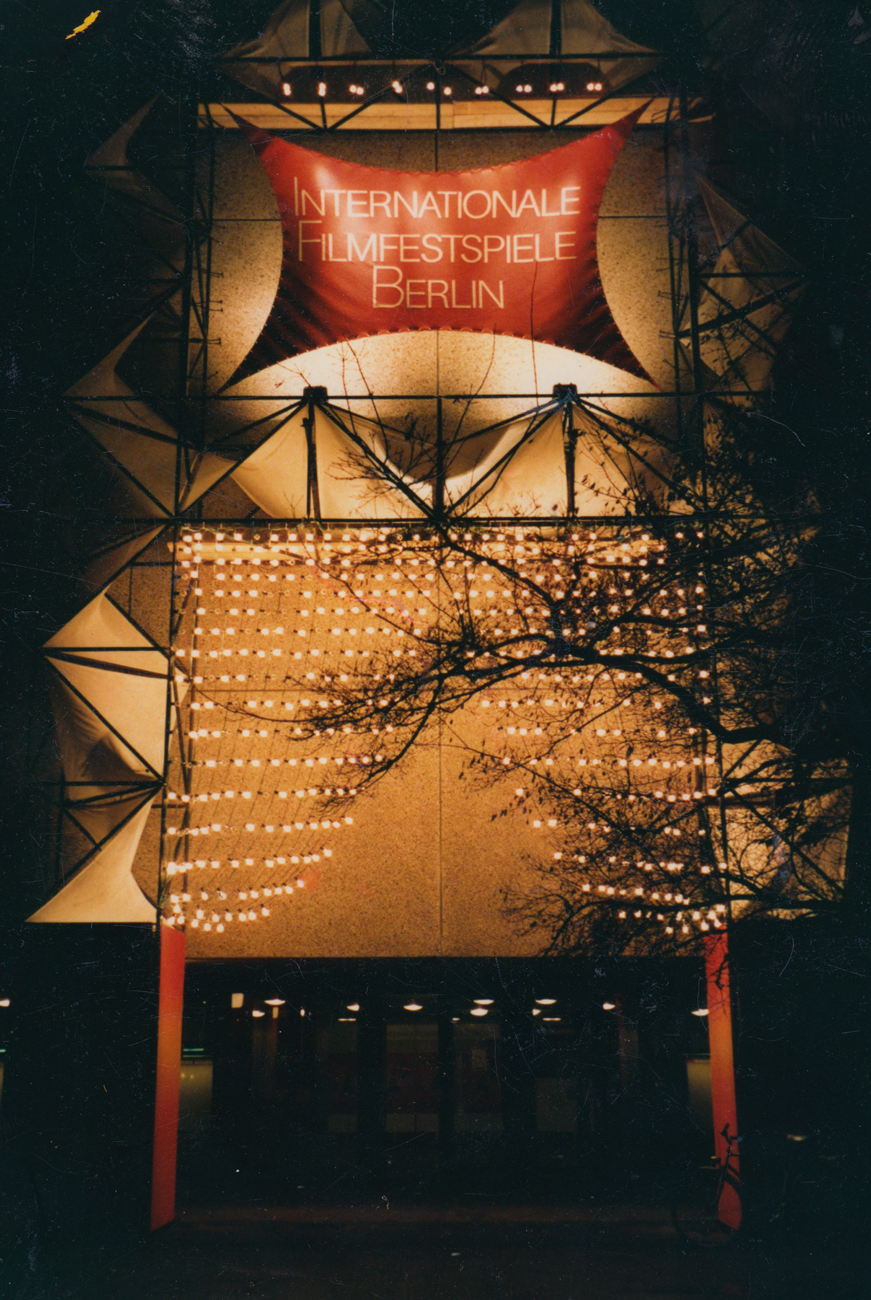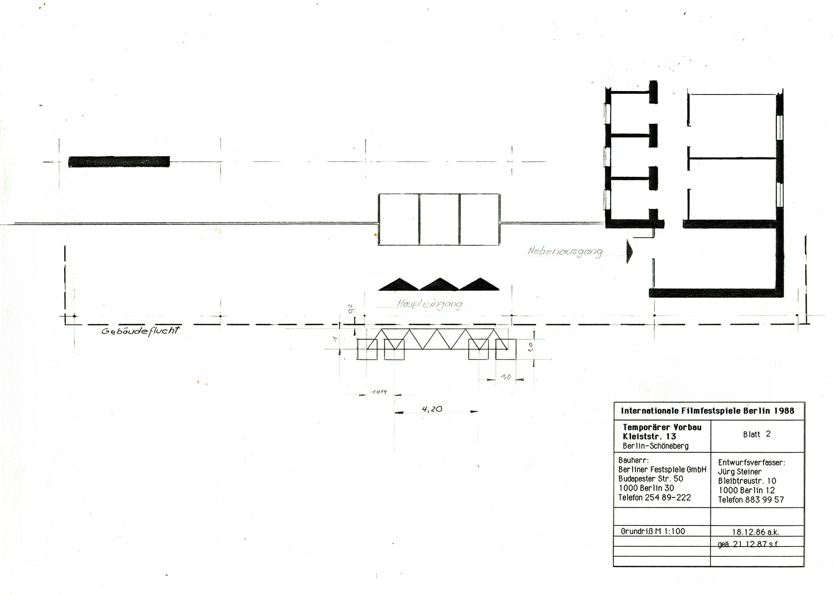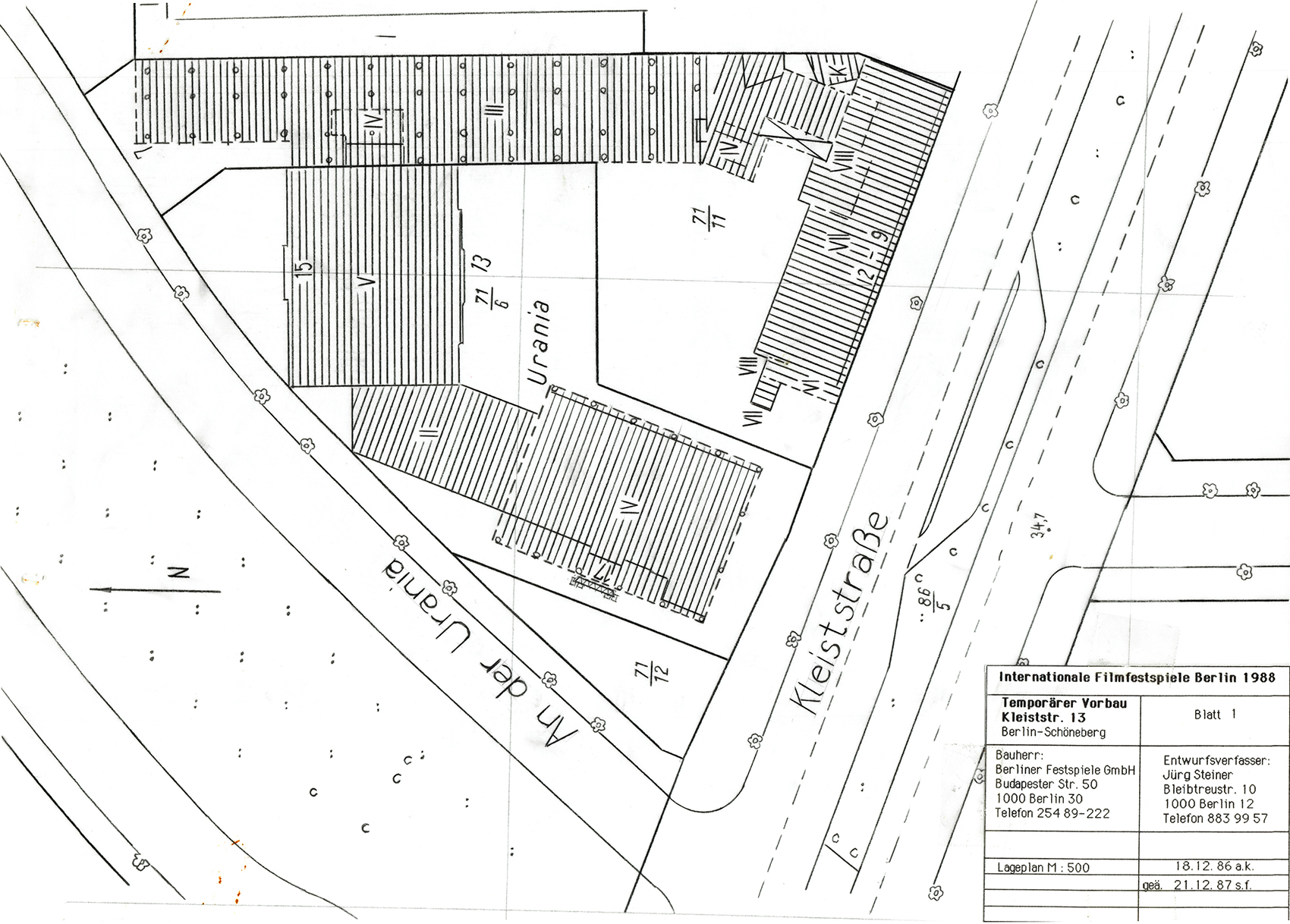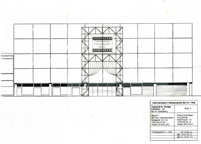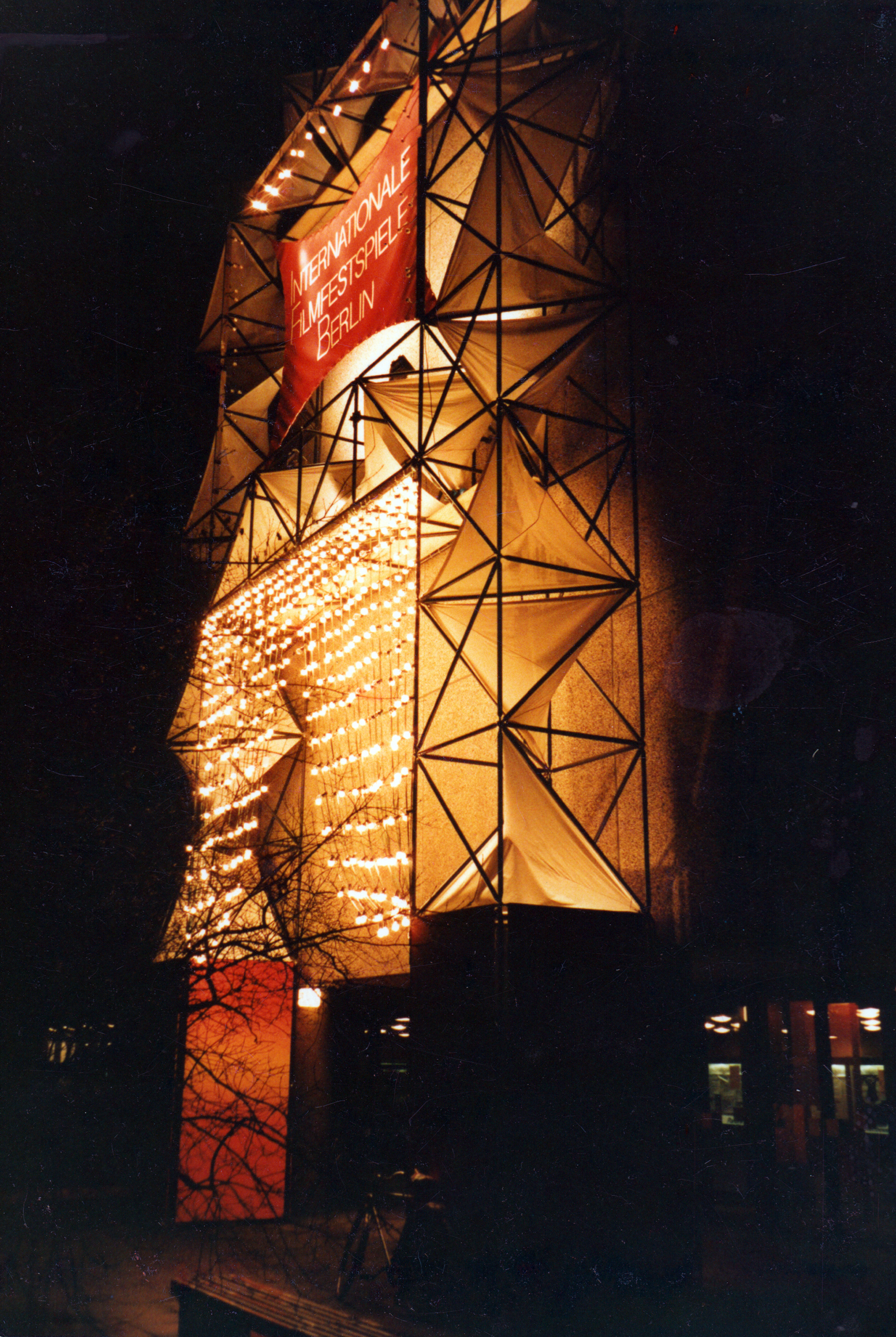 Die Internationalen Filmfestspiele nutzten auch in diesem Jahr die Volksbildungsstätte Urania als Wiederaufführungsort. Das schmucklose Gebäude ist über der Sockelzone mit grossflächigen Waschbetonplatten undurchdringlich verkleidet. Zur Erzeugung von Festlichkeit entwarf Jürg Steiner ein gebäudehohes Gerüst mit zwei Ständern auf quadratischem Grundriss und zwei horizontalen Verbindern im oberen Bereich. In das so entstandene Rechteck wurde straff ein Transparent gespannt. Die Stützen und Balken konnten mit diagonal verspannten Segeln massiver gemacht werden. Licht von oben und aus den Sockeln rundete den Bau wirkungsvoll ab.