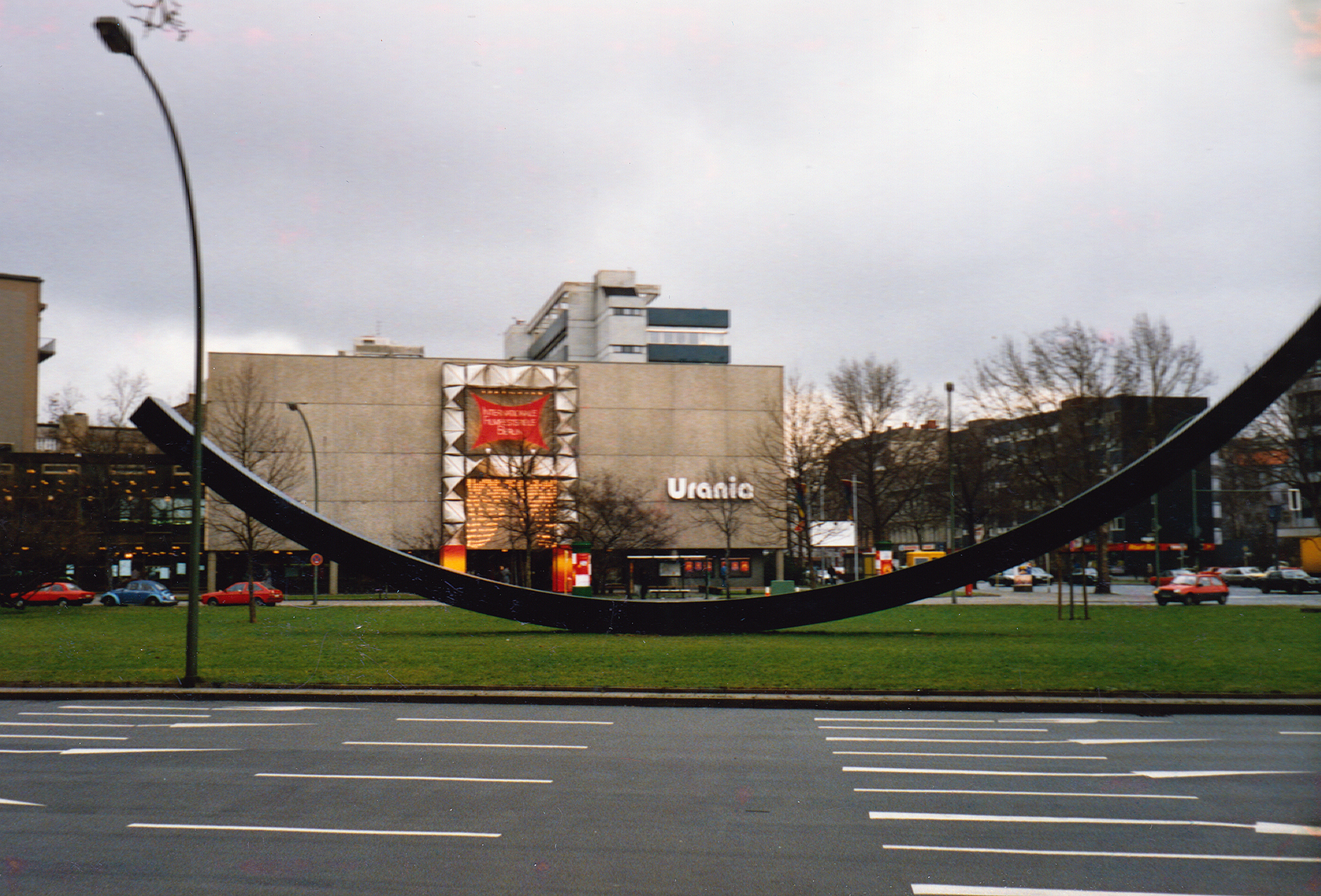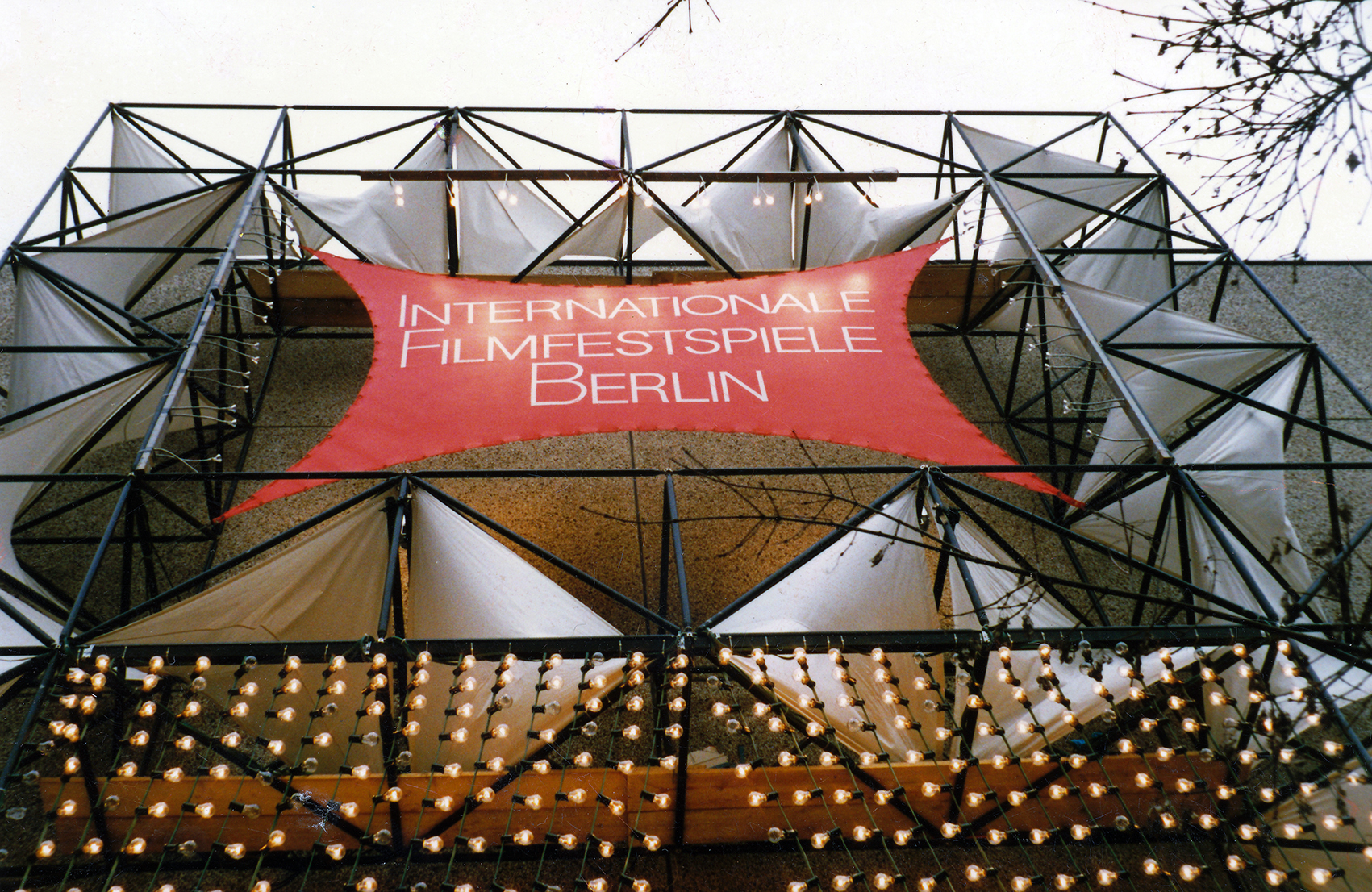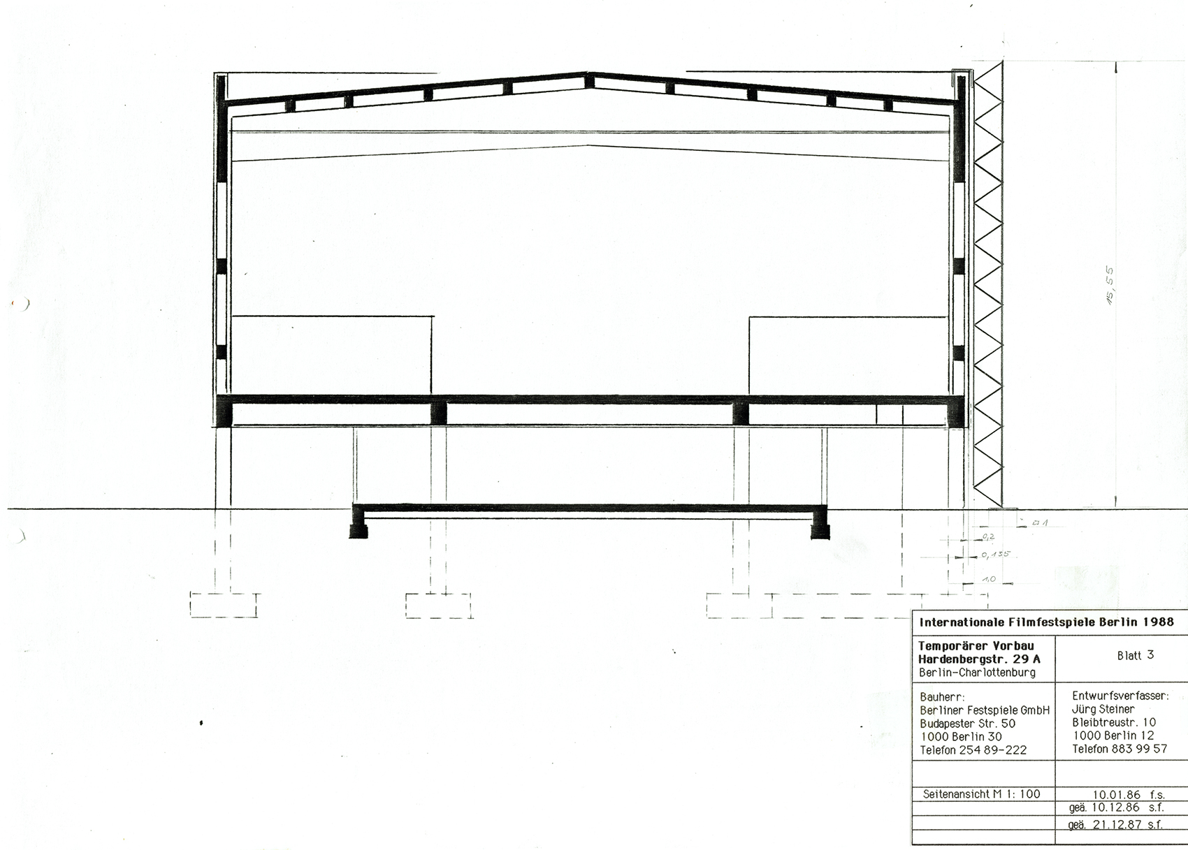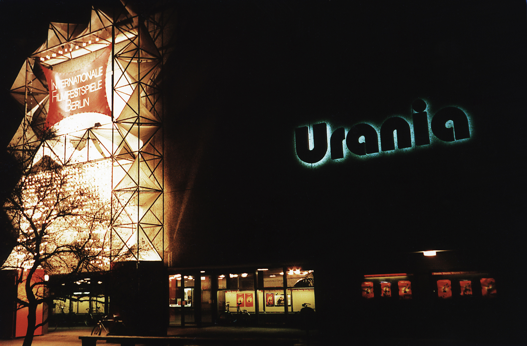 Die Internationalen Filmfestspiele nutzten auch in diesem Jahr die Volksbildungsstätte Urania als Wiederaufführungsort. Das schmucklose Gebäude ist über der Sockelzone mit grossflächigen Waschbetonplatten undurchdringlich verkleidet. Zur Erzeugung von Festlichkeit entwarf Jürg Steiner ein gebäudehohes Gerüst mit zwei Ständern auf quadratischem Grundriss und zwei horizontalen Verbindern im oberen Bereich. In das so entstandene Rechteck wurde straff ein Transparent gespannt. Die Stützen und Balken konnten mit diagonal verspannten Segeln massiver gemacht werden. Licht von oben und aus den Sockeln rundete den Bau wirkungsvoll ab.
