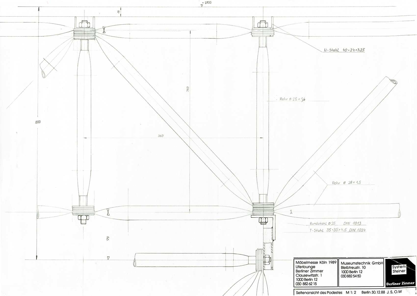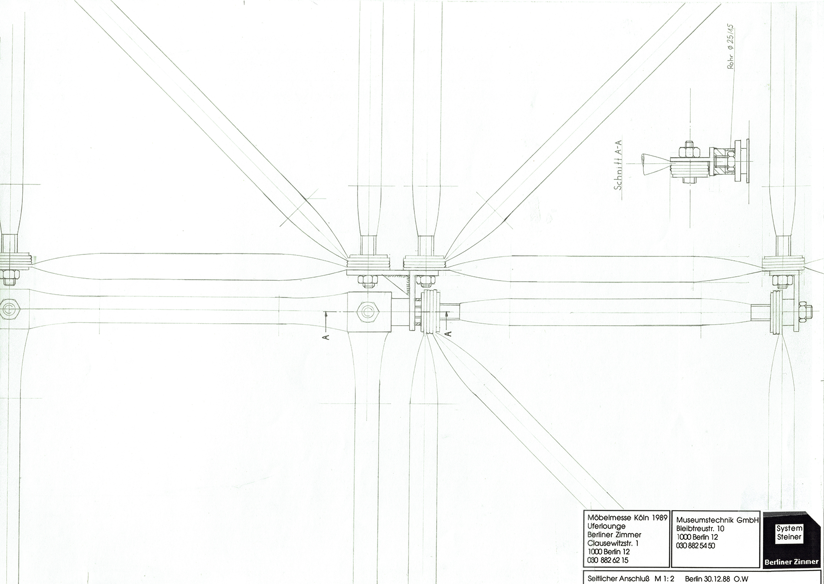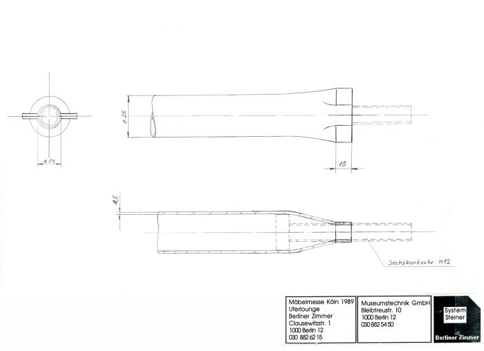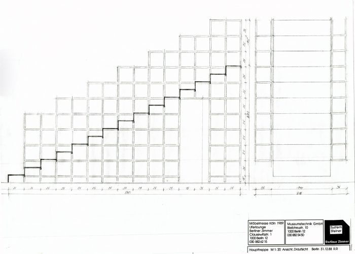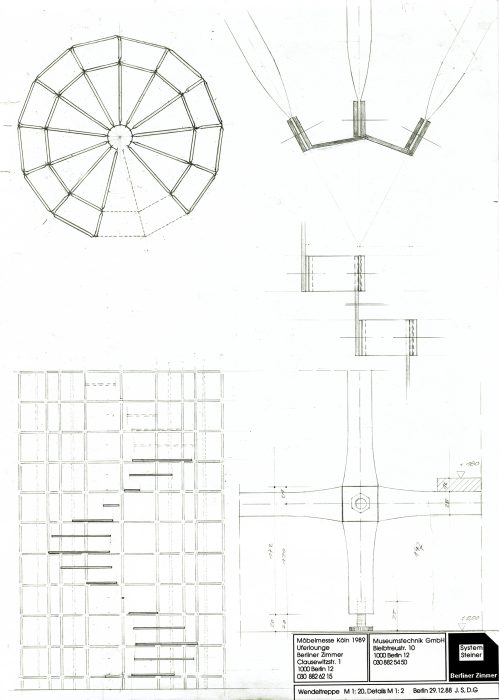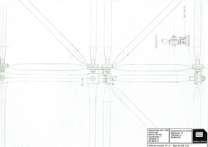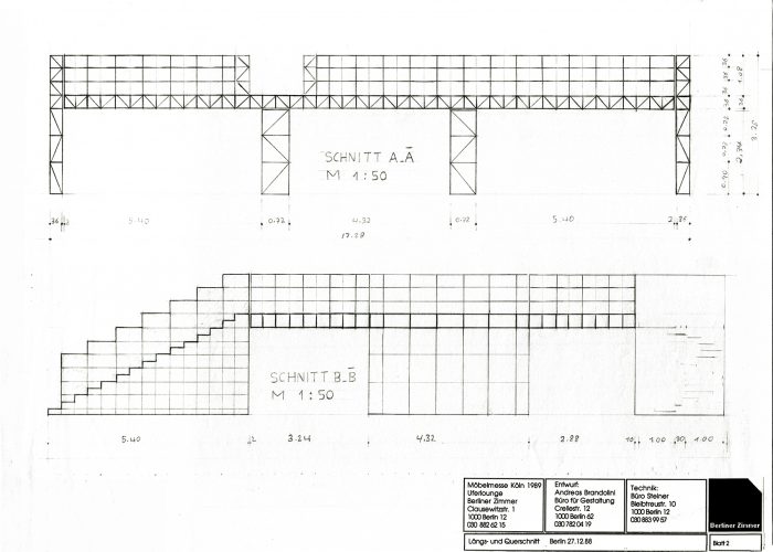 Andreas Brandolini entwarf den Gemeinschaftsstand der Berliner Zimmer Design Agentur aus System 180®. Wir realisierten den Entwurf. Für das System wurde der Schraubenstab entwickelt, der Vorfahre des noch heute üblichen Mutternstabs. Dieser Pfosten verfügte bei dem Messestand an jedem Ende über eine herausstehende Schraube M 12. Er war bei der zweiten Ebene senkrecht und bei den Unterstützungsgestellen waagrecht angeordnet. Dadurch konnten viele Stahlfachwerke über Kreuz zu einem Trägerrost verbunden werden. Die obere Ausstellungsebene wurde seitlich durch Regale begrenzt. Eine gerade und eine gewendelte Treppe führten auf die zweite Ebene.