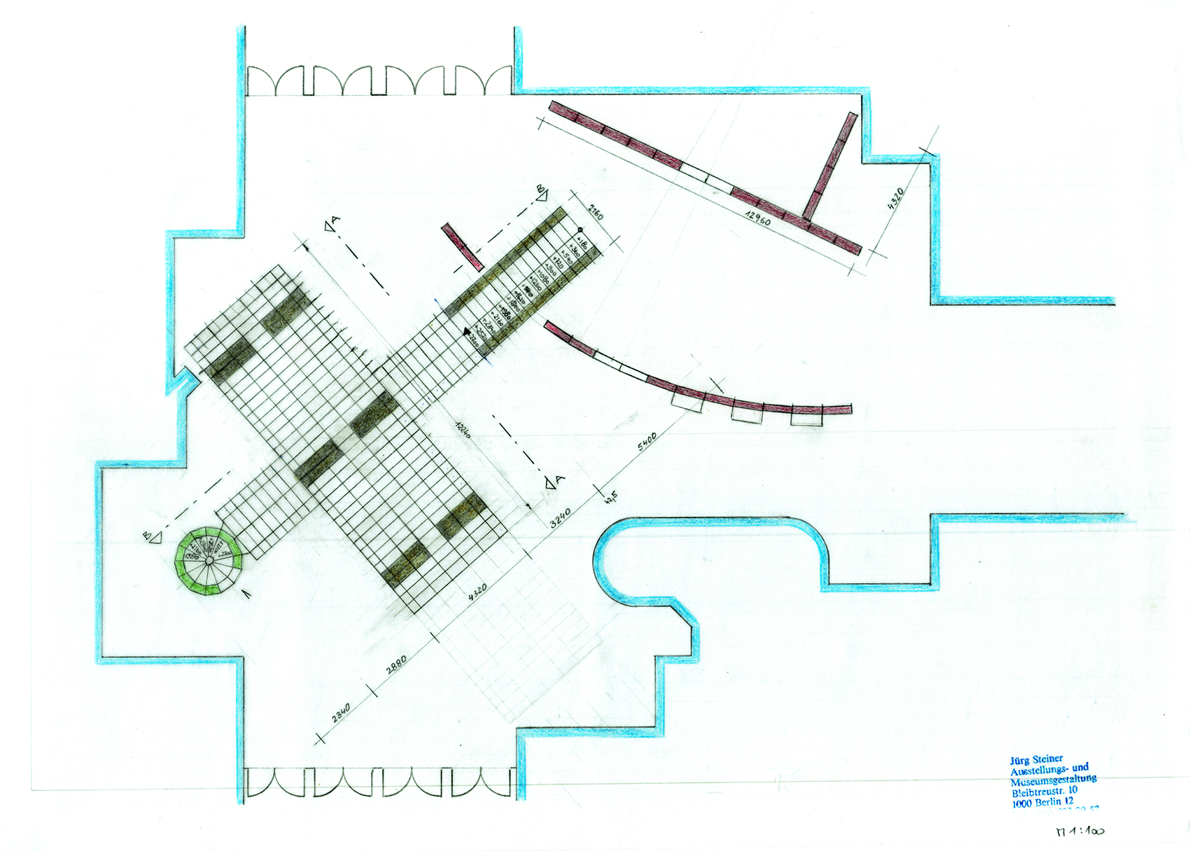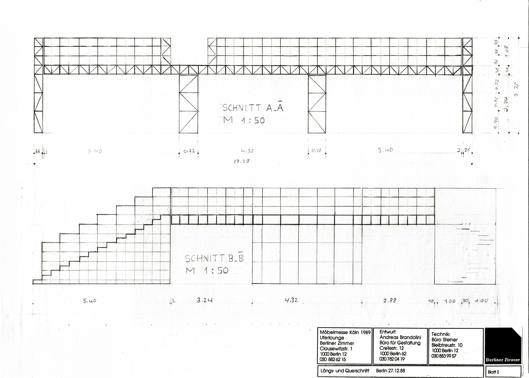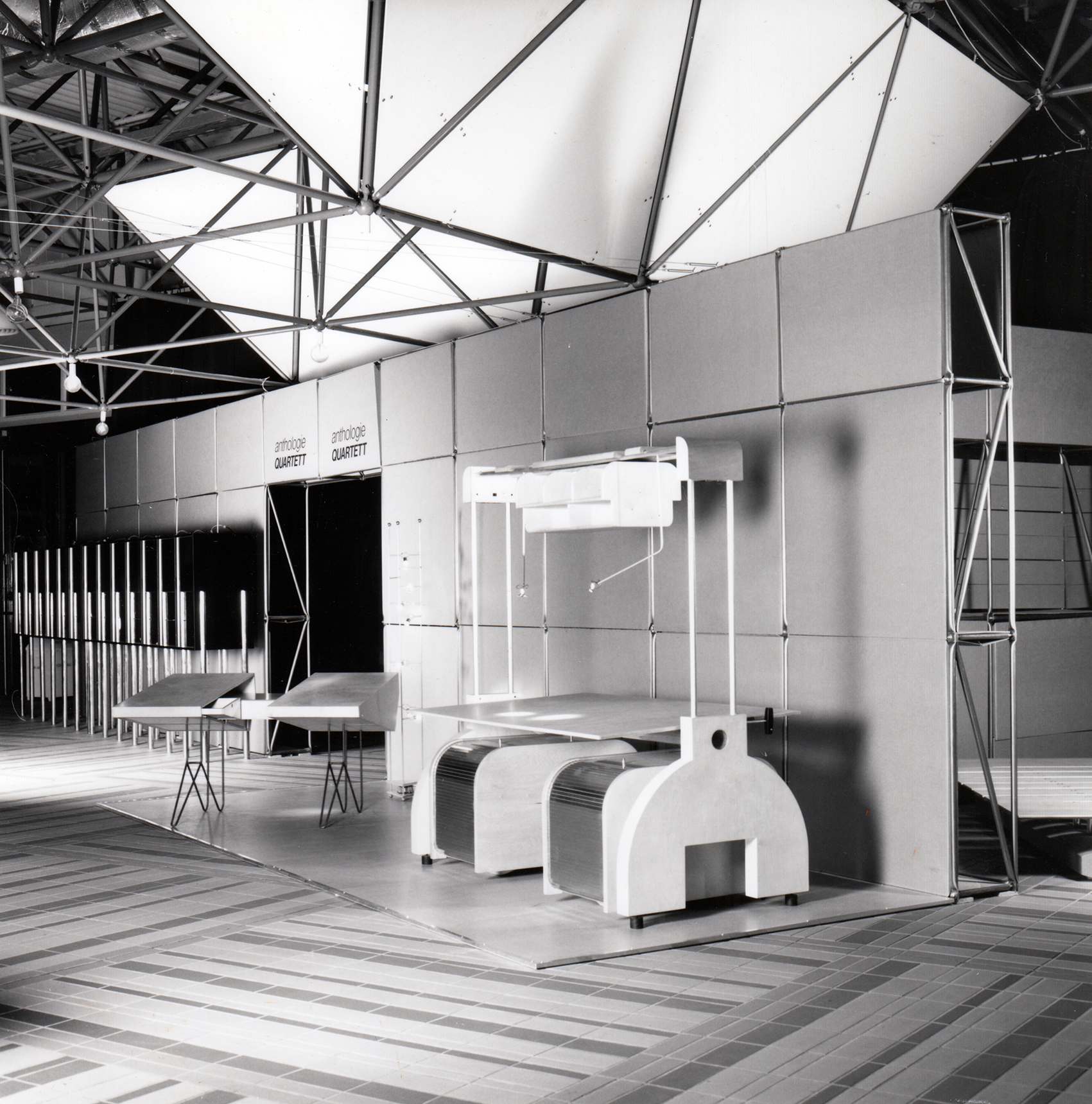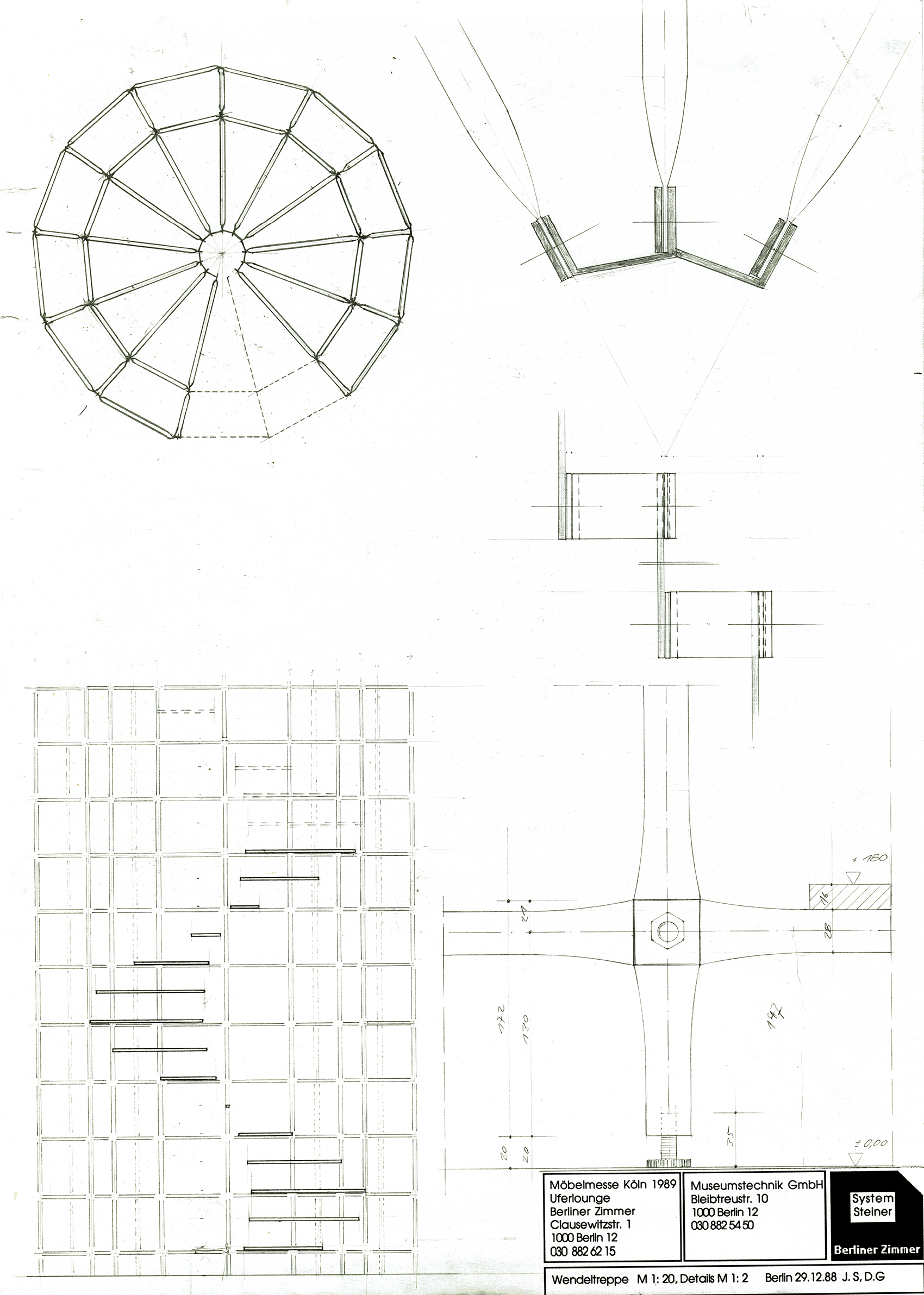 Andreas Brandolini entwarf den Gemeinschaftsstand der Berliner Zimmer Design Agentur aus System 180®. Wir realisierten den Entwurf. Für das System wurde der Schraubenstab entwickelt, der Vorfahre des noch heute üblichen Mutternstabs. Dieser Pfosten verfügte bei dem Messestand an jedem Ende über eine herausstehende Schraube M 12. Er war bei der zweiten Ebene senkrecht und bei den Unterstützungsgestellen waagrecht angeordnet. Dadurch konnten viele Stahlfachwerke über Kreuz zu einem Trägerrost verbunden werden. Die obere Ausstellungsebene wurde seitlich durch Regale begrenzt. Eine gerade und eine gewendelte Treppe führten auf die zweite Ebene.