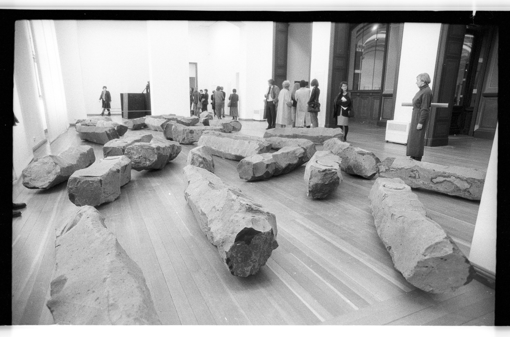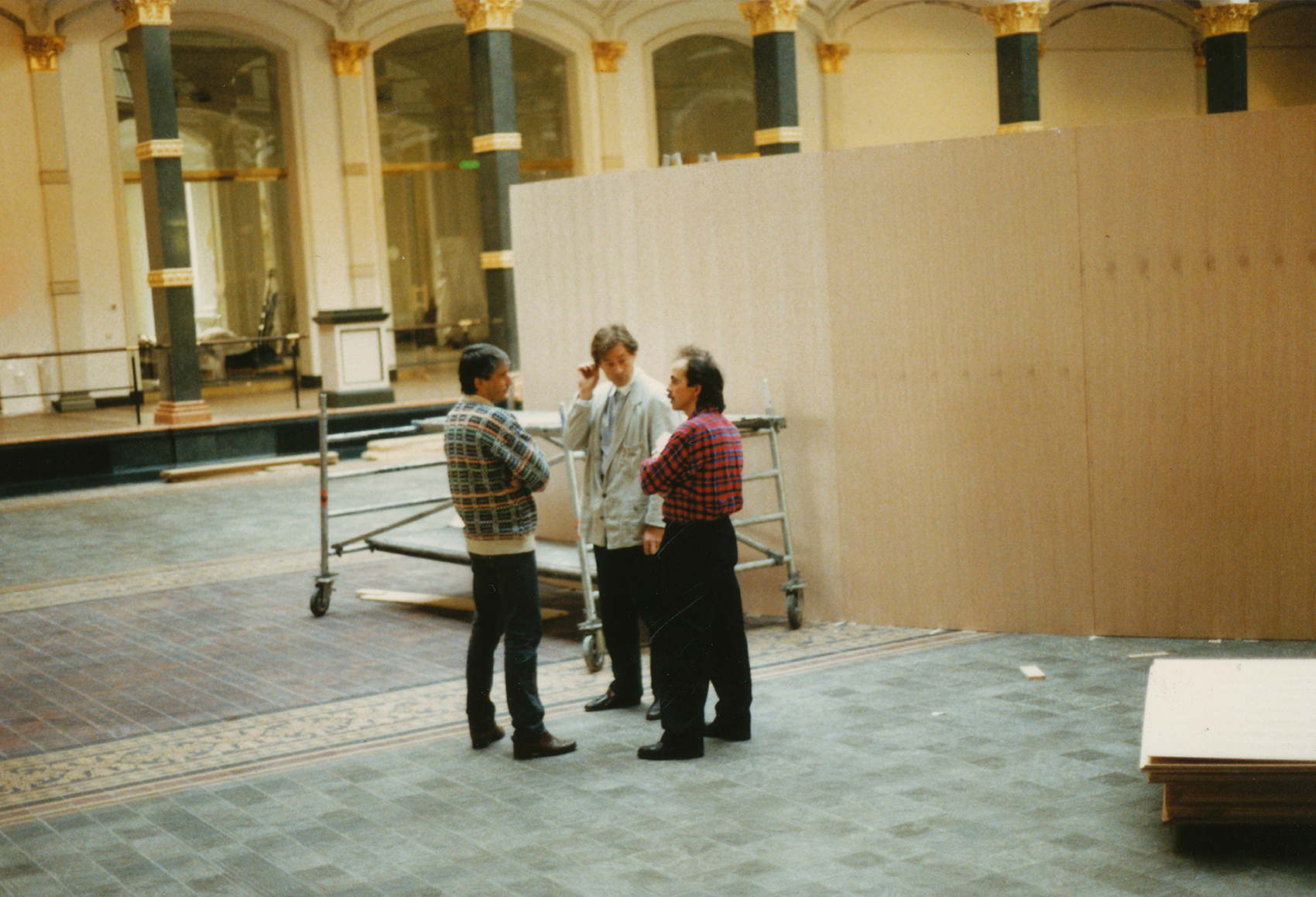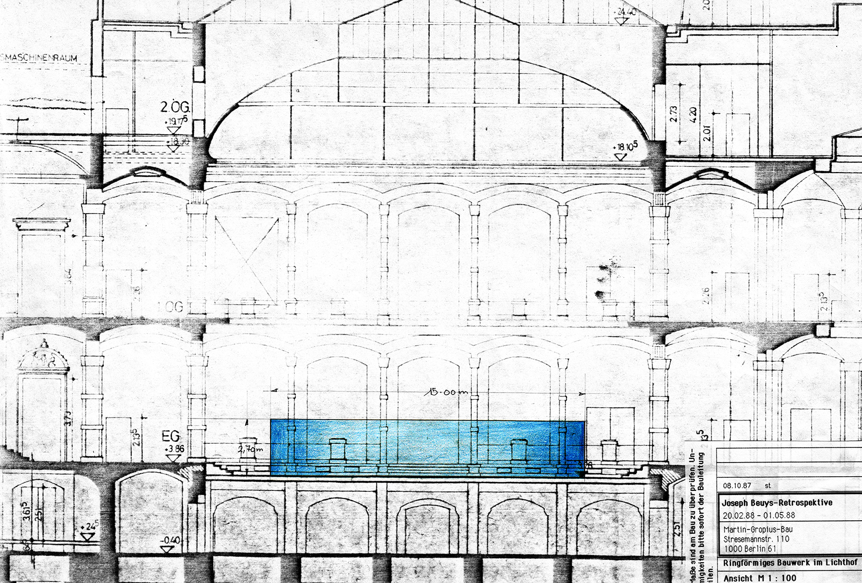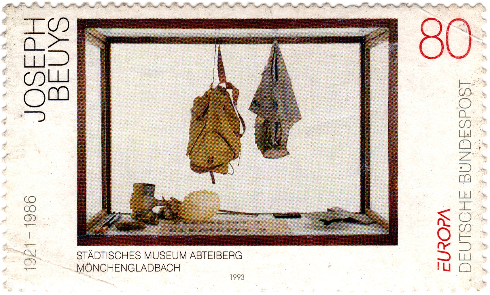 Die großen Galerien des Haues waren ideal für Beuys’ raumgreifende Installationen, von denen auf dem ersten Bild ein Ausschnitt des Werks »Zeige deine Wunden« abgebildet ist. Dezente Absperrungen hinderten das Publikum, das Raumbild zu betreten. Fahles Licht, das der Künstler schon bei der Zeitgeist-Ausstellung 1982 im Lichthof verlangte, erzeugten wir hier exemplarisch: Schatten waren nur angedeutet, eine gleichmäßige Lichtquelle von oben betonte die Künstlichkeit der Szenerie. An die Innenwand des Rings im Lichthof waren Rahmen mit der Serie »A Secret Block of a Secret Person in Ireland« gelehnt (Bilder 2–5), auf dem Umgang im Obergeschoss hingen weitere Arbeiten dieses Zyklus (Bild 6). Das zweitletzte Bild zeigt die Installation »Plight«, für die ein Raum der Londoner Galerie Anthony D’Offay nachgebaut wurde. Die Briefmarke zu 80 Pfennig trugen wir lange bei uns, um, wenn angezeigt, zeigen zu können, was Beuys für eine vorbildliche Vitrinengestaltung hielt.