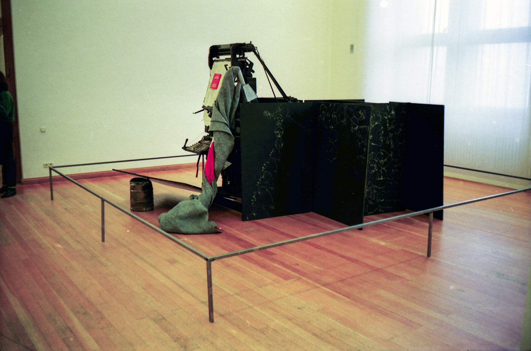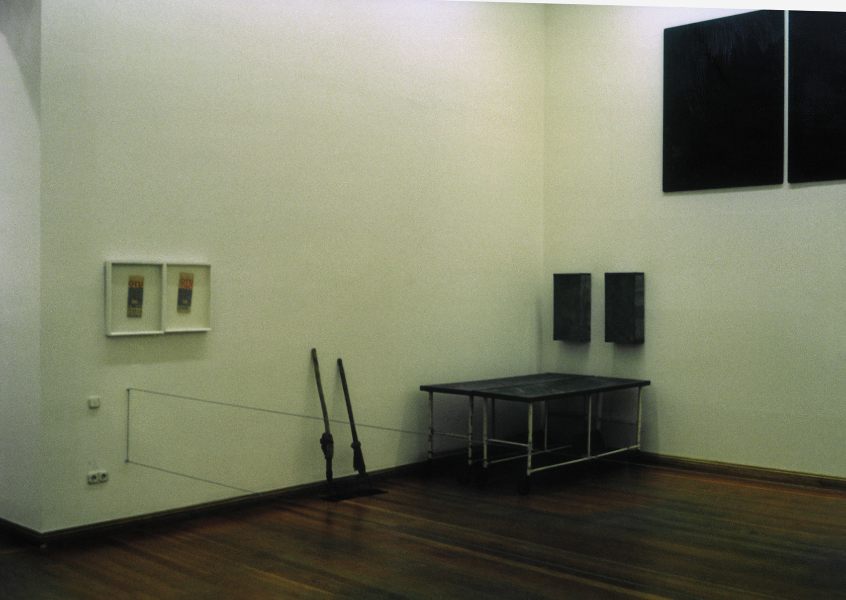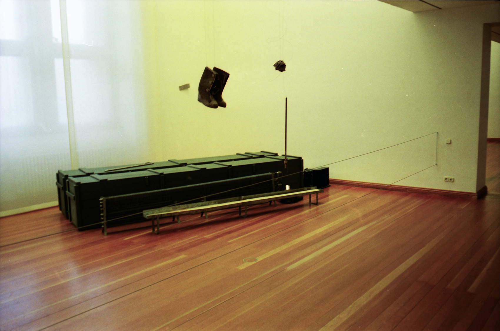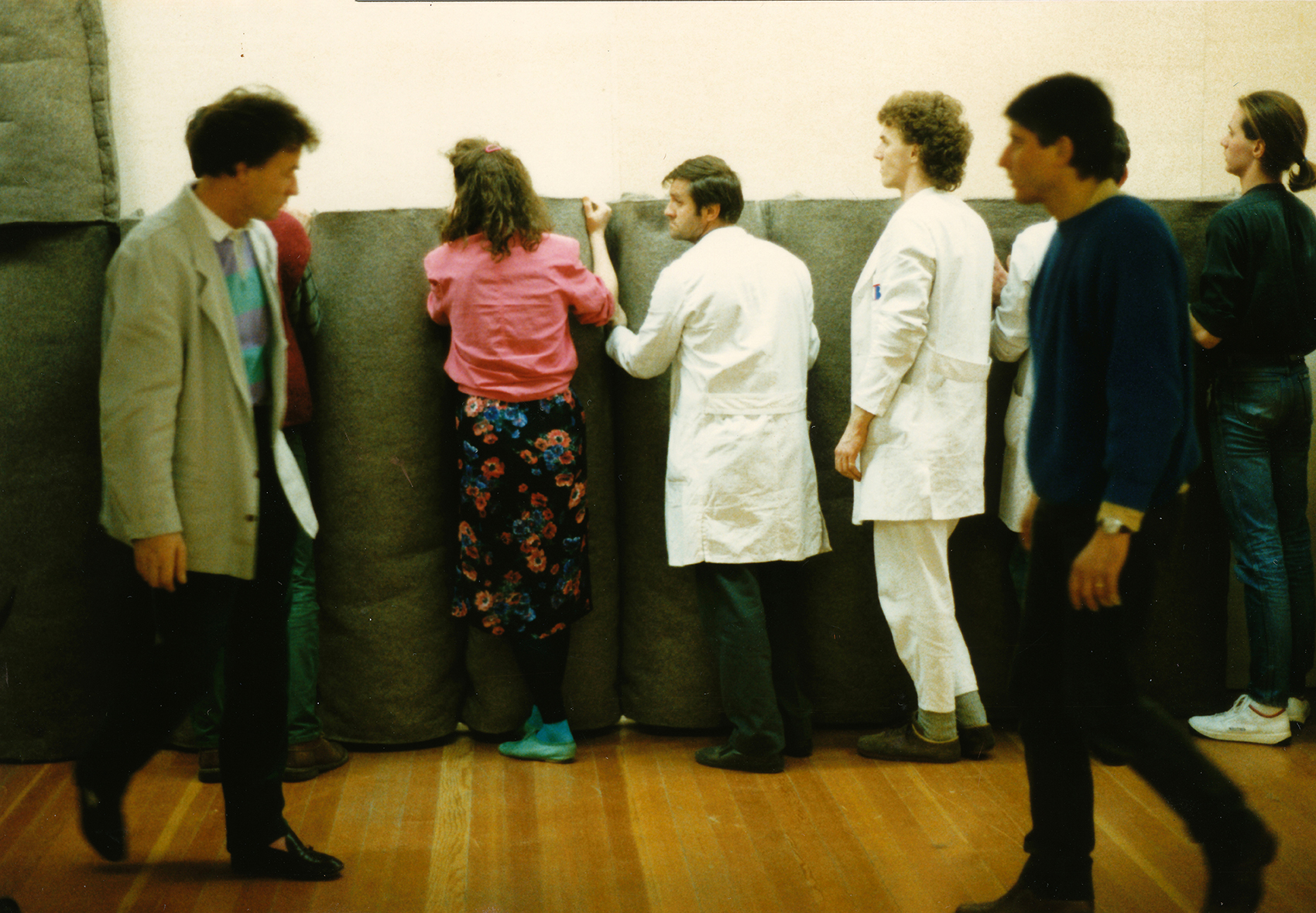 Die großen Galerien des Haues waren ideal für Beuys’ raumgreifende Installationen, von denen auf dem ersten Bild ein Ausschnitt des Werks »Zeige deine Wunden« abgebildet ist. Dezente Absperrungen hinderten das Publikum, das Raumbild zu betreten. Fahles Licht, das der Künstler schon bei der Zeitgeist-Ausstellung 1982 im Lichthof verlangte, erzeugten wir hier exemplarisch: Schatten waren nur angedeutet, eine gleichmäßige Lichtquelle von oben betonte die Künstlichkeit der Szenerie. An die Innenwand des Rings im Lichthof waren Rahmen mit der Serie »A Secret Block of a Secret Person in Ireland« gelehnt (Bilder 2–5), auf dem Umgang im Obergeschoss hingen weitere Arbeiten dieses Zyklus (Bild 6). Das zweitletzte Bild zeigt die Installation »Plight«, für die ein Raum der Londoner Galerie Anthony D’Offay nachgebaut wurde. Die Briefmarke zu 80 Pfennig trugen wir lange bei uns, um, wenn angezeigt, zeigen zu können, was Beuys für eine vorbildliche Vitrinengestaltung hielt.