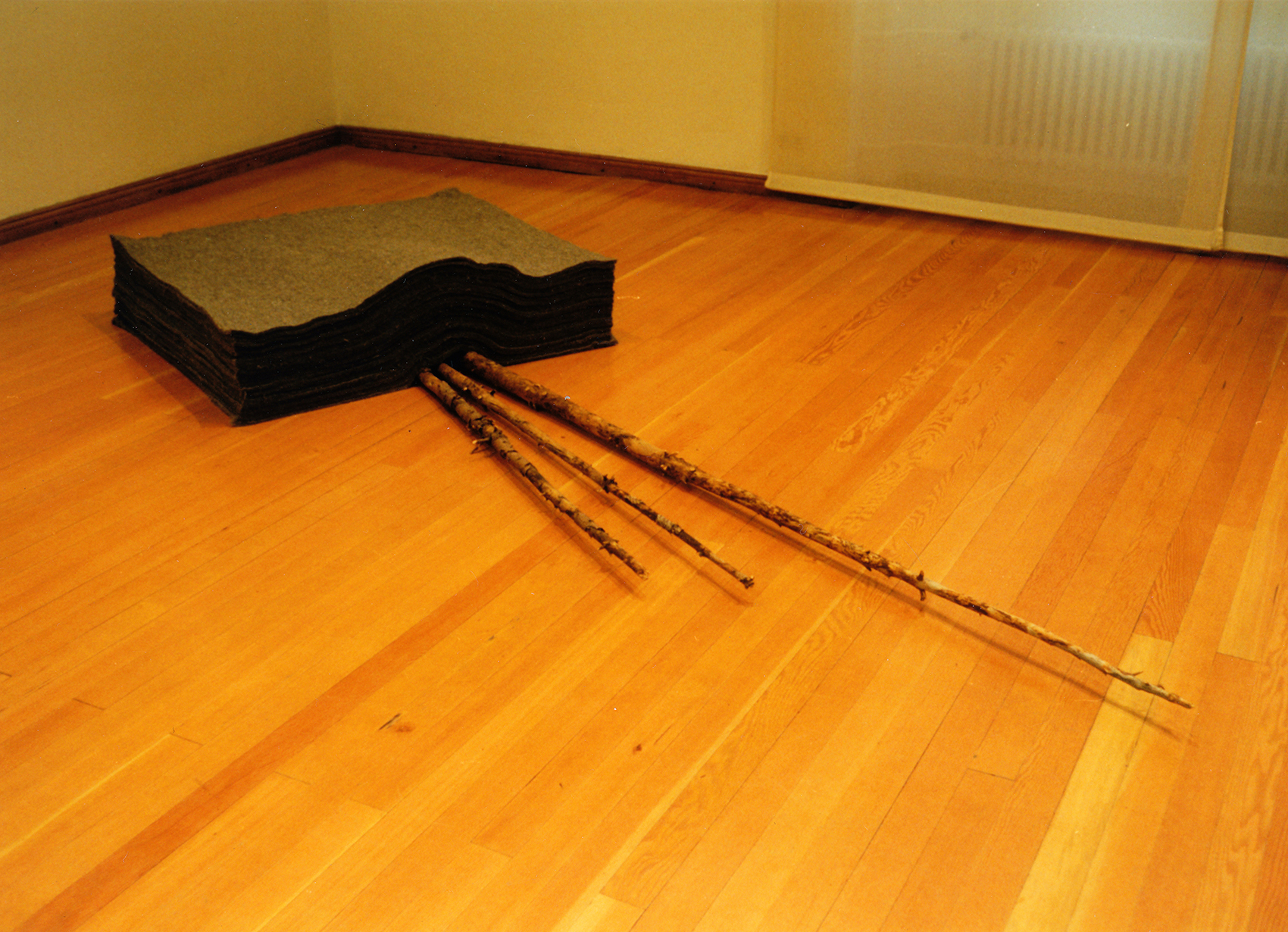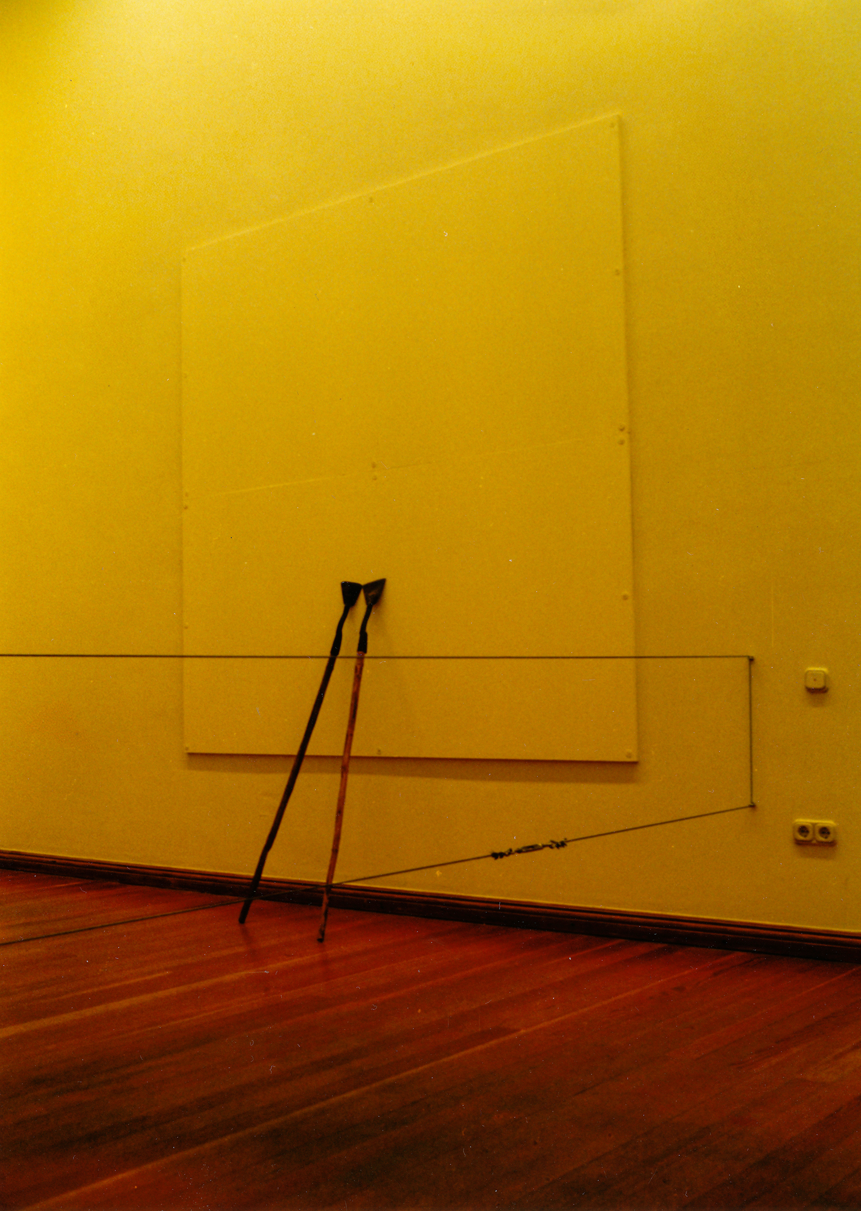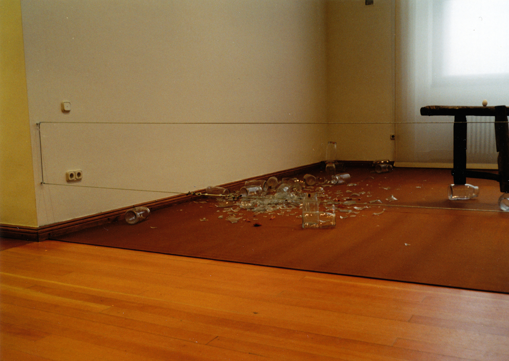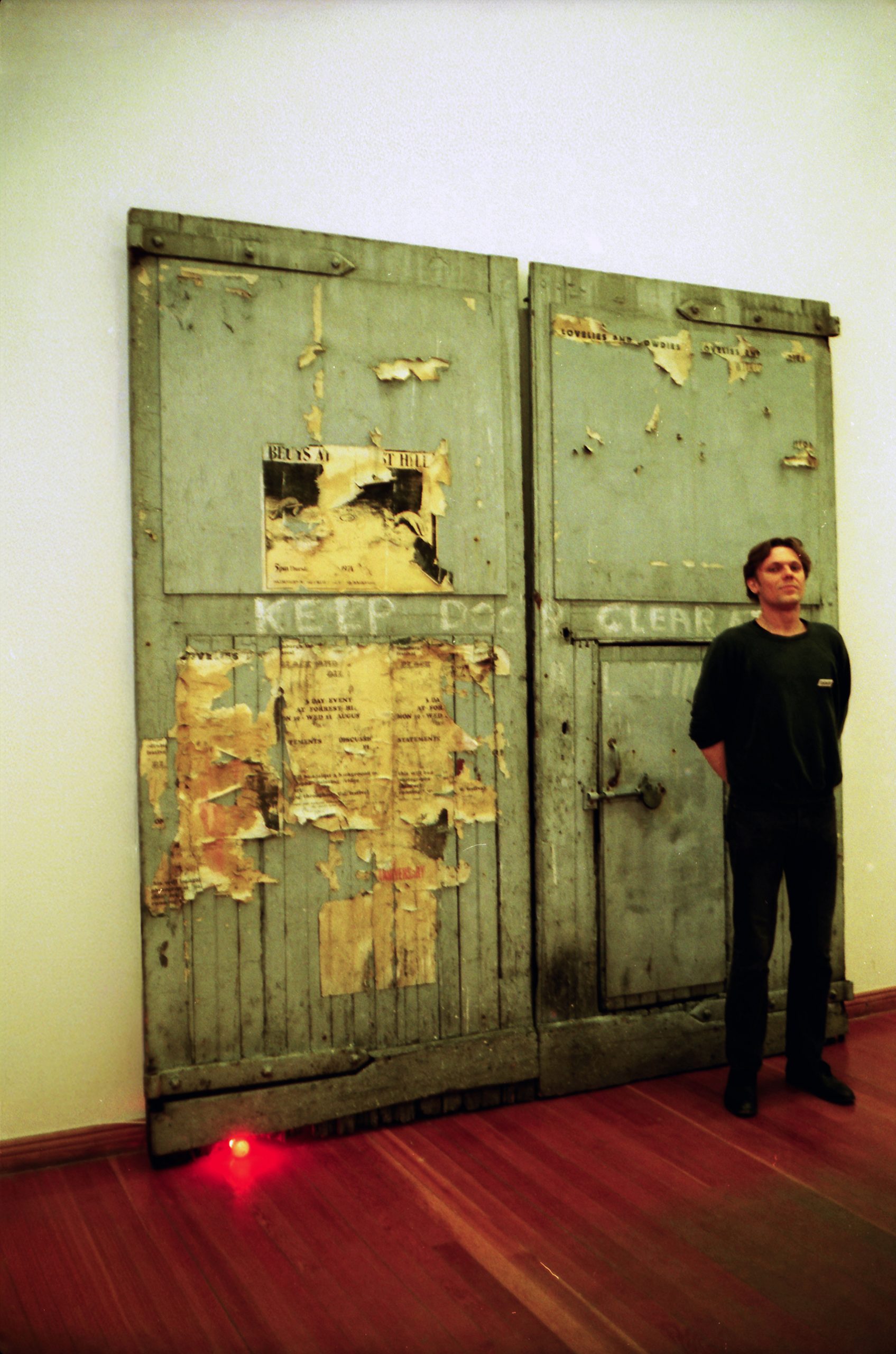 Die großen Galerien des Haues waren ideal für Beuys’ raumgreifende Installationen, von denen auf dem ersten Bild ein Ausschnitt des Werks »Zeige deine Wunden« abgebildet ist. Dezente Absperrungen hinderten das Publikum, das Raumbild zu betreten. Fahles Licht, das der Künstler schon bei der Zeitgeist-Ausstellung 1982 im Lichthof verlangte, erzeugten wir hier exemplarisch: Schatten waren nur angedeutet, eine gleichmäßige Lichtquelle von oben betonte die Künstlichkeit der Szenerie. An die Innenwand des Rings im Lichthof waren Rahmen mit der Serie »A Secret Block of a Secret Person in Ireland« gelehnt (Bilder 2–5), auf dem Umgang im Obergeschoss hingen weitere Arbeiten dieses Zyklus (Bild 6). Das zweitletzte Bild zeigt die Installation »Plight«, für die ein Raum der Londoner Galerie Anthony D’Offay nachgebaut wurde. Die Briefmarke zu 80 Pfennig trugen wir lange bei uns, um, wenn angezeigt, zeigen zu können, was Beuys für eine vorbildliche Vitrinengestaltung hielt.