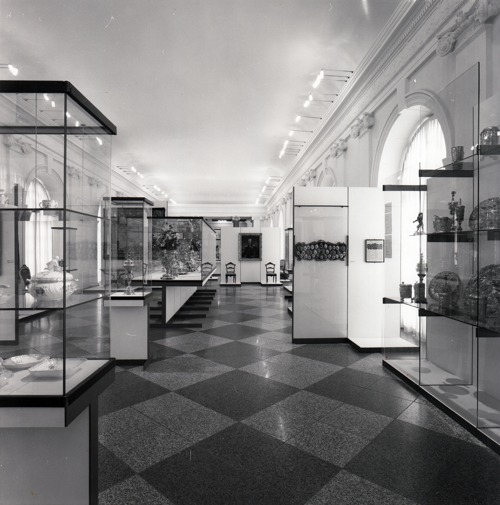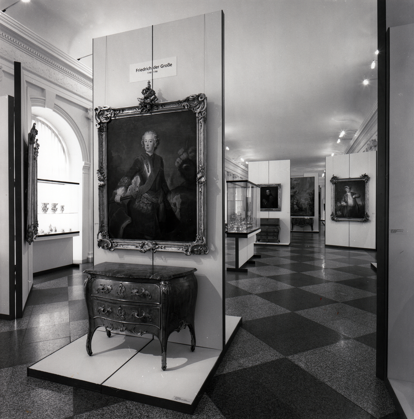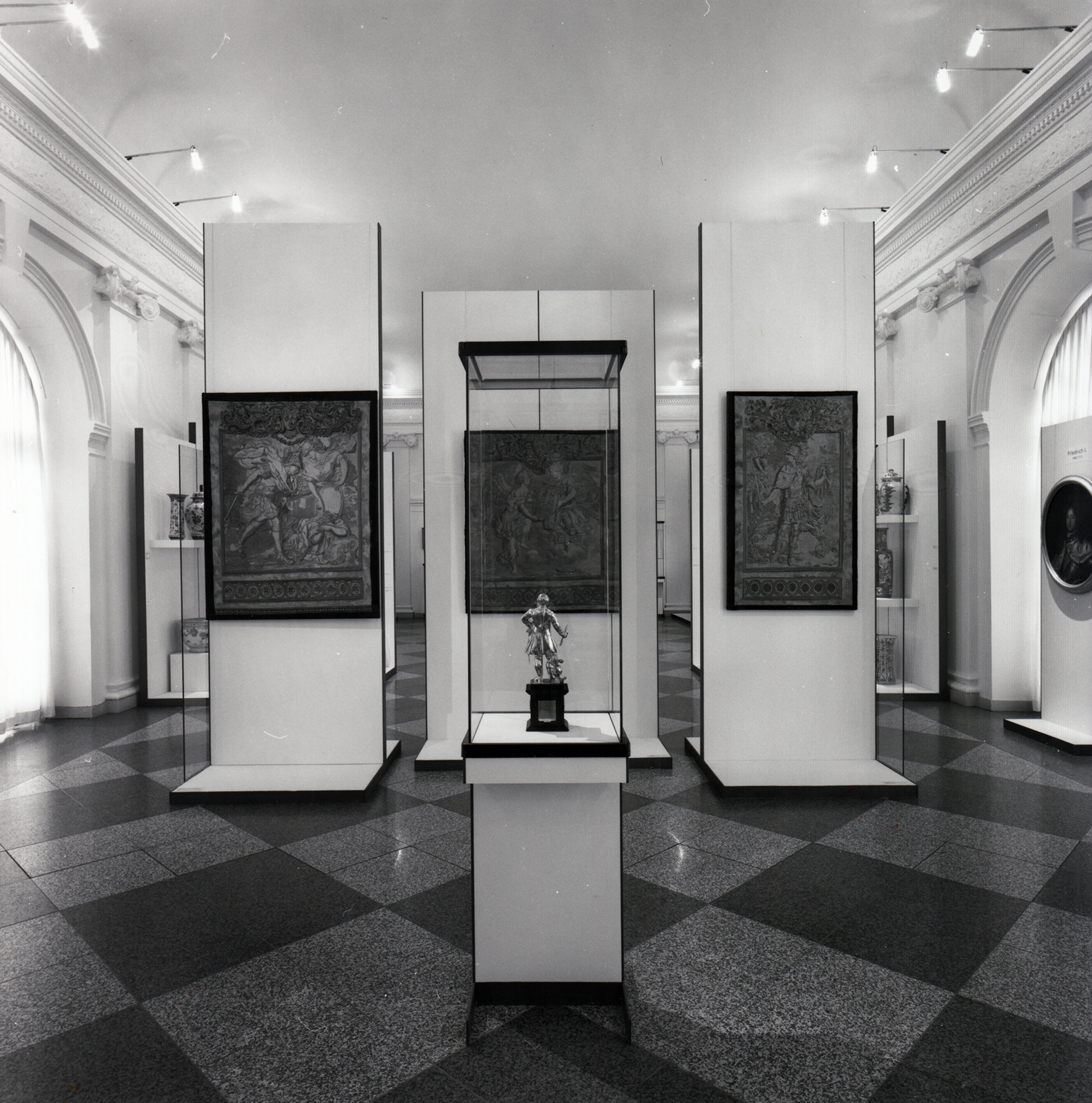 Auf ein modulares System aus Untergestellen aus H-förmigen Flachstahlrahmen und Holzplatten wurden Vitrinenmodule aufgebaut, deren senkrechte Gläser auf der einen Seite mit einem Scharnier und auf der anderen mit einem Schloss ausgestattet wurden. Darüber hinaus wurde ein neues Beleuchtungssystem aus Drehradleuchten mit Kragarm aus der Zitadelle Spandau adaptiert.