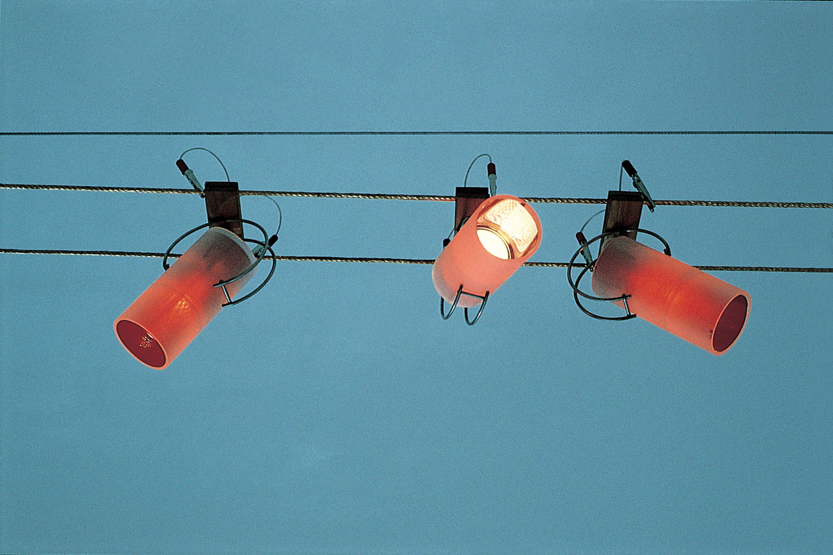 Um sie wirkungsvoll ins Licht zu setzen, entwickelten wir die Leuchtenfamilie »Venezia«, eine Variante innerhalb des Seilleitersystems. Besonderes Merkmal war hier die rote Einfärbung des Nebenlichts. Ein Hauch dieser Farbe ist an den aufragenden Teilen der Skulpturen zu erkennen. Grundsätzlich bewirkt rotes Licht eine angenehme Atmosphäre. Da die Kunstobjekte weiss angestrahlt wurden, wirkte der Effekt hier besonders unaufdringlich. Die letzten drei Abbildungen zeigen einen Vorentwurf in Form eines Zylinders auf einem Floß.