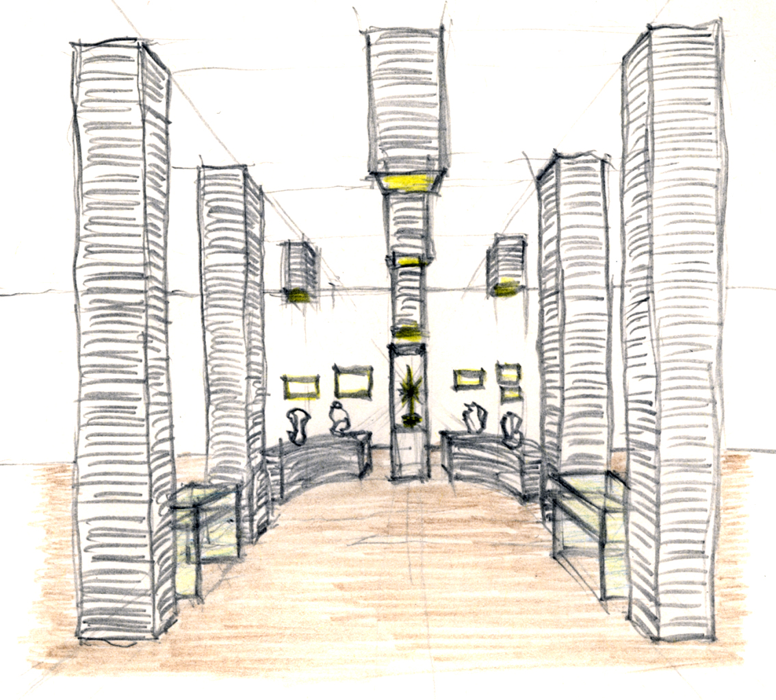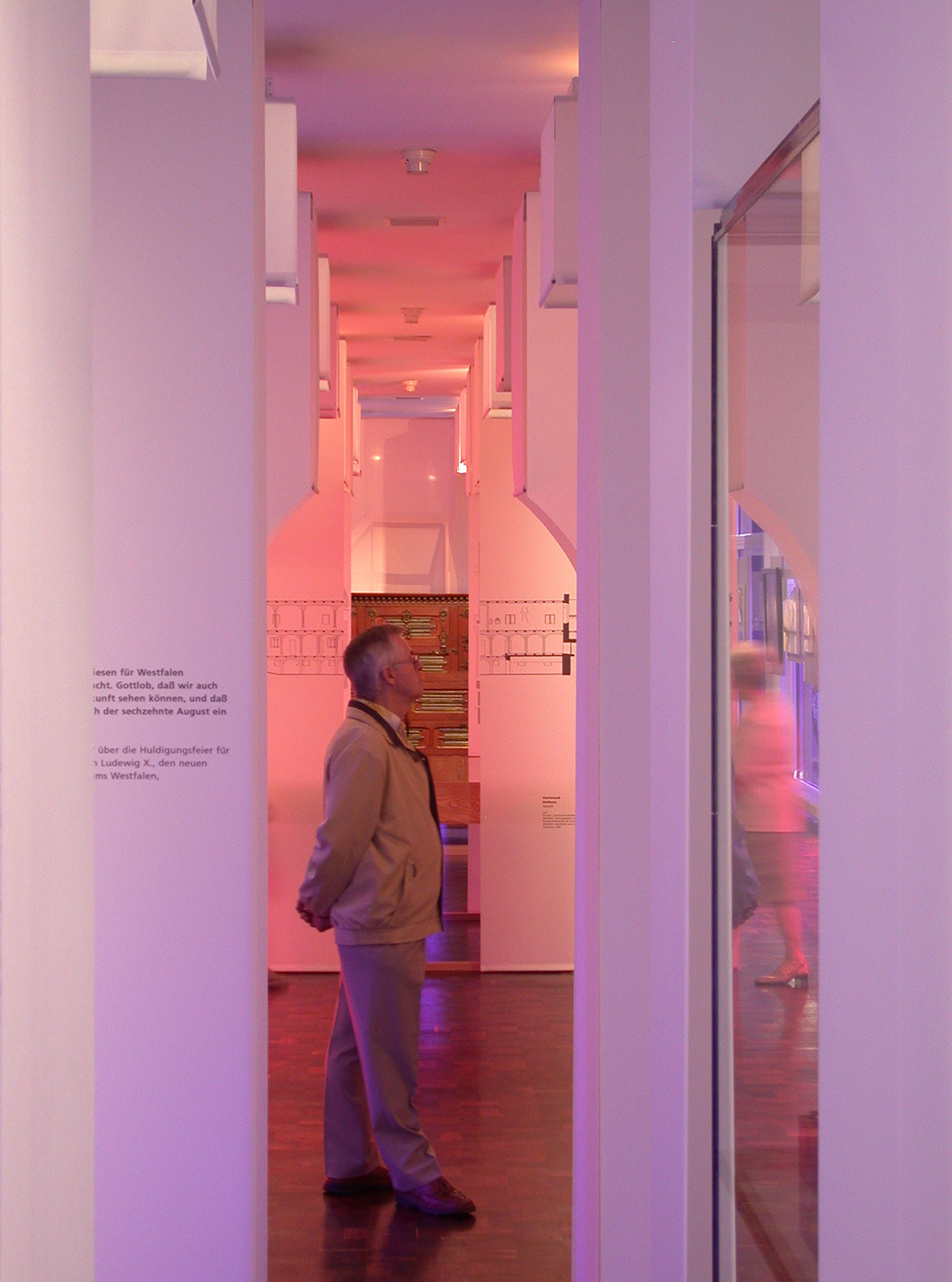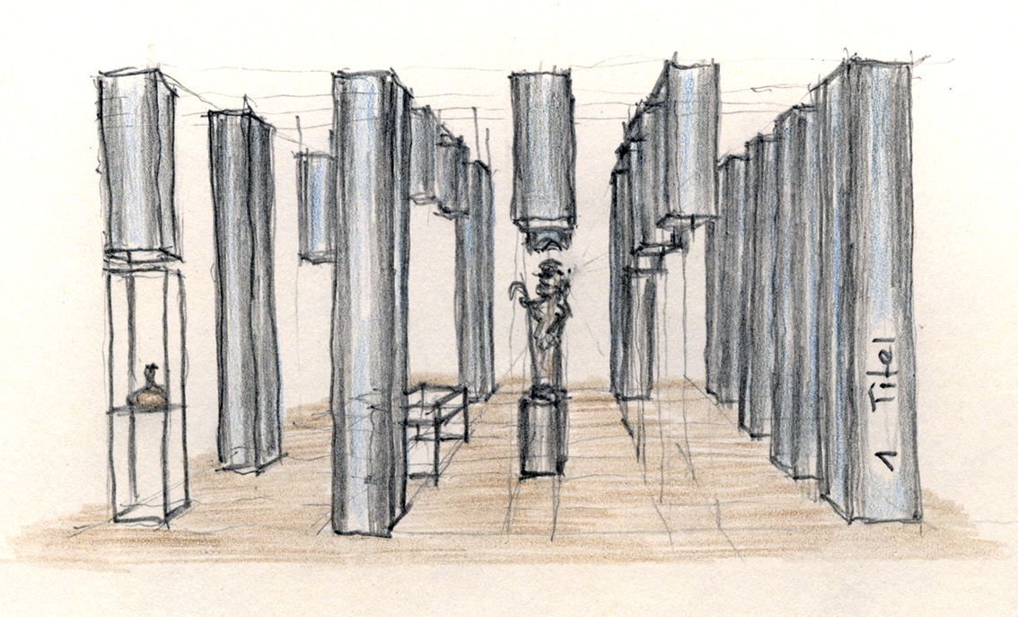 Für die Ausstellungspräsentation wurden die Räumlichkeiten an den bestehenden Beleuchtungskörpern (Lichtinseln) mit raumbildenden Stoffbahnelementen versehen. Durch ihre verschiedenen Längen gliedern sie die Ausstellung in thematische Abteilungen, die mit „Cronos“ im Zentrum einen Höhepunkt im kreuzgangartigen Lichthof findet.