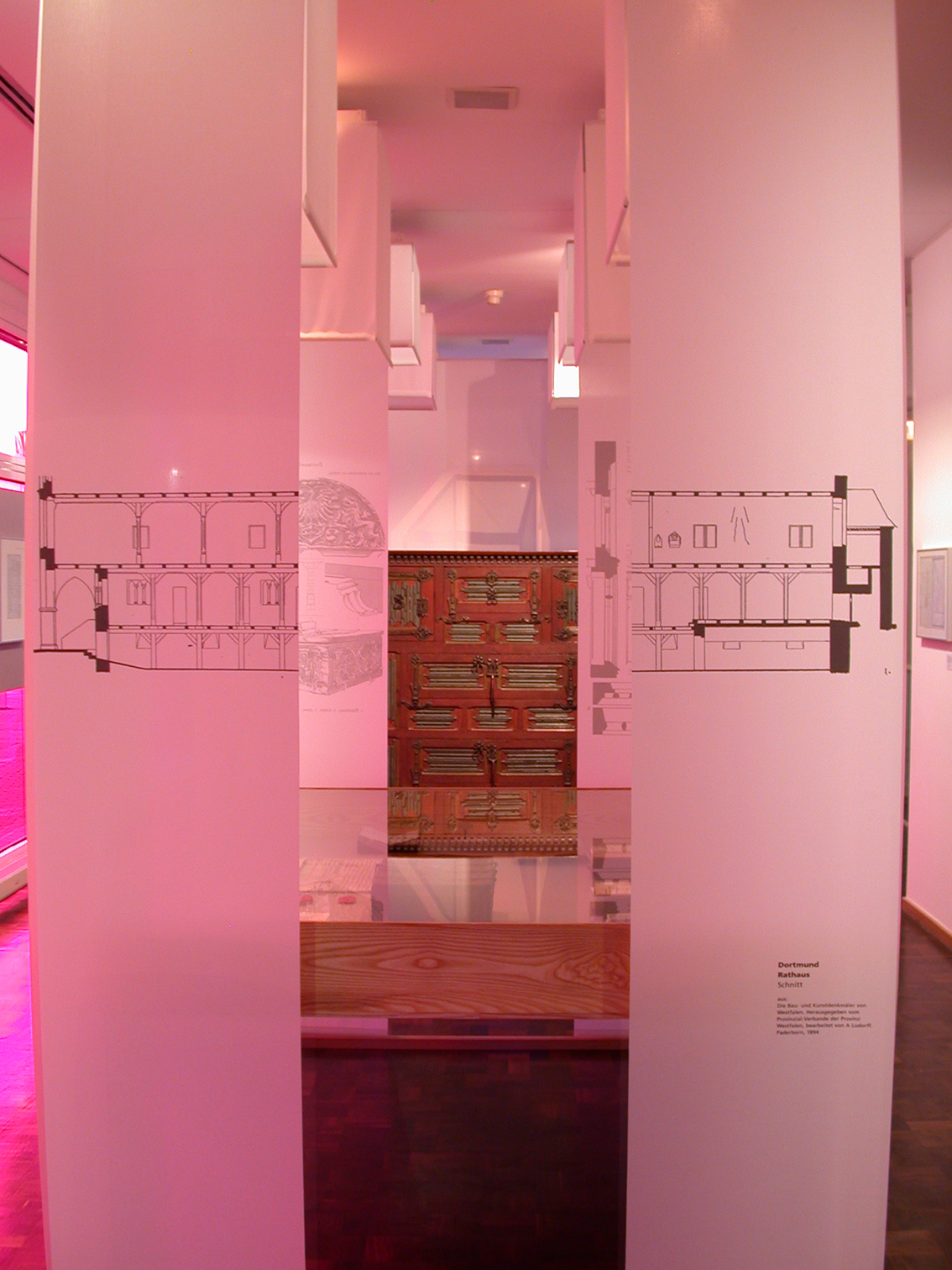 Außerdem dienen sie mit ihren aufgedruckten Texten und Grafiken der Erläuterung und Führung durch die Ausstellung. Dabei erinnern sie mit ihren leichten Bewegungen die beim vorbeigehen entstehen an die bewegten Zeiten der Säkularisierung. Unterstützt wird dies mit einem besonderen Farbspiel durch Folienbehang an den Tageslichtflächen. Erwähnenswert sind auch die speziell für bestimmte Objektpräsentationen gefertigten Klima- und Sondervitrinen. So ermöglicht die Ausstellung mit einer knapp 28 Meter langen Tischvitrine das Betrachten einer Schriftrolle in komplett ausgerolltem Zustand.
