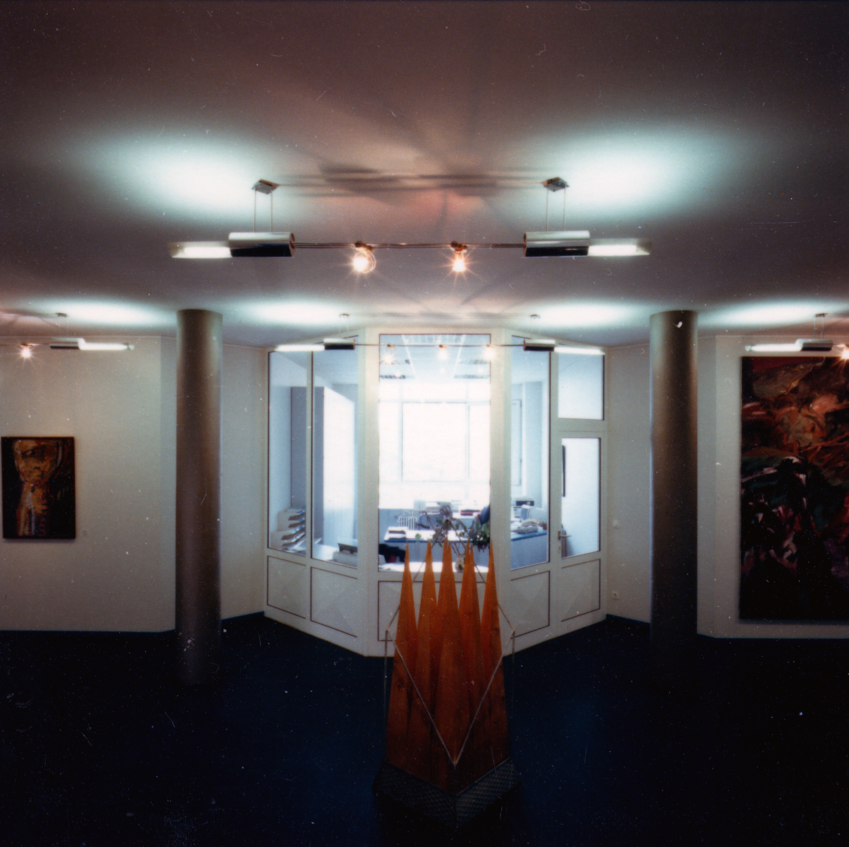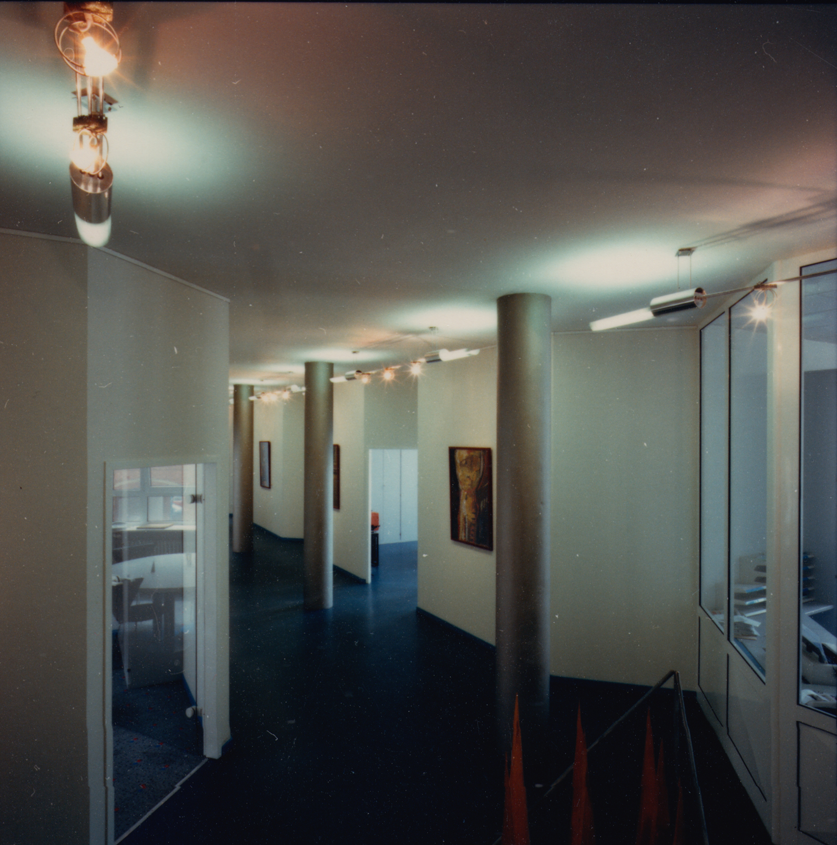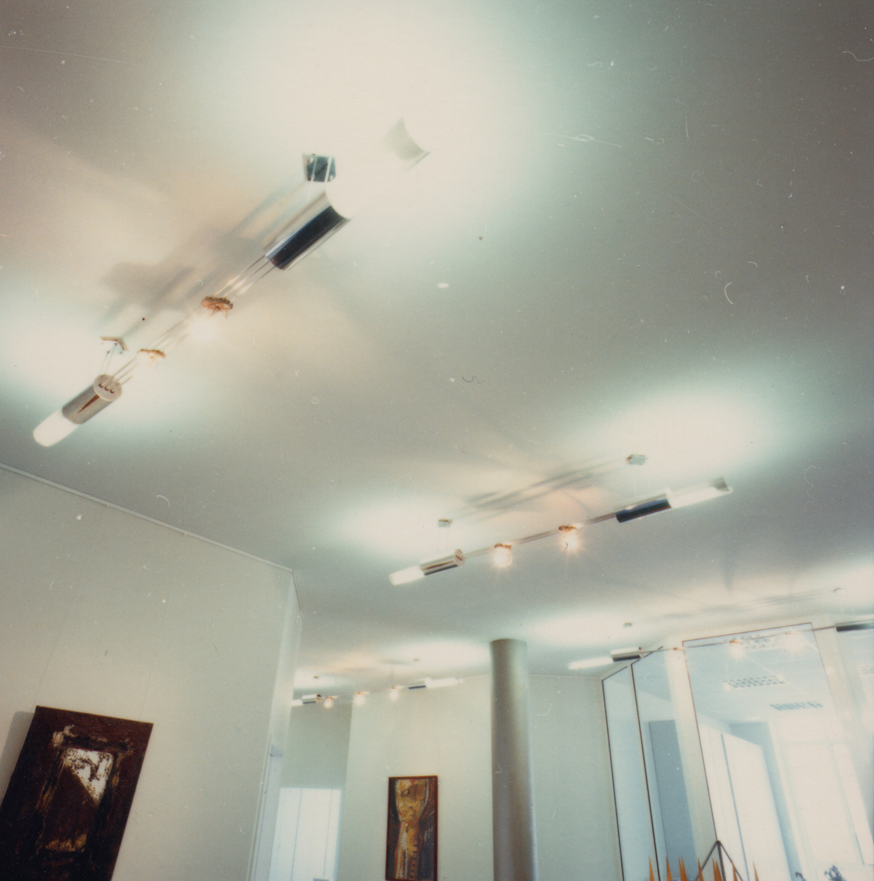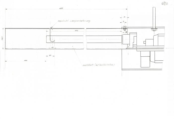 Der mehrfach gebaute Leuchtentyp passte ideal in die repräsentativen Geschäftsräume der Firma Krause. Die Grundelemente bestehen aus einseitig gesockelten Kompaktleuchtstofflampen, deren Licht sich dank des gebogenen Lochblechs unter der Lampe zur Hälfte über die Decke verteilt. Die Ganzaluminium-Leuchte hängt an vier Röhrchen, die zwei horizontale Zylinder halten, in die auf der einen Seite Trafos, auf der anderen Vorschaltgeräte installiert sind. Drei isoliert befestigte Röhrchen halten die Leuchte zusammen, zwei führen Niedervoltspannung für die Halogenlampen und in der dritten verläuft ein Kabel, das den hochvoltigen Strom vom einen Zylinder in den anderen führt.