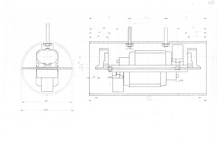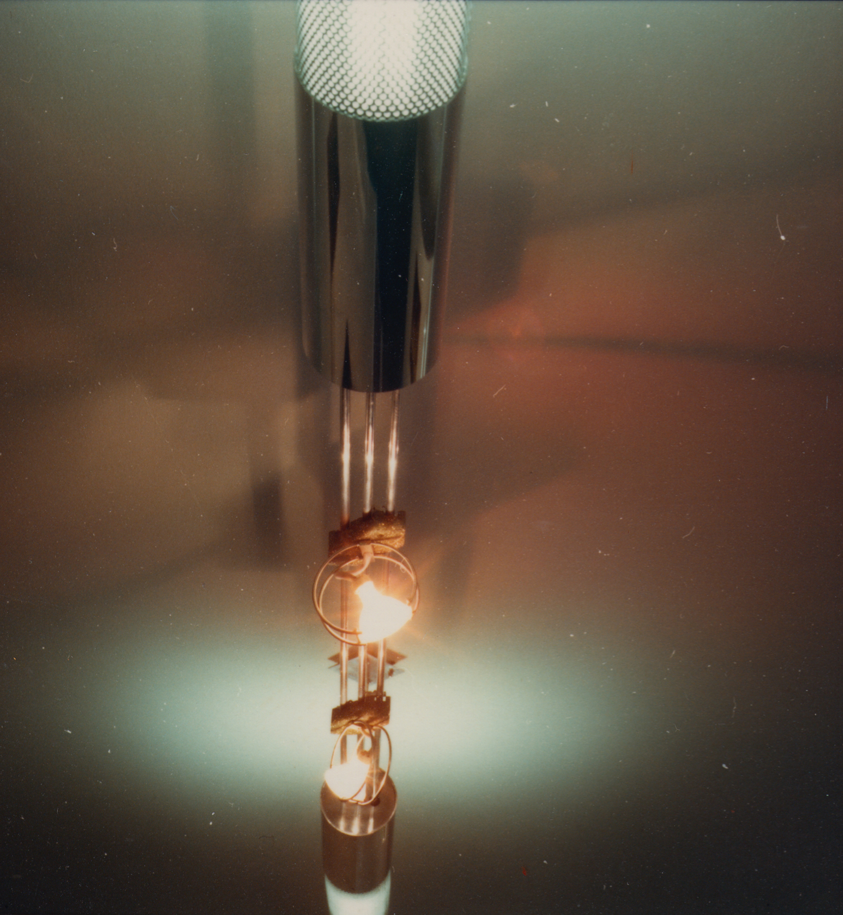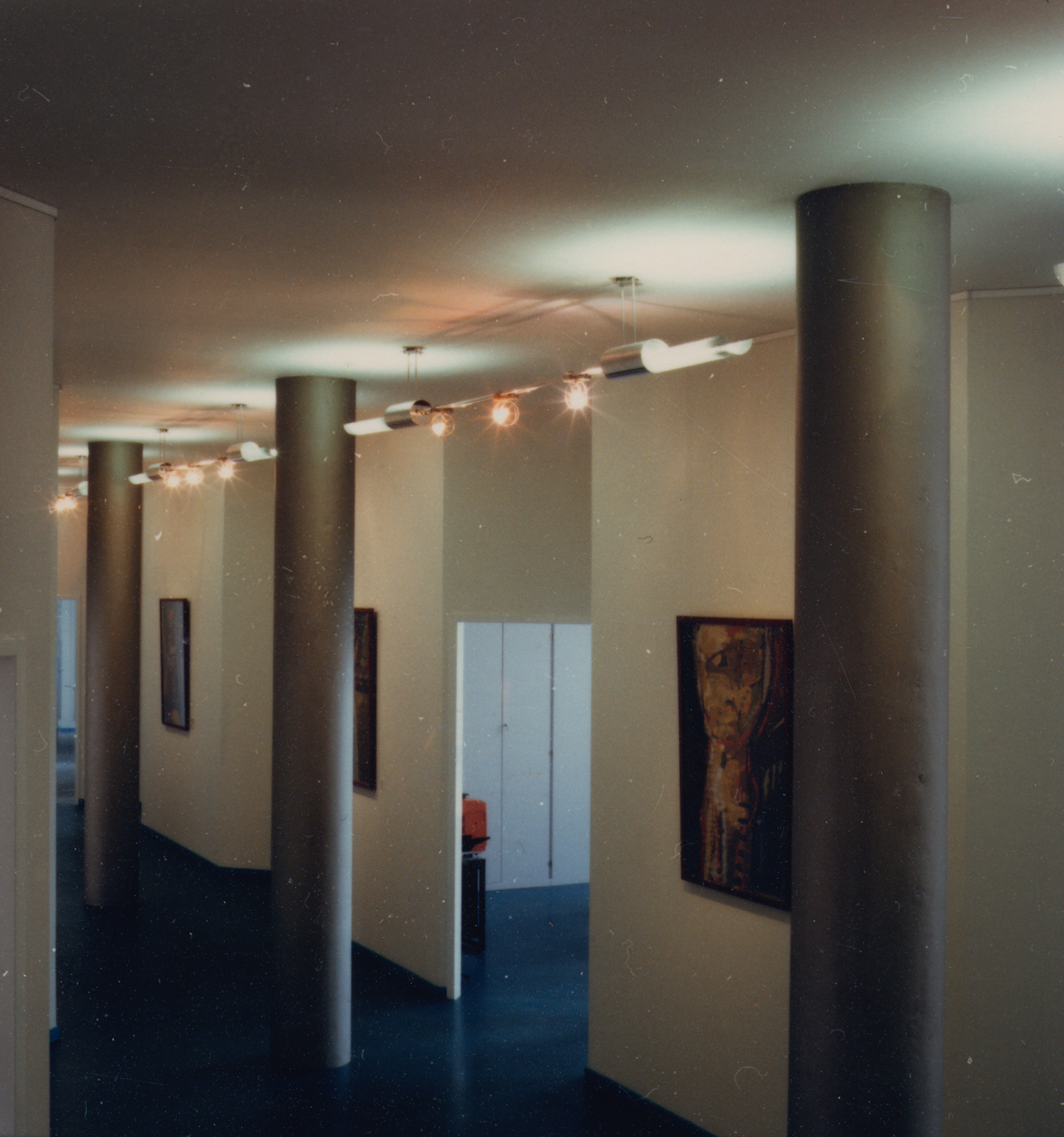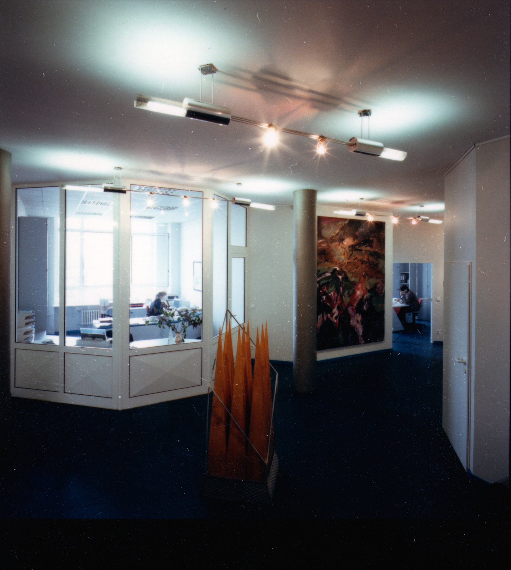 Der mehrfach gebaute Leuchtentyp passte ideal in die repräsentativen Geschäftsräume der Firma Krause. Die Grundelemente bestehen aus einseitig gesockelten Kompaktleuchtstofflampen, deren Licht sich dank des gebogenen Lochblechs unter der Lampe zur Hälfte über die Decke verteilt. Die Ganzaluminium-Leuchte hängt an vier Röhrchen, die zwei horizontale Zylinder halten, in die auf der einen Seite Trafos, auf der anderen Vorschaltgeräte installiert sind. Drei isoliert befestigte Röhrchen halten die Leuchte zusammen, zwei führen Niedervoltspannung für die Halogenlampen und in der dritten verläuft ein Kabel, das den hochvoltigen Strom vom einen Zylinder in den anderen führt.