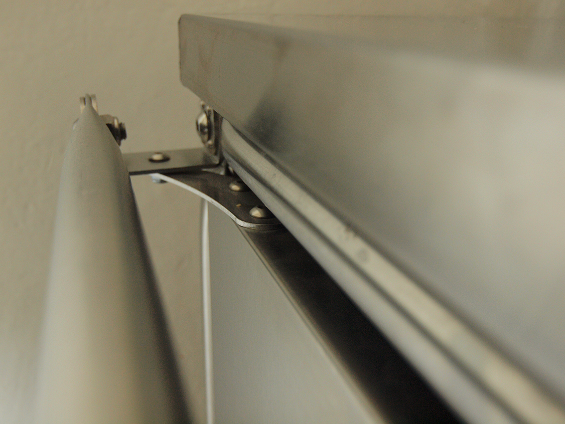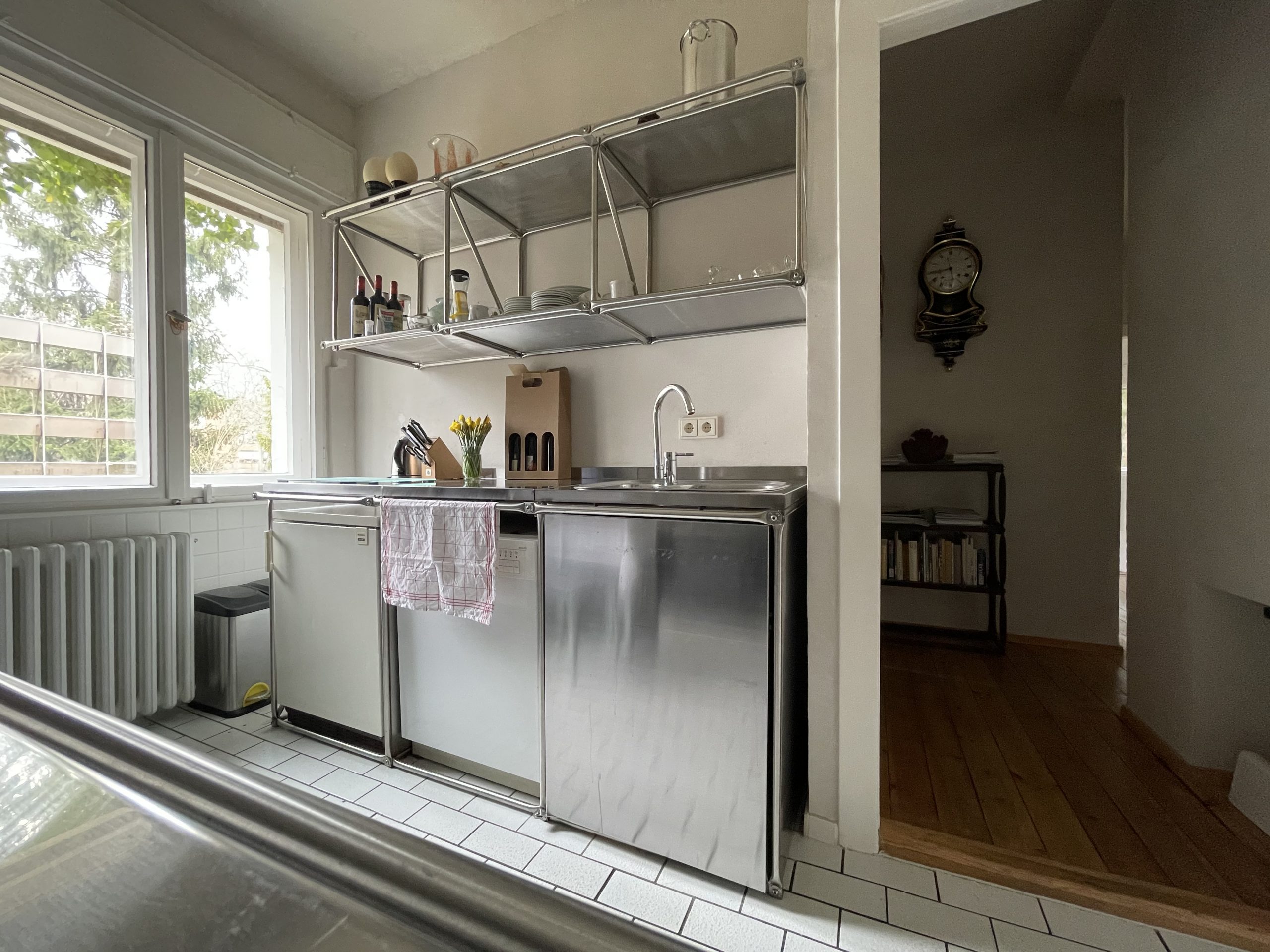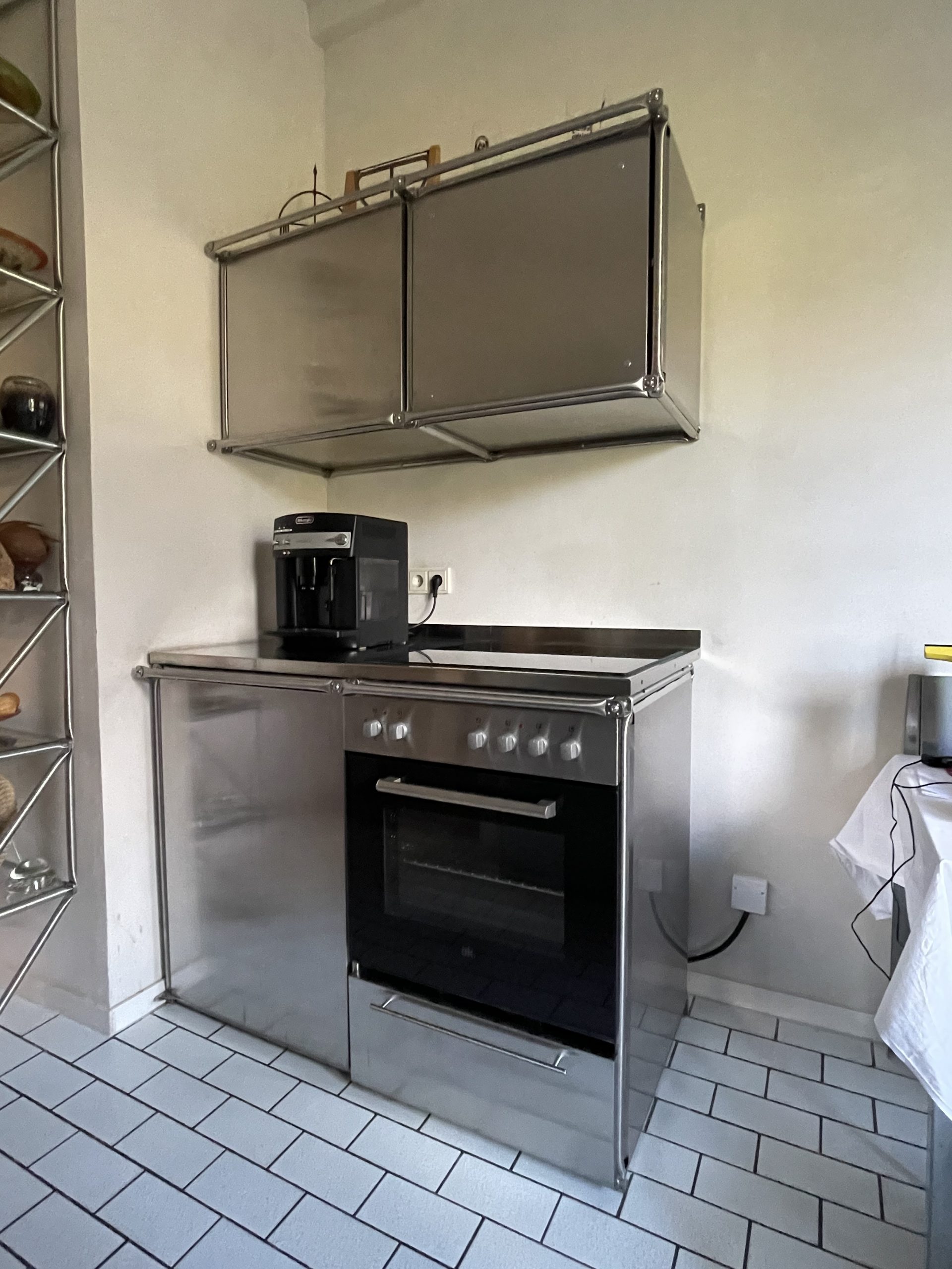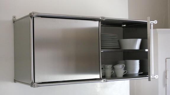 Die Besonderheiten dieses Küchenmöbels liegen in den Edelstahlblech verkleideten Arbeitsflächen sowie in den ebenfalls aus Edelstahlblech hergestellten Schranktüren. Bei der Konstruktion der Schranktüren wurden nicht die standardmässigen, industriell gefertigten Türscharniere verwendet, sondern eigens für diese Küchenmodule entwickelte aussenliegende Scharniere.